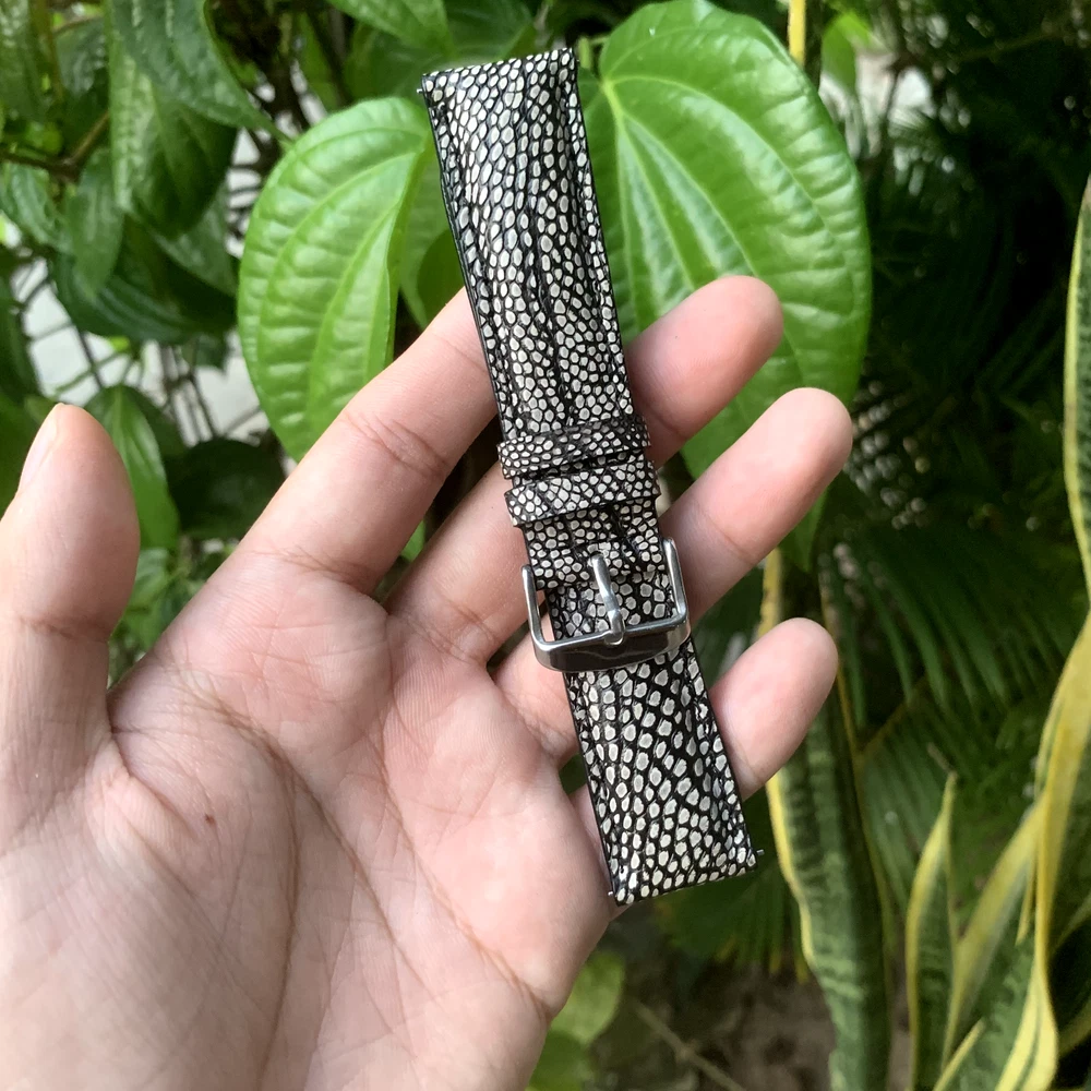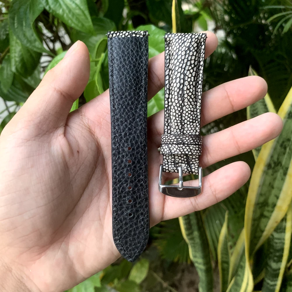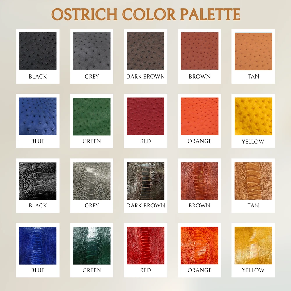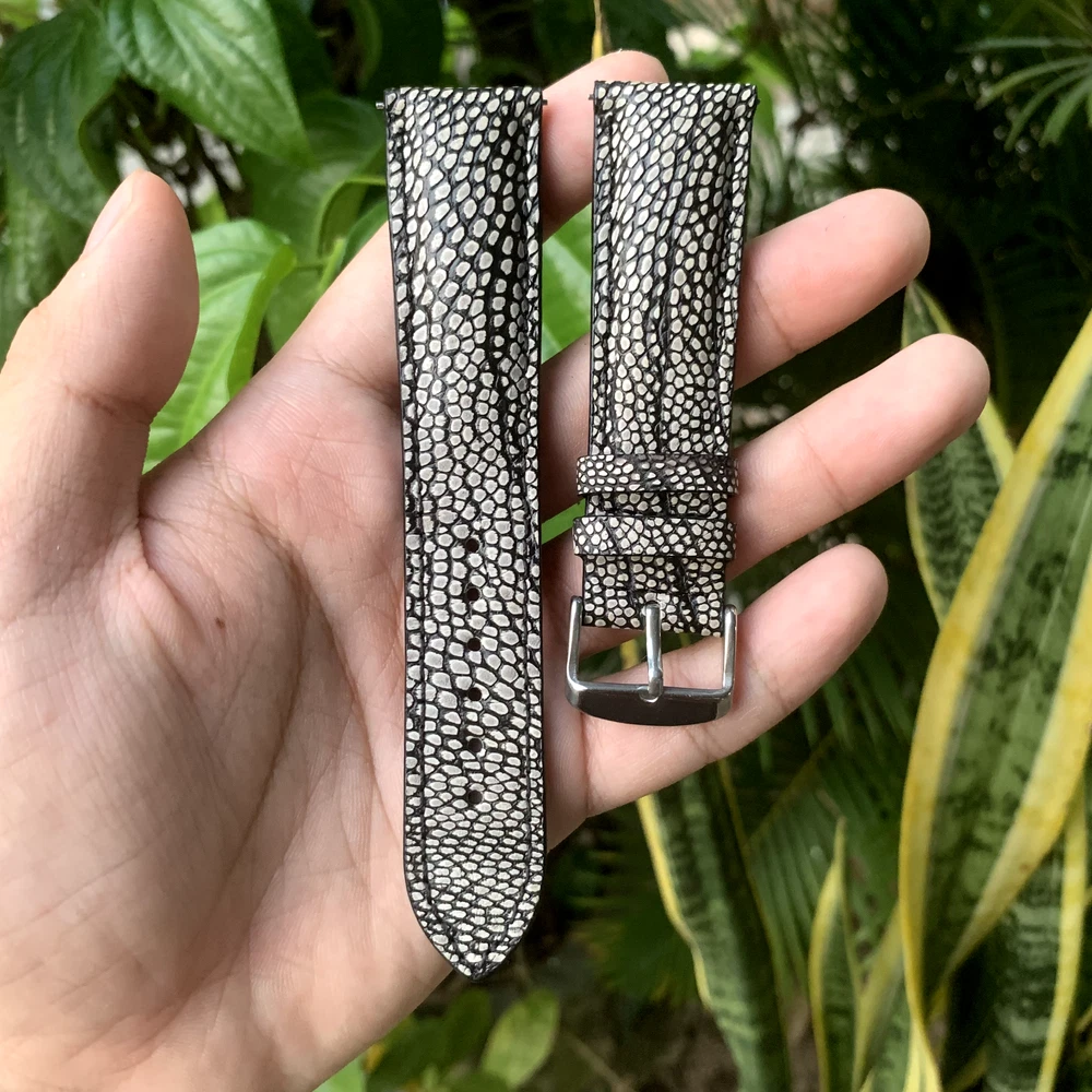 Material: Front: Genuine Nubuck Ostrich leather Back: Italian cow leather Measurement: Size: 16mm, 18mm, 19mm, 20mm, 21mm, 22mm, 24mm Strap length: 125mm x 75mm Strap thickness: 5mm – 2.2mm Buckle: Stainless steel buckle included Feature : Quick-release spring bars