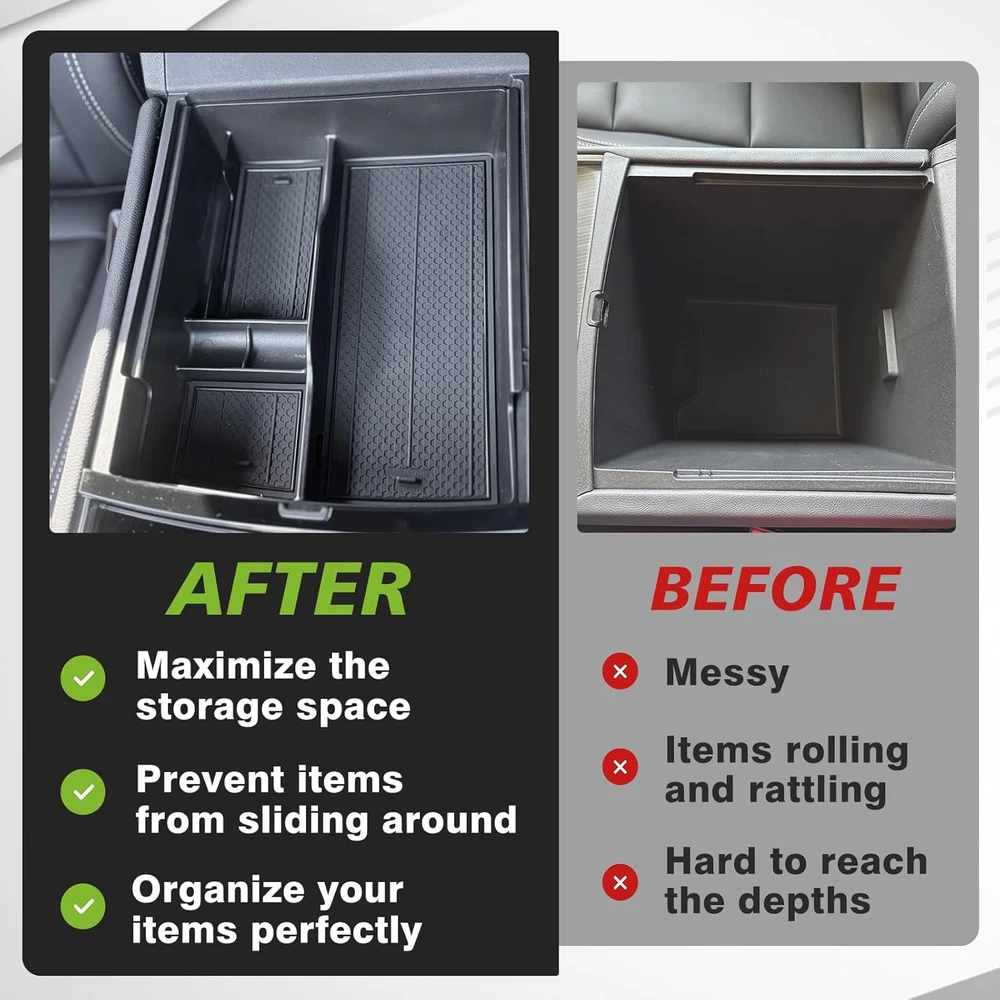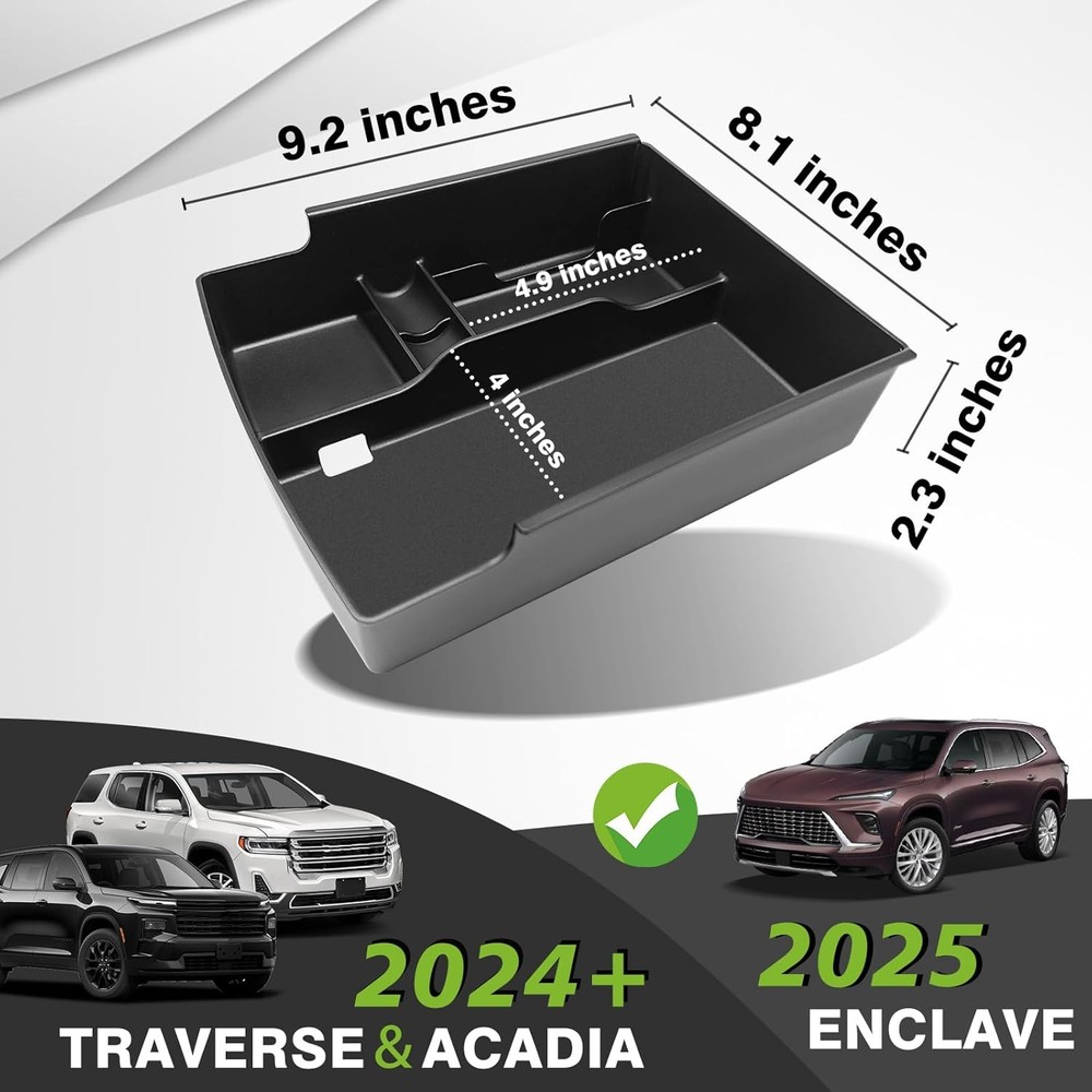 About this item Perfect Fitment: Designed according to the 3D laser scan data to guarantee it fits your 2024 2025 GMC Acadia, Chevy Traverse and 2025 Buick Enclave perfectly. High-Quality Material: Our storage tray is made of premium ABS material, which is durable, non-deforming, and wear-resistant. Comes with insert mats made of premium PVC material to make it odorless and waterproof. Function: Upgrade your storage space. Compartmental design helps to keep your items organized neatly. Provide a perfect way to store your daily items while creating hidden storage space underneath. Won't affect the console lid closing and opening. The default insert mats fit in each compartment and make it easy to clean and prevent your items from rattling. Easy to install: No tools needed. Simply place it in the center console. Easy to install and remove. Package Dimensions: 9.5 x 8.5 x 2.3 inches.