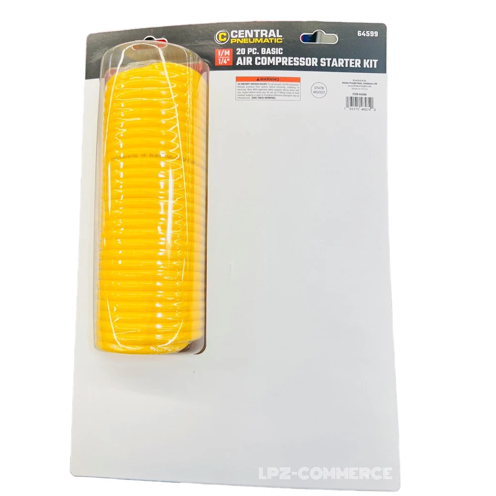 Central Pneumatic 20-Piece Air Compressor Starter Kit w/ Hose, Blow Gun ▪️Get the most out of your air compressor with a set of 20 air compressor accessories. The set includes a blow gun, adapter with three nozzles, inflation needles, tire chuck and more, plus a 1/4 in. x 25 ft. polyethylene air hose with a working pressure of up to 130 PSI. ▪️1/4 in. x 25 ft. polyethylene air hose, 130 PSI working pressure ▪️Adapter with three nozzles ▪️Two inflation needles ▪️Tire chuck ▪️Tire gauge ~•~ ~•~ ~•~ ~•~ ~•~ ~•~ ~•~ ~•~ ~•~ ~•~ ~ ~•~•~ ~•~ ***FAST SHIPPING ***🚀