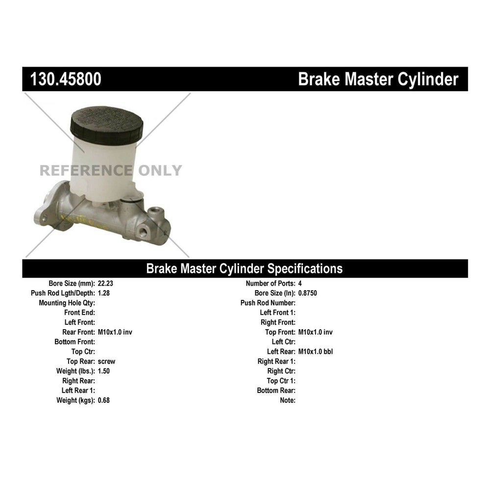 Centric Parts 130.45800 Centric Premium Brake Master Cylinder For 90-97 Miata Centric Parts 130.45800 Match O.E. Parts In Quality; Configuration And Fitment. Complete With Reservoirs; Switches And Floats. Original Aluminum Casting Body Design Where Applicable. Manufactured Under The Highest Quality Standards By Oem And Oes Manufacturers Brake Master Cylinder FEATURES: Match O.E. parts in quality; configuration and fitment. Complete with reservoirs; switches and floats. Original aluminum casting body design where applicable. Manufactured under the highest quality standards by OEM and OES manufacturers SPECIFICATIONS: Bleeder Hoses Included: No Bore Size: 22.225 MM Bore Type: Straight Brake Booster Included: No Master Cylinder Bore Diameter: 22.225 MM Master Cylinder Cap Included: Yes Master Cylinder Material: Aluminum Mounting Bracket Included: No Mounting Hardware Included: No Mounting Hole Quantity: 2 Port Quantity: 3 Primary Bore Diameter: 22.225 MM Primary Outlet Flare Type: Bubble Primary Outlet Thread Diameter: 10.000 MM Primary Outlet Thread Pitch: 1.00 MM Primary Outlet Thread Size: M10-1.00 Push Rod Included: No Reservoir Included: Yes Reservoir Material: Plastic Reservoir Style: Removable Reservoir Type: Single Secondary Outlet Flare Type: Inverted Secondary Outlet Thread Diameter: 10.000 MM Secondary Outlet Thread Pitch: 1.00 MM Secondary Outlet Thread Size: M10-1.00 The Centric Parts brake hydraulic program is the most complete and up-to-date in the industry and includes Brake Master and Wheel Cylinders; Brake Hoses; Caliper And Wheel Cylinder Repair Kits And Remanufactured Power Boosters. Centric Parts Brake Master Cylinders match original equipment parts in quality; configuration and fitment. Cylinders are complete with reservoirs; switches; and floats and are offered with the original aluminum casting body design where applicable. Fits what vehicles: 1990-1997 Mazda Miata We carry performance and replacement parts, along with every consumer item you’ll ever need. Take advantage of our huge distribution network in the United States and Canada, we're able to ship direct to you, so we can get your order into your hands faster than the competition. Our goal is to exceed your expectations. And we’ve built a system to do just that. Our company combines hard-core drag racers and auto enthusiasts with tech-savvy engineers and developers — all car lovers — to create a webstore that gives you an unmatched shopping experience — and we deliver it fast. Very fast. Unlike traditional brick-and-mortar retail outlets, our inventory isn’t limited to what we can pack into a storefront or what a counter clerk may be able to find. While they can only offer you hundreds of items, you’re just a few clicks away from millions of parts when you shop PartsHawk — all in stock and ready to ship. And since we don’t own any of those expensive stores, we can offer our parts for less, and that saves you money on every part, every day. A better shopping experience, for every product for every car, whenever you order. SHIPPING POLICY 99% of orders placed by 2pm Eastern Standard time will be shipped same day All orders are immediately sent to our distribution centers which may impact your ability to cancel the order once it's placed Many parts are stocked in more than one warehouse location. As a result your order may ship from a location other than the location shown in the listing. In most cases the shipping location will be closer to delivery address as we always try to ship from the closest warehouse to minimize transit times. In some circumstances intraday sales and other inventory changes may result in your item being shipped from a location further from your delivery address. Orders over $200.00 may be shipped signature required at no additional cost to you. We recommend shipping to a location where someone will be there to receive the package RETURN POLICY PartsHawk stands behind every item we sell. Occasionally, there may be an issue with your item or your order and we will do our best to ensure you are 100% satisfied. We offer a 30 day exchange or refund policy on all orders. Within 30 days or receipt of your order you may request a return for either an exchange or a refund. All product returns must be in the original packaging, have not been used, installed or damaged due to improper installation. All parts, hardware, documents and instructions must be included in the returns. PartsHawk will also support the manufacture’s warranty for all item during the warranty period offered by the manufacturer. Carriers and Ship Methods : We ship most packages to the contiguous 48 states using USPS, UPS or FedEx. Upon shipping we determine the closest distribution center to you and the quickest method. Note : We do not accept returns for Car Computers, Performance tuners or Vehicle Programmers. If the product is defective we will exchange the unit for the exact item. No new returns on these products. Large Parcel Items : For large items (bumpers, side steps, bed covers, etc.), these may be shipped through a truck delivery service. If you are having issues tracking your package please contact us so we can assist you. Return Check List Original packaging PartsHawk RMA (return merchandise authorization) form All accessories & hardware Any documents and instructions GLOBAL SHIPPING PROGRAM How does shipping work? Placing an order outside the US is easy! In fact, eBay handles the entire transaction for you once we have shipped the product to their warehouse in Kentucky. Once the order has shipped you will receive a tracking number from our warehouse to Kentucky and then another tracking number from Kentucky to you. Additional Charges and Fees Additional shipping, duties and taxes will be calculated by eBay during check out. Outside the US? Don't worry, PartsHawk is currently shipping to over 100 countries Check the Shipping and Payments section above to see if this item can be shipped to you. Wh