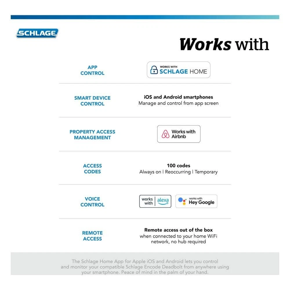 Century Aged Bronze Electronic Encode Smart WiFi Deadbolt with Alarm Electronic Deadbolts Manage with Schlage Home app; Works with Alexa and Google Home Built-in WiFi for remote access; no smart home hub required AAA highest BHMA rating and 3 year electronic warranty The Schlage Encode Smart WiFi Deadbolt offers peace of mind from anywhere by allowing you to remotely manage your lock via the Schlage Home app. Seamlessly control and monitor your home from anywhere when connected to your home??s WiFi network and paired with the Schlage Home app, no additional accessories needed. Conveniently schedule up to 100 access codes for keyless entry, view lock history, receive push notifications, pair with Amazon Alexa and Google Assistant for hands-free control,... Urintelligentbi Hello, respected customer Century Aged Bronze Electronic Encode Smart WiFi Deadbolt with Alarm Century Aged Bronze Electronic Encode Smart WiFi Deadbolt with Alarm Electronic Deadbolts Manage with Schlage Home app; Works with Alexa and Google Home Built-in WiFi for remote access; no smart home hub required AAA highest BHMA rating and 3 year electronic warranty The Schlage Encode Smart WiFi Deadbolt offers peace of mind from anywhere by allowing you to remotely manage your lock via the Schlage Home app. Seamlessly control and monitor your home from anywhere when connected to your home??s WiFi network and paired with the Schlage Home app, no additional accessories needed. Conveniently schedule up to 100 access codes for keyless entry, view lock history, receive push notifications, pair with Amazon Alexa and Google Assistant for hands-free control, and so much more. This innovative smart lock is available in a variety of styles and finishes that pair perfectly with Schlage interior door hardware, creating a cohesive look throughout the home. The Schlage Encode Smart WiFi Deadbolt offers the advanced features of secure encryption and built-in alarm technology. It is certified highest in Security, Durability, and Finish by BHMA industry experts and backed by a century of trusted innovation and security from Schlage. ANYWHERE ACCESS: With built-in WiFi compatibility, you can easily and securely connect your Schlage Encode Deadbolt to your home WiFi network to control and monitor your home from anywhere with the Schlage Home app PEACE OF MIND: Lock and unlock from anywhere, manage up to 100 access codes for keyless entry, view lock history, receive customizable notifications and easily manage multiple locks at once - all when paired to the Schlage Home app and connected to a secure WiFi network VOICE CONTROL: Works with Amazon Alexa and Google Assistant for optional, hands-free convenience when paired with the Schlage Home app and a voice enabled device ADVANCED SECURITY: Secure, encrypted connection; built-in, customizable alarm for door movement and forced entry attempts; fingerprint-resistant touchscreen; certified highest residential Security, Durability and Finish rating by BHMA industry experts EASY INSTALL: Install in minutes with just a screwdriver, no hardwiring required; Snap 'n Stay design helps keep the lock on the door so both hands are free; fits standard doors with 1-3/8 in to 1-3/4 in door thickness and 2-3/8 in or 2-3/4 in backset COME AND GO WITH EASE: Auto-lock conveniently relocks the door for you and has a variety of time delay options to choose from or can be turned off completely; One-touch locking from the exterior touchscreen makes locking up when leaving easy BATTERY-OPERATED: Uses four AA batteries-included; up to six months of battery life with typical use; low-battery indicator on lock touchscreen and in Schlage Home app provides advance notice; one physical backup key included WARRANTY: Limited lifetime mechanical and finish warranty and 3-year electronics warranty, see Schlage for full details Click here to shop all Schlage products Click here for more Schlage Door Hardware products Click here for more information on Electronic Recycling Programs Item Specifics Brand Schlage Type Animal Barriers length width height weight 3 lb Payment [ 1. We accept Paypal. Each buyer's payments is protected by Ebay. 2. Payment time affects delivery time. 3. If you want more quantities or other models , please contact us! ] Shipping [ 1.Processing time It normally takes 3 business days. We will confirm in time after receiving the payment from the buyer, verify the address of buyer then deliver the item according to the buyer's order time. 2.Shipping time We ship to eBay's address only,please ensure your address in eBay. We ship to all parts of the world, but we are sorry that we do not support the Russian Federation and Ukraine for the time being. There may be some delay due to flight, National holiday, weather, local natural disaster impact, etc, hope you can be patient and contact us freely, we will try our best to help you. ] Returns [ 1. We gu arantee to provide you with a five-star shopping experience, and provide return& refund services for buyers. If you are not satisfied when you receive the items, please contact us within 30 days for return and refund. (Buyer pays return shipping) 2. Please don't open case via ebay or paypal. 3. For order questions please contact us via the Ebay Message System. We are willing to answer your questions and we will provide you the best soloution within 24 hours. Please understand that we are not in the office on Saturday and Sunday, so the questions asked over the weekend will be answered on the following Monday. 4. We sincerely invite you to leave a fair feedback after completing the transaction. If you are satisfied with our service, please rate us. Your valuable feedback and comments are very important to us. ] Contact Us If you are not satisfied when you receive the items, please contact us within 30 days for return and refund. (Buyer pays return shipping) Urintelligentbi Hello, respected customer DESCRIPTION PAYMENT SHIPPING RETURN POLICY CONTACT US Shop Category Store 
