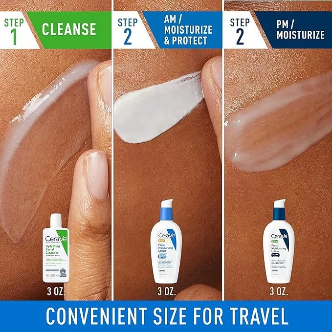 CeraVe AM Face Moisturizer with SPF, PM Face Moisturizer & Hydrating Face Wash Skin Care Routine for Morning & Night | Travel Size Toiletries | 3oz Lotion + 3oz Lotion + 3oz Cleanser OIL FREE DAY CREAM & NIGHT CREAM & HYDRATING FACE WASH FOR TRAVEL ] Contains a full size 3oz CeraVe AM Facial Moisturizing Lotion with SPF 30, a full size 3oz CeraVe PM Facial Moisturizing Lotion, and a 3oz CeraVe Hydrating Facial Cleanser [ SUNSCREEN & NIGHT CREAM WITH HYALURONIC ACID & NIACINAMIDE ] Cerave AM & PM face cream contains niacinamide to help calm the skin & hyaluronic acid to help retain skin's moisture. They use MVE Technology to deliver hydration throughout the day & night [ DAILY FACE WASH ] Gentle cleansing lotion with hyaluronic acid, ceramides, and glycerin to help hydrate skin without stripping moisture. Removes face makeup, dirt, and excess oil, provides 24-hour hydration and leaves a moisturized, non-greasy feel [ 3 ESSENTIAL CERAMIDES ] Ceramides are found naturally in the skin and make up 50% of the lipids in the skin barrier. All CeraVe products, formulated with three essential ceramides (1, 3, 6-II)to help maintain the skin’s natural barrier. [ DEVELOPED WITH DERMATOLOGISTS ] CeraVe Skincare is developed with dermatologists and has products suitable for dry skin, sensitive skin, oily skin, acne-prone, and more.