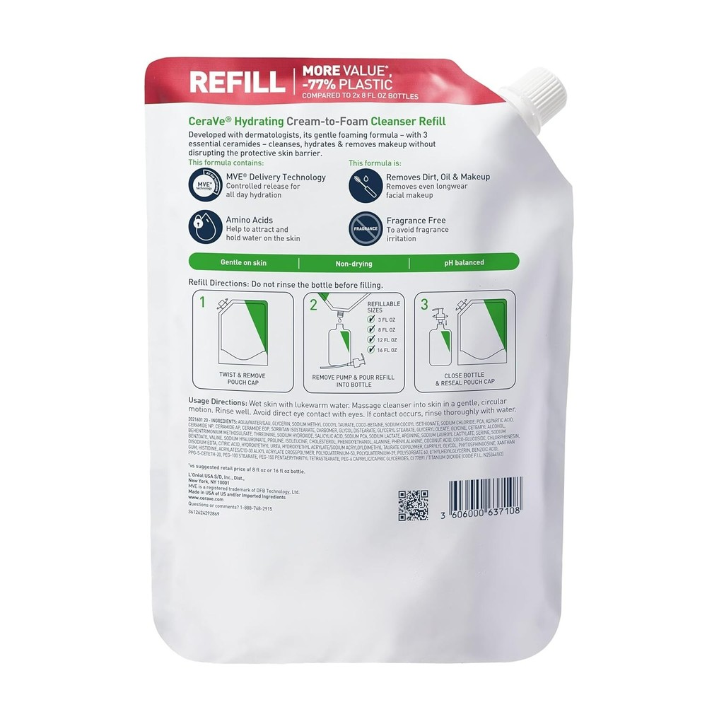 CeraVe Hydrating Cream To Foam Cleanser, Makeup Remover Face Wash For Dry Skin, Foaming Facial Cleanser With Hyaluronic Acid, Normal To Dry Skin, Fragrance Free & Non Comedogenic, 16 Ounce Refill [ ALL-IN-ONE DAILY FACIAL CLEANSER ] One-step skin care, foaming face wash for face & eye makeup removal while providing long-lasting hydration. Foaming cleanser gently removes dirt, excess oil, and even long-wear makeup and sunscreen residue. Now available in a refill format. [ CREAM TO FOAM HYDRATING CLEANSER ] Moisturizing face wash dispenses as a rich cream and transforms into a foam as you lather into skin. Non-drying formula, thoroughly cleanses without stripping skin of moisture or leaving a tight, dry feeling. [ DRY SKIN FACE WASH ] Gentle face wash formulated with hyaluronic acid and amino acids to support skin's Natural Moisturizing Factors (NMF) to retain moisture. Hydrating face wash suitable for normal to dry skin. [ 3 ESSENTIAL CERAMIDES ] Ceramides are found naturally in the skin and make up 50% of the lipids in the skin barrier. All CeraVe products, formulated with three essential ceramides (1, 3, 6-II)to help maintain the skin’s natural barrier. [ DEVELOPED WITH DERMATOLOGISTS & #1 DERMATOLOGIST RECOMMENDED SKINCARE BRAND ] CeraVe Skincare is developed with dermatologists and has products suitable for dry skin, sensitive skin, oily skin, acne-prone, and more.