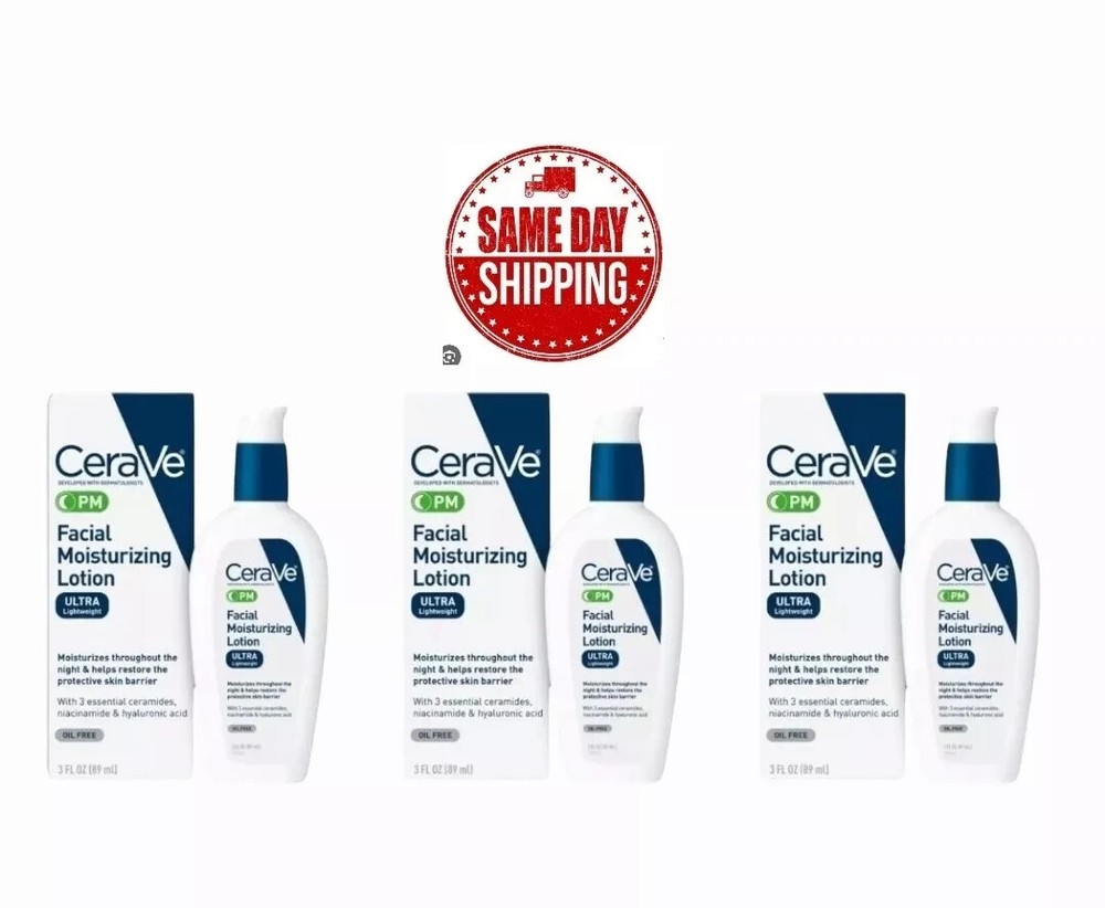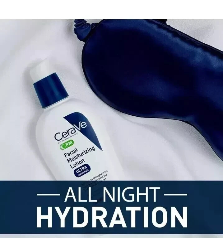 CeraVe Facial Moisturizing Lotion PM Ultra Lightweight 3 oz Original. OIL FREE NIGHT LOTION ] Use Cerave PM facial lotion as the last step in an evening skincare routine. If layering with an eye cream, moisturizer or facial serum, apply the Cerave night lotion after other product applications have been fully absorbed OVERNIGHT MOISTURIZER ] Cerave’s PM face cream contains niacinamide to help calm the skin and uses MVE Technology to deliver hydration throughout the night. It also contains hyaluronic acid to help retain skin's moisture GENTLE ON SKIN ] Fragrance free, paraben-free, oil free, non-comedogenic, and allergy-tested 3 ESSENTIAL CERAMIDES ] Ceramides are found naturally in the skin and make up 50% of the lipids in the skin barrier. All CeraVe products are formulated with three essential ceramides (1, 3, 6-II) to help restore and maintain the skin’s natural barrier DEVELOPED WITH DERMATOLOGISTS ] CeraVe Skincare is developed with dermatologists and has products suitable for dry skin, sensitive skin, oily skin, acne-prone, and more. PM FACIAL MOISTURIZER] With Niacinamide moisturizes throughout the night & helps restore the protective skin barrier HYALURONIC ACID] Helps retain skin's moisture PATENTED TECHNOLOGY] Utilizes patented MVE controlled-release technology to help deliver long-lasting moisturization
