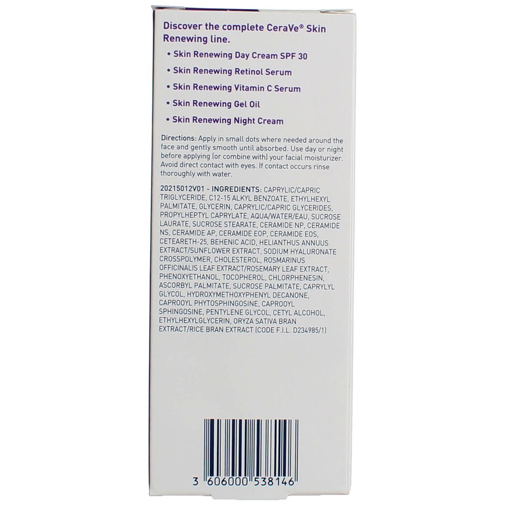 Product Description Developed with dermatologists, CeraVe Skin Renewing Gel Oil and Face Moisturizer helps improve skins radiance and has a moisturizing formula that deeply hydrates skin to instantly improve skin radiance. CeraVe Skin Renewing Gel Oil contains Ceraplex technology, a unique combination of 5-ceramides (1, 3, 6-II, 1A, and w-acyl 1 & 1A) and sunflower blend, to give skin a ceramide boost. Non-comedogenic Fragrance-free Gentle, non-irritating formula -Instantly improves skin radiance -Can be used on its own or with moisturizer -CeraPlex™: A unique blend of five ceramides and sunflower oil -Ceramides: Help restore and maintain the skin’s natural barrier -Non-comedogenic, and fragrance-free -Developed with dermatologists Ingredients Sodium Cocoyl Isethionate, Stearic Acid, Aqua/Water, Sodium Isethionate, Cl 77891/Titanium Dioxide, Cocamidopropyl Hydroxysultaine, Potassium Phosphate, Ceramide NP, Ceramide AP, Ceramide EOP, Carbomer, Glycerin, Cetearyl Alcohol, Ceteareth-20, Dimethicone, Behentrimonium Methosulfate, Sodium Chloride, Sodium Lauroyl Lactylate, Sodium Hyaluronate, Cholesterol, Phenoxyethanol, Disodium EDTA, Dipotassium Phosphate, Tocopherol, Caprylic/Capric Triglyceride, Petrolatum, Phytosphingosine, Xanthan Gum, Ethylene Brassylate, Cetyl Alcohol, Ethylhexylglycerin Instructions -Apply in small dots where needed around the face -Gently smooth until absorbed -Use day or night before applying (or combine with) facial moisturizer Product Description Developed with dermatologists, CeraVe Skin Renewing Gel Oil and Face Moisturizer helps improve skins radiance and has a moisturizing formula that deeply hydrates skin to instantly improve skin radiance. CeraVe Skin Renewing Gel Oil contains Ceraplex technology, a unique combination of 5-ceramides (1, 3, 6-II, 1A, and w-acyl 1 & 1A) and sunflower blend, to give skin a ceramide boost. Non-comedogenic Fragrance-free Gentle, non-irritating formula -Instantly improves skin radiance -Can be used on its own or with moisturizer -CeraPlex‚Ñ¢: A unique blend of five ceramides and sunflower oil -Ceramides: Help restore and maintain the skin‚Äôs natural barrier -Non-comedogenic, and fragrance-free -Developed with dermatologists Ingredients Sodium Cocoyl Isethionate, Stearic Acid, Aqua/Water, Sodium Isethionate, Cl 77891/Titanium Dioxide, Cocamidopropyl Hydroxysultaine, Potassium Phosphate, Ceramide NP, Ceramide AP, Ceramide EOP, Carbomer, Glycerin, Cetearyl Alcohol, Ceteareth-20, Dimethicone, Behentrimonium Methosulfate, Sodium Chloride, Sodium Lauroyl Lactylate, Sodium Hyaluronate, Cholesterol, Phenoxyethanol, Disodium EDTA, Dipotassium Phosphate, Tocopherol, Caprylic/Capric Triglyceride, Petrolatum, Phytosphingosine, Xanthan Gum, Ethylene Brassylate, Cetyl Alcohol, Ethylhexylglycerin Instructions -Apply in small dots where needed around the face -Gently smooth until absorbed -Use day or night before applying (or combine with) facial moisturizer Warnings WARNING: This product contains chemicals known to the State of California to cause cancer andbirth defects or other reproductive harm. Disclaimer The product descriptions and instructions provided by vitabox.com are for informational purposes only and are qualified in their entirety by the information available from manufacturers of the products. You should carefully read all product packaging, and contact the manufacturer with any questions before using a product. While we endeavor to ensure that product descriptions are current, manufacturers sometimes change their products. We are not liable for inaccuracies or misstatements about products. We do not provide medical advice or recommendations. You should not use the information provided by vitabox.com for diagnosing or treating a health problem or disease. If you have or suspect that you have a medical problem, immediately contact your health care provider. Information and statements regarding dietary supplements have not been evaluated by the Food and Drug Administration or any other government agency and are not intended to diagnose, treat, cure, or prevent any disease.