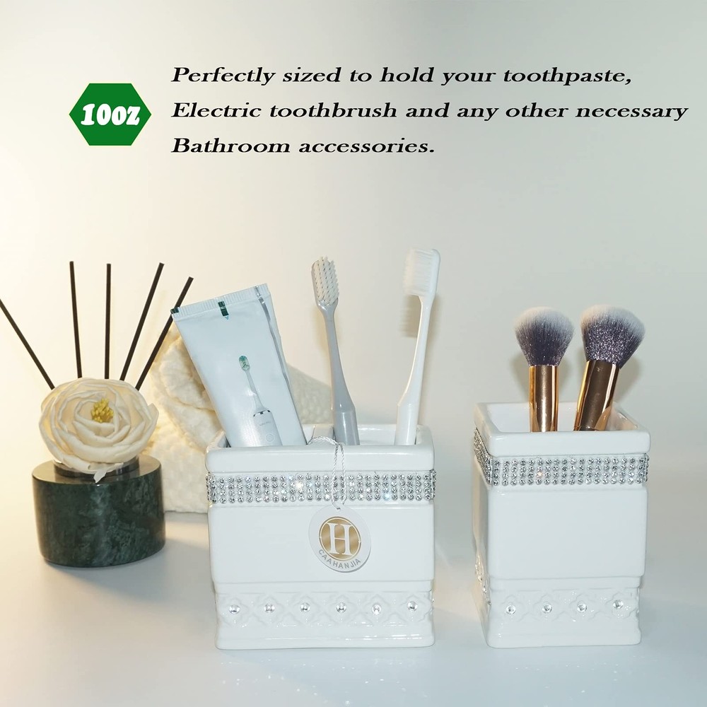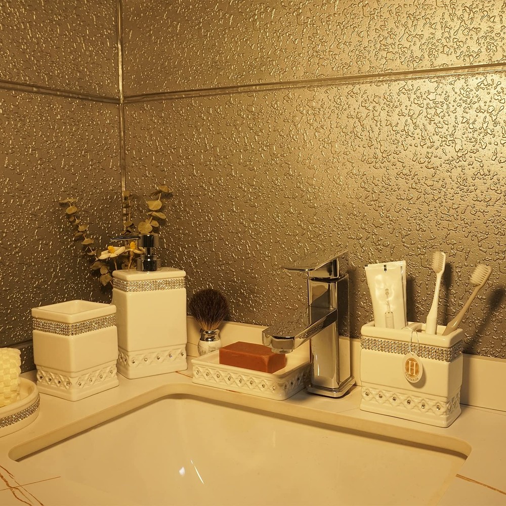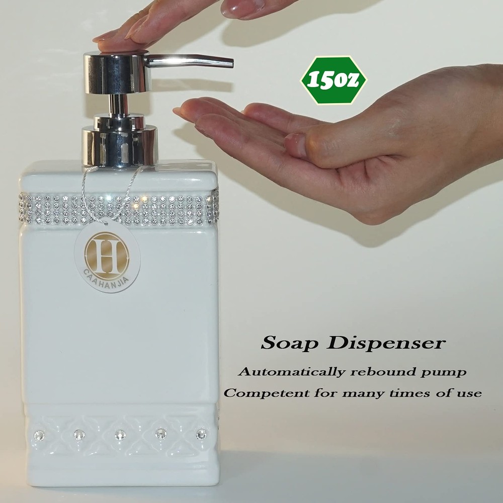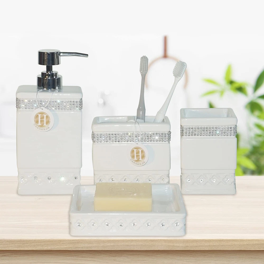 Absolutely love this bathroom set! The ceramic feels high-quality and looks so elegant with the shiny zircon details and silver accents. It instantly upgraded my bathroom, giving it a luxurious vibe. The pieces are sturdy, easy to clean, and fit perfectly on my counter. Great for homes or even as a gift—highly recommend!