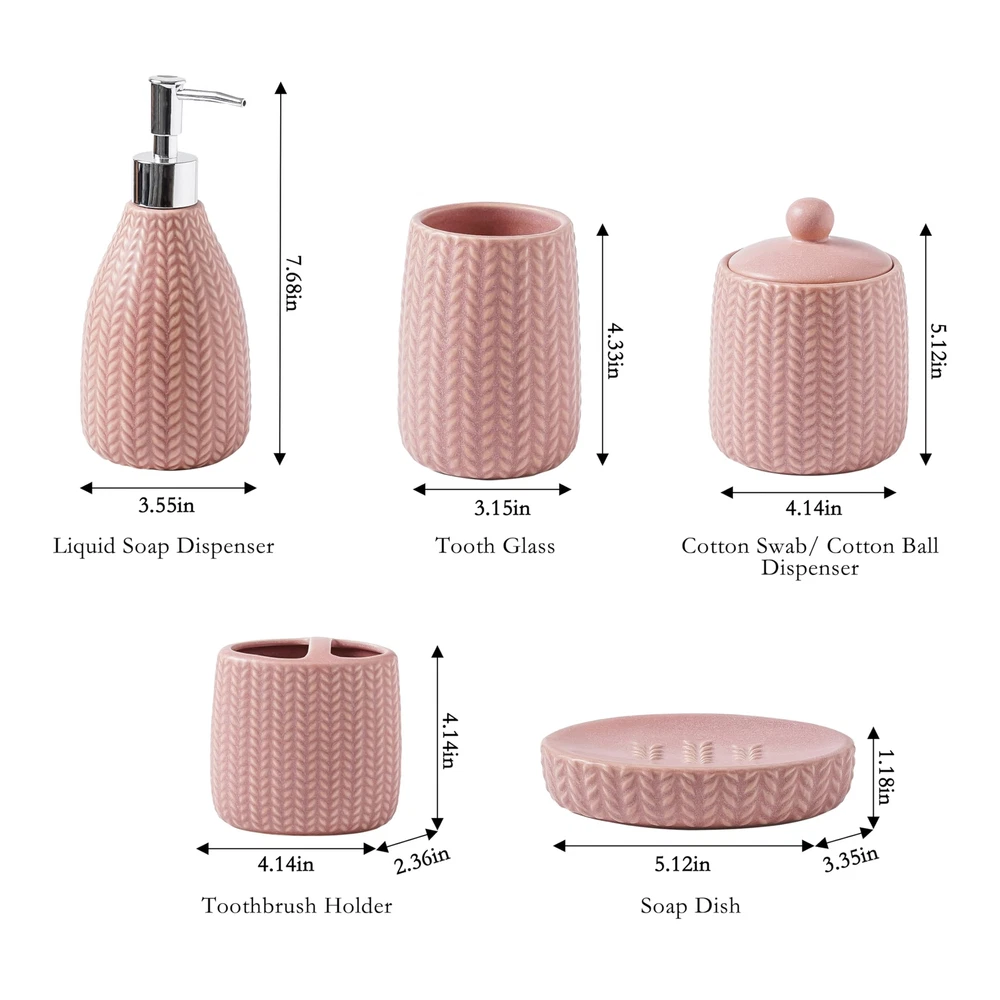 SURUI Luxury Bathroom Sink Set - 5-Piece Soap Dispenser & Toothbrush Holder Set with Cotton Swab Dispenser, Tooth Glass, Soap Dish - Ceramic Bath Accessories Set (Pink) 5-Piece Set for Bathroom Luxury: Enhance your bathroom with this 5-piece ceramic accessory set. Includes a liquid soap dispenser, tooth glass, cotton swab/cotton ball dispenser, toothbrush holder, and soap dish, all designed to add a touch of elegance to your space. Premium Ceramic Material: Made from high-quality ceramics, this set offers a smooth and durable feel. The materials are hard, corrosion-resistant, and scratch-resistant, ensuring long-term use. Sleek Minimalist Design: Featuring wave lines and understated elegance, this set provides a modern look. The smooth surface is easy to clean, with stains and water marks effortlessly washed off. Ideal Gift Choice: Perfect for housewarming, wedding, or holiday gifts, this set combines functionality and aesthetic appeal, making it a thoughtful and practical present. Customer Satisfaction Guarantee: We stand behind the quality of our bathroom accessory set. If you are not satisfied with your purchase, please contact us, and we will promptly assist you. SHIPPING Domestic Buyers - We have confidence in our products, but if you are not fully satisfied please contact us within 30 days of purchase and you will get full refund. - We ship within 3 business days of payment, usually sooner - We offer FREE shipping on all orders! - We only ship to the lower 48 states, no APO/FPO addresses or PO Boxes allowed International buyers – please note: Import duties, taxes, and charges aren't included in the item price or postage cost. These charges are the buyer's responsibility. - Please check with your country's customs office to determine what these additional costs will be prior to bidding or buying. * Order Cancellation Policy ** You can return a product for up to 30 days from the date you purchased it. 1. The seller reserves the right to cancel the special case only due to eBay cancellation fee. 2. The decision of seller is the final. 3. The seller will respond to the cancellation request within 2 business days. Please wait for the result of cancellation. 4. In case the cancellation is not completed by some reasons, the buyer can follow the options below to get the refund. 4.1 The buyer can reject the item when it arrives. 4.2 The buyer can send the item back to the seller within 30 days If the buyer receives item (USA Shipment ONLY). The seller will provide the FREE return label to the buyer when the buyer opens " Return Item" case on eBay by using the reason as "Change my mind" ONLY. 5. When buyer has placed the order. The order will be processed and completed by automatic warehouse system within 5 minutes. In case that buyer sends the cancellation request after 5 minutes of placing the order, the request will be rejected. **Sending direct message to cancel the order is not allowed for every case.* Return Policy For the return case - If buyer would like to return the items for refund or replacement, please CONTACT SELLER to receive the free return label from seller. The refund or replacement will be processed with the tracking number of return label which is provided by seller only. The other ways of return which are not approved by seller will not be processed for the refund or replacement.
