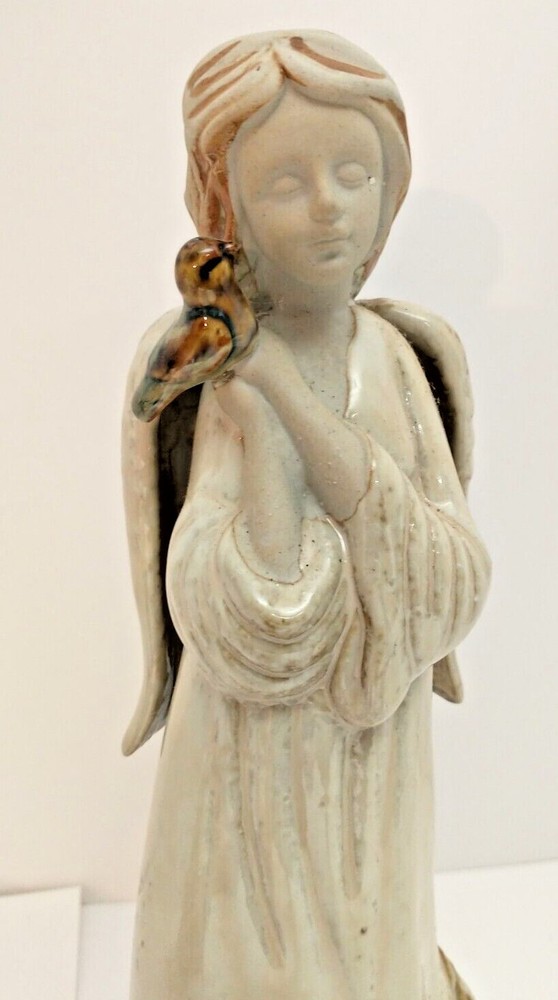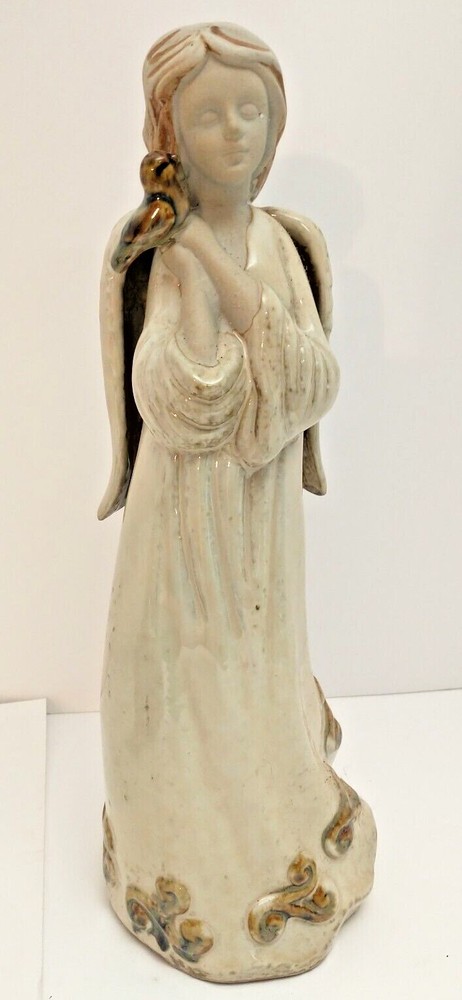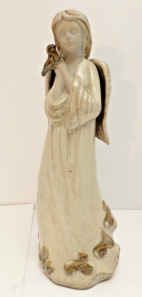 Ceramic Angel Figurine with Bird in Neutral Tones 12.5 Inch Seasonal Decor