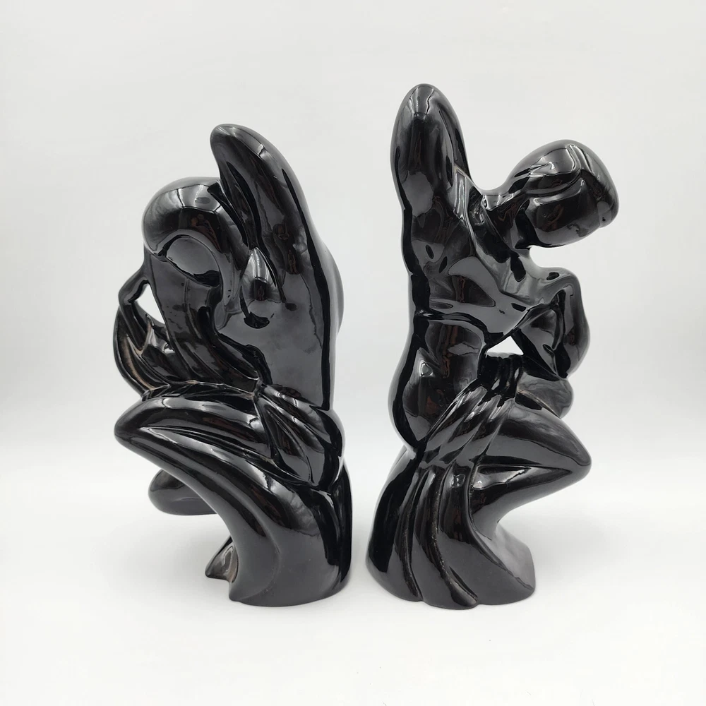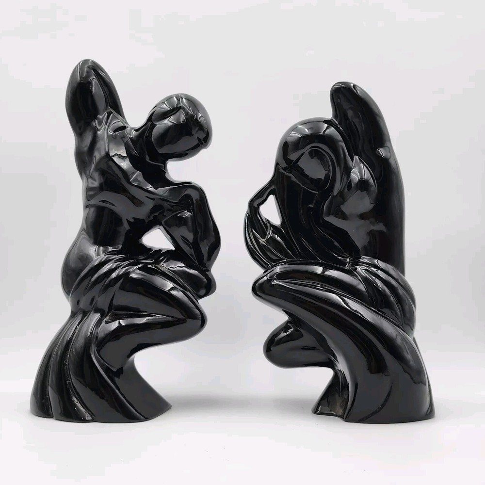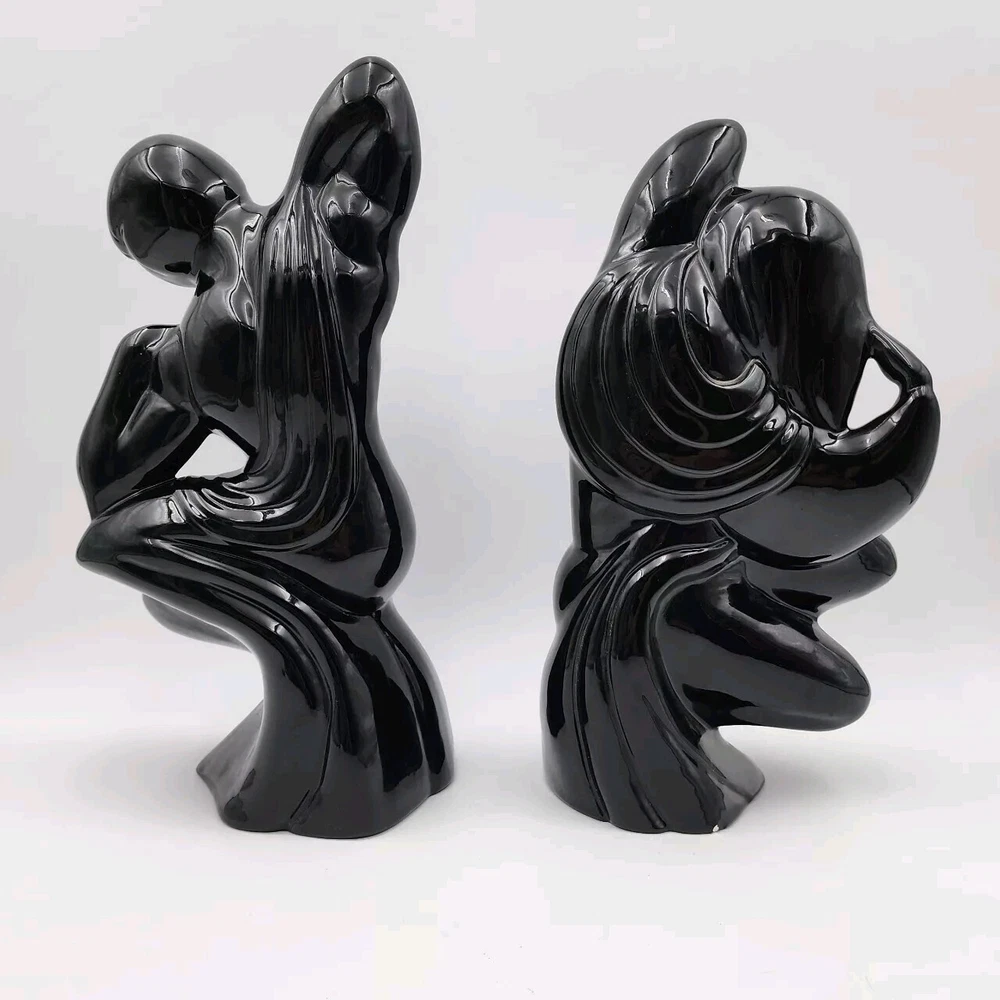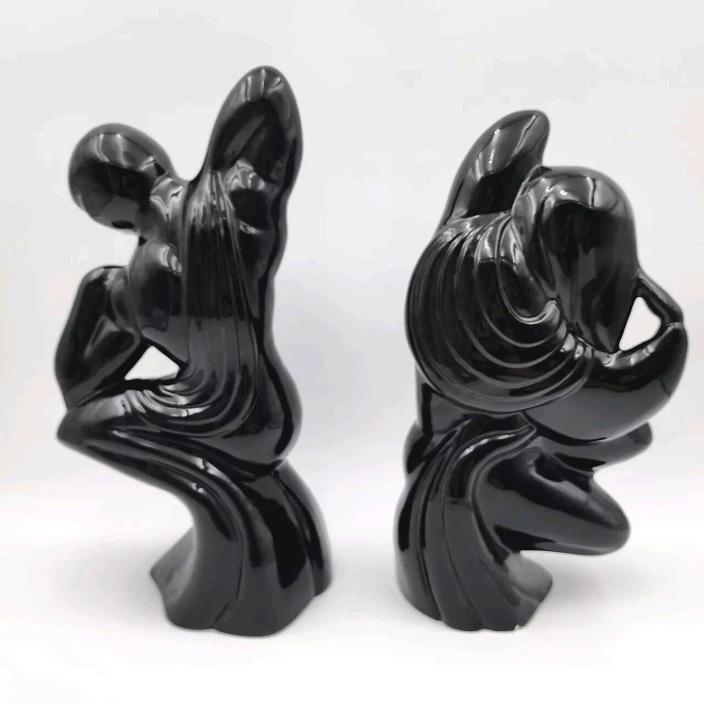 These all black, high-gloss ceramic figural statues are examples of mid-century modern art. They represent a man and a woman, each with their arm raised behind their heads holding a draped cloth. These figures are sculpted in the round so that the draped cloth covers their nudity and can be seen. The use of lines to create ribbon or curtain patterns is indicative of the Art Deco style. These figures are substantial, each measuring 16." in height. The male figure measures 8"Lx5"Wx16.5"H, and the female figure measures 7"Lx6"Wx16"H. This pair would be ideal display pieces in a home or office setting.