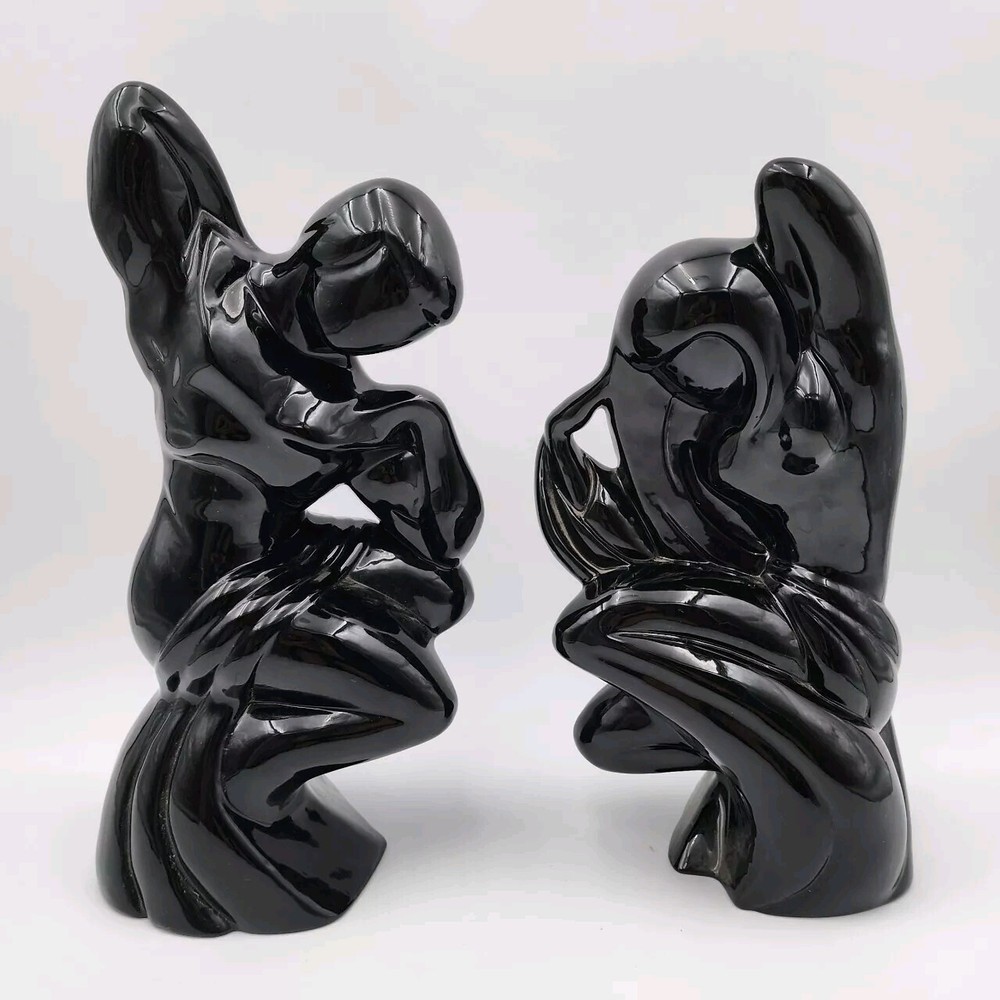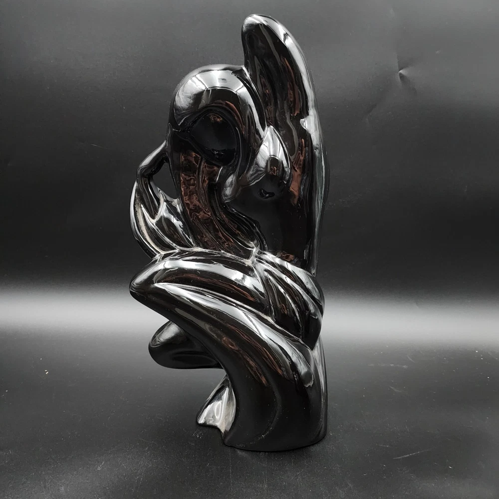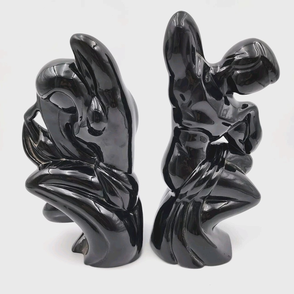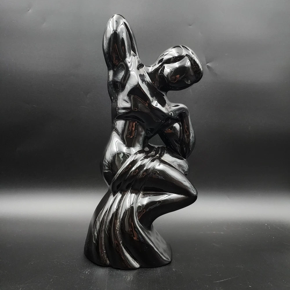 These all black, high-gloss ceramic figural statues are examples of mid-century modern art. They represent a man and a woman, each with their arm raised behind their heads holding a draped cloth. These figures are sculpted in the round so that the draped cloth covers their nudity and can be seen. The use of lines to create ribbon or curtain patterns is indicative of the Art Deco style. These figures are substantial, each measuring 16." in height. The male figure measures 8"Lx5"Wx16.5"H, and the female figure measures 7"Lx6"Wx16"H. This pair would be ideal display pieces in a home or office setting.