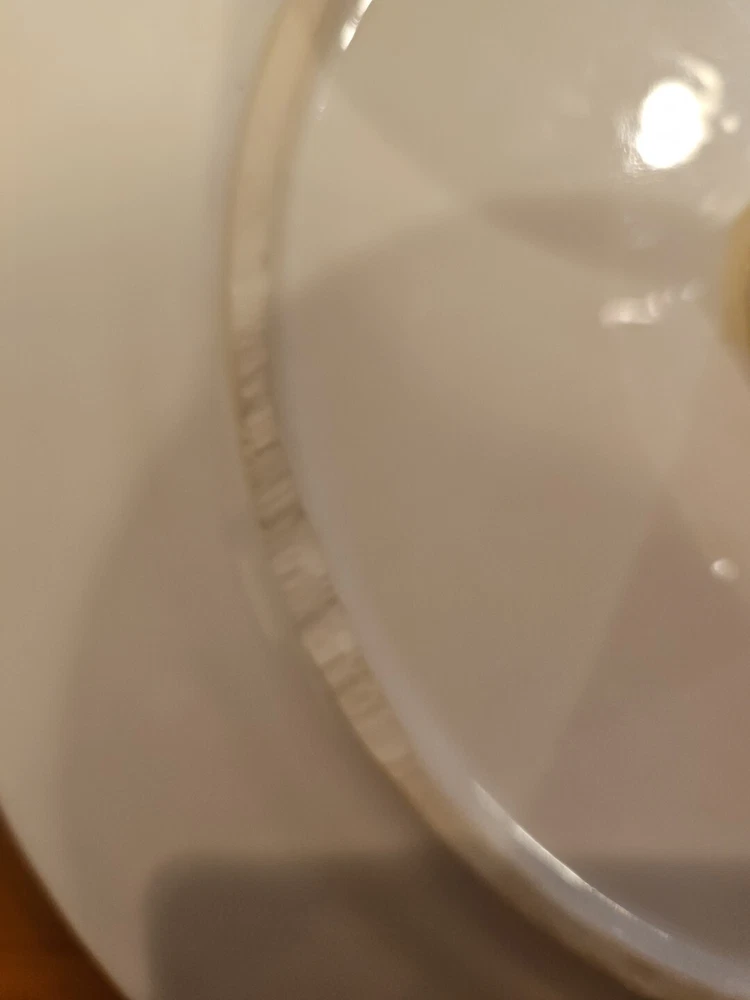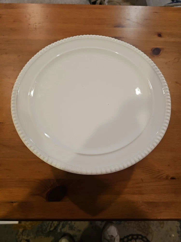 Add a touch of elegance to your dessert table with this beautiful white ceramic cake stand from Ceriart S.A. Made in Portugal, this round stand measures 12 inches in diameter and 4 inches in height, perfect for showcasing your favorite cakes and pastries. The stand features a beaded edge design and is solid in pattern, making it a great addition to any occasion, whether it's a wedding, birthday, or just a regular Sunday afternoon tea. Small chip underneath but does not effect look or use