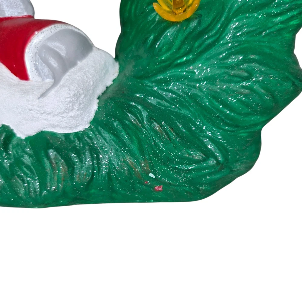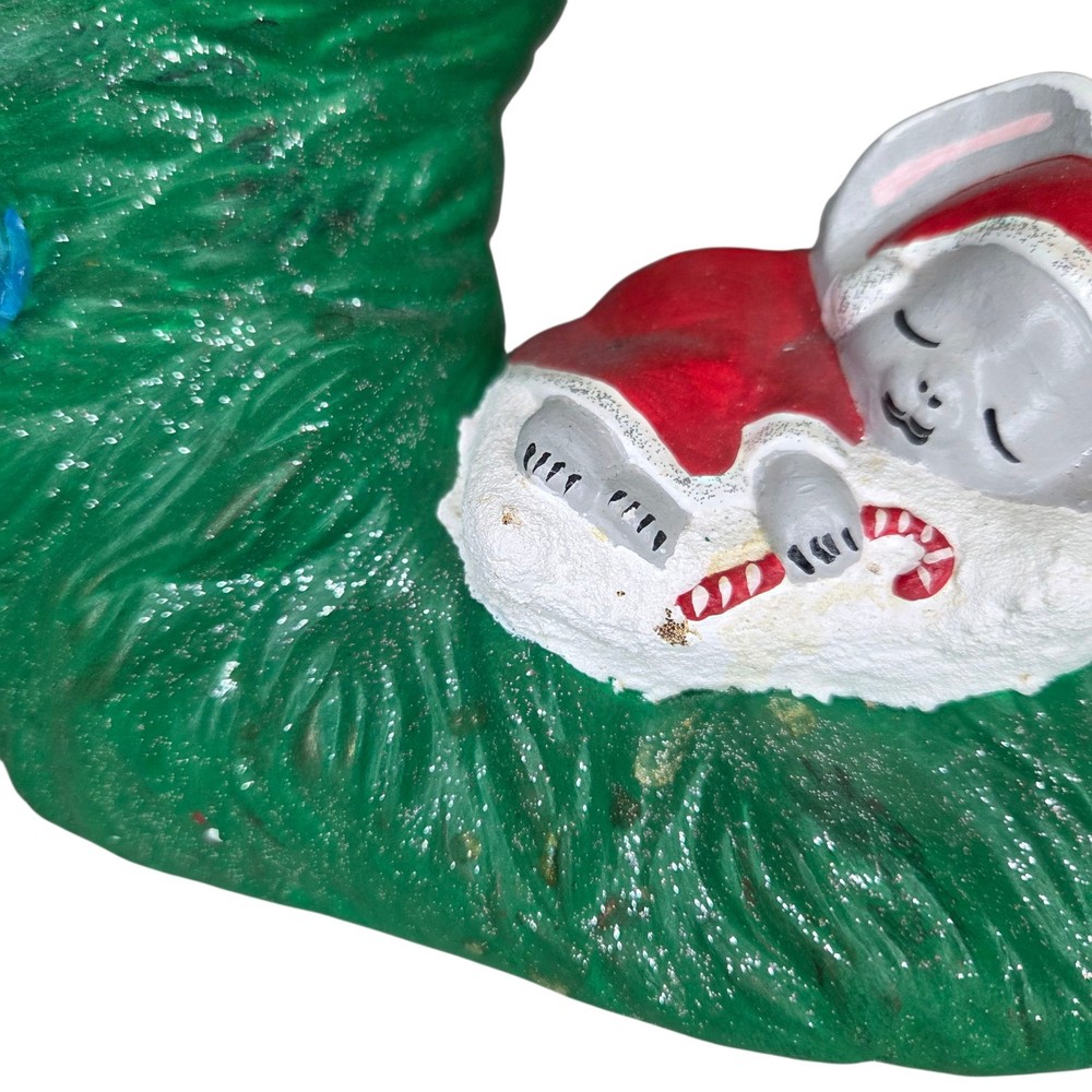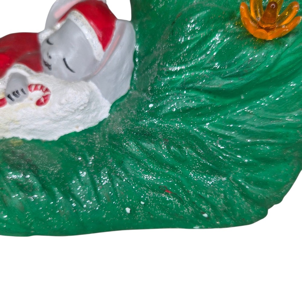 Ceramic Christmas Decoration Mouse Sleeping inside a Wreath . Please take a look at all of the pictures of this item for it's actual condition. A lot of the plastic flowers are broken, one flower is missing but it has like a cone shape plastic. Some chipped paint and some stains. And of course is missing the main light.