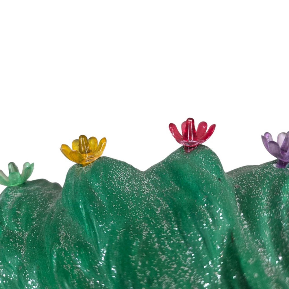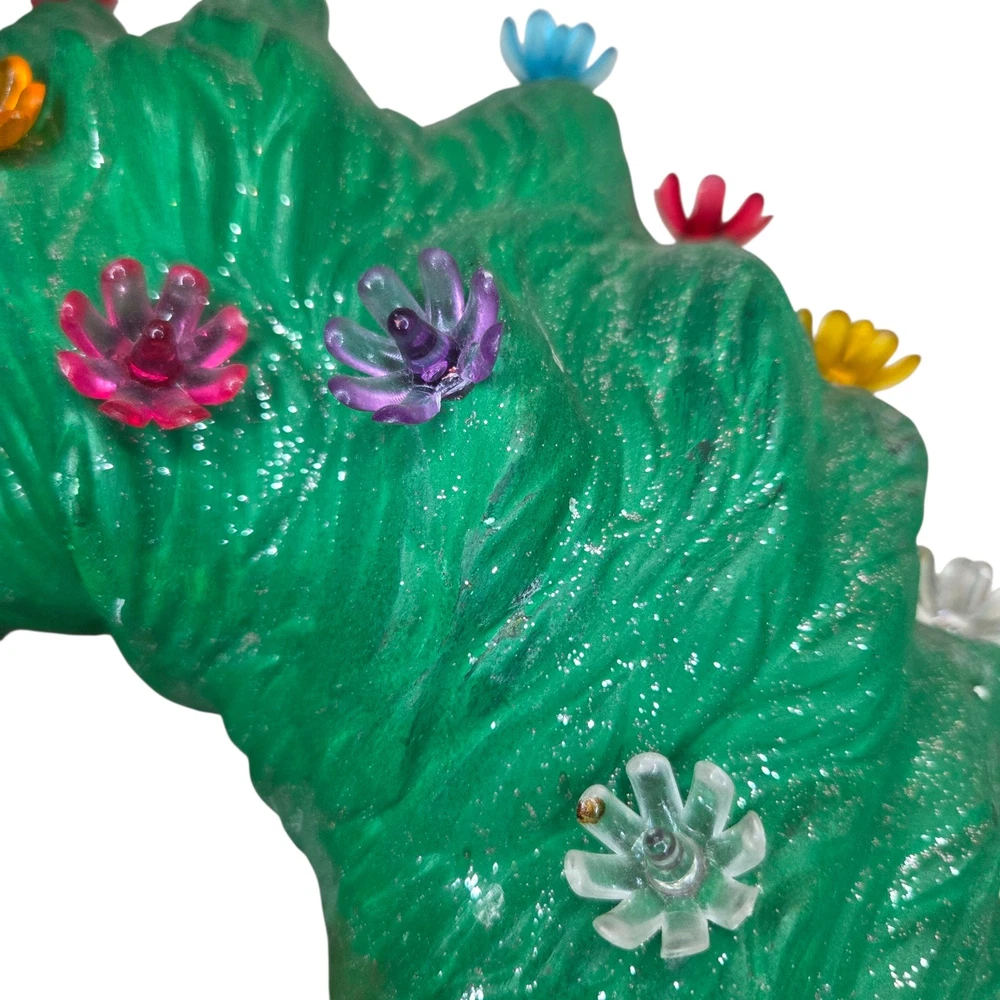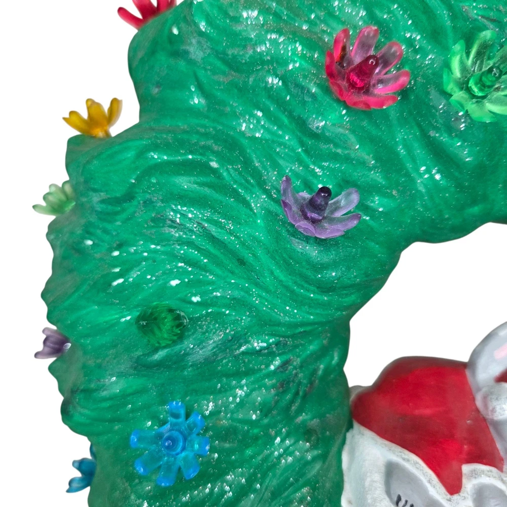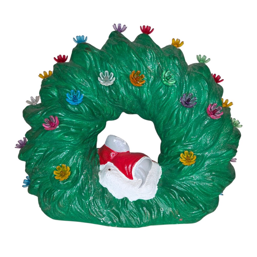 Ceramic Christmas Decoration Mouse Sleeping inside a Wreath . Please take a look at all of the pictures of this item for it's actual condition. A lot of the plastic flowers are broken, one flower is missing but it has like a cone shape plastic. Some chipped paint and some stains. And of course is missing the main light.