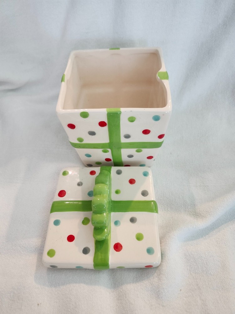 BEATIFUL GIFT BOX, TRINKET BOX, OR JUST DECO. PRE- OWNED, CHRISTMAS COLORS, POLKADOTS . 0RIGINALLY, A FLORAL BOX. THERE IS SOME CRAZING ON IT.