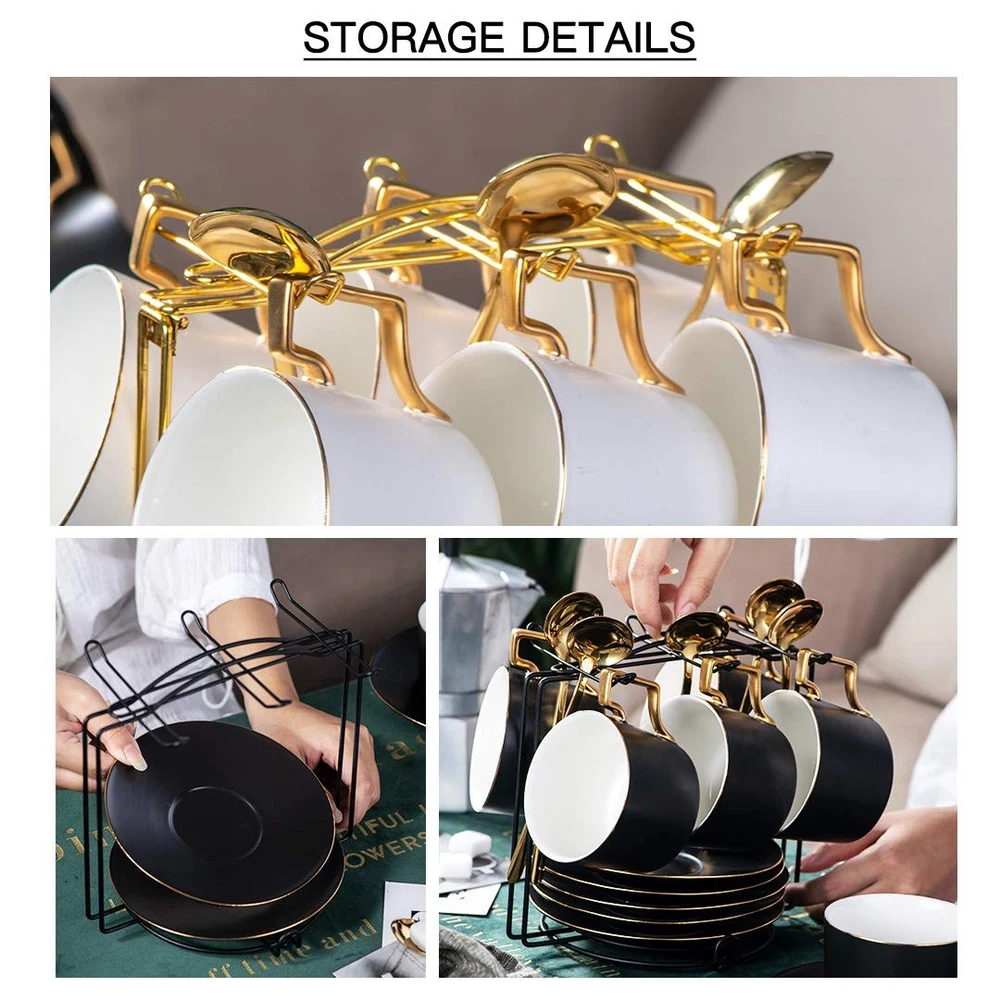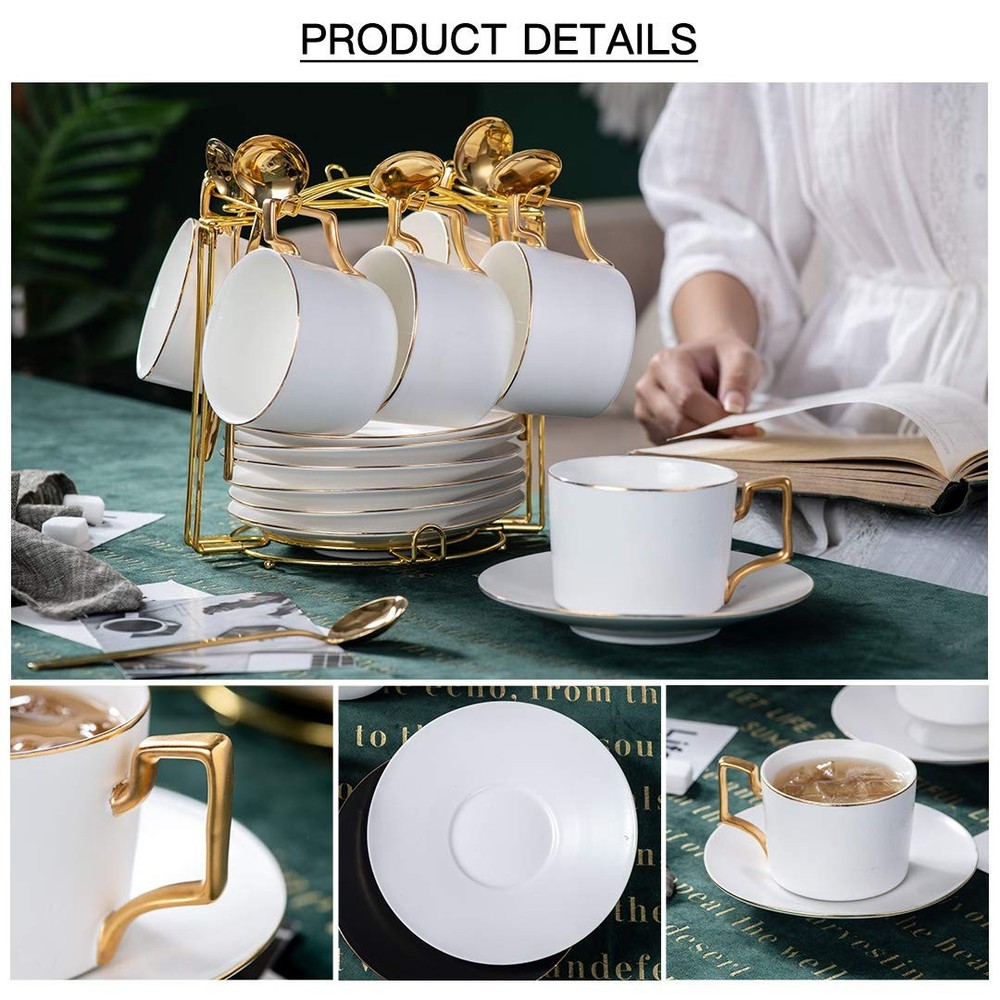 Enjoy your life, Enjoy your tea or coffee time with our Yelife tea cups and saucers! Enjoy an elegant afternoon! Using tea cups and saucers, just like drinking the delicious coffee in a high-end coffee shop. Tea cup and saucer set are decorated with glossy gold trim and a delicate dessert, perfect choice for your afternoon tea time.With Yelife Tea Cup and Saucer Set, it can improve quality of life of individuals, and you can enjoy the natural atmosphere of relaxed elegance. Housewarming Gift What a great and thoughtful gift for friends' birthday, Christmas, Thanksgiving Day and other memorable days. They will be so impressed by your sincere wishes and kind thoughts. Easy to wash. It can be cleaned easily under running water. Not contain lead and other harmful to the human body. Specifications: Material: High Grade Porcelain Colour: white Cup diameter:3.2 inch Cup high: 2.56 inch Saucers diameter: 6 inch Spoons diameter: 5.11 inch Package Included(19pcs): 6 * espresso cups 6 * espresso saucers 6 * spoons 1* cups rack Note: Due to the hand measurement, there have size error about 1 -2mm. If you have any questions about the product, please feel free to contact us, we will help you solve it as soon as possible. Thanks! 【ELEGANT DESIGN】coffee cup and saucer set with matte design style, gold trim design makes your morning brighter and more elegant! Perfectly matching your home decor style, the high-end and elegant mugs are sure to give your guests an unforgettable dining experience. 【HIGH GRADE PORCELAIN】The cappuccino cups with saucers are crafted with high premium approved porcelain. Note that this cup and saucer cannot be used in the microwave. 【PRACTICAL AND CONVENIENT】With comfortable cup handle, your finger can easily go through it, convenient to hold. Raised rim saucer with round center indentation easily to hold your coffee cup, coffee spoon, sugar or milk packet. 【MULTI-USAGE】The coffee cup and saucer set are perfect for cappuccino, espresso, macchiato, caffe latte, demitasse, tea and coffee. Enjoy your espresso in this fun and timelessly fashionable design demitasse cups set. 【ELEGANT GIFT】The Tea cup and saucer was safely packaged. It is a decent gift for your friends and family on Housewarming, Wedding party, Mothers' Day, Fathers' Day, Christmas and New Year's Day.