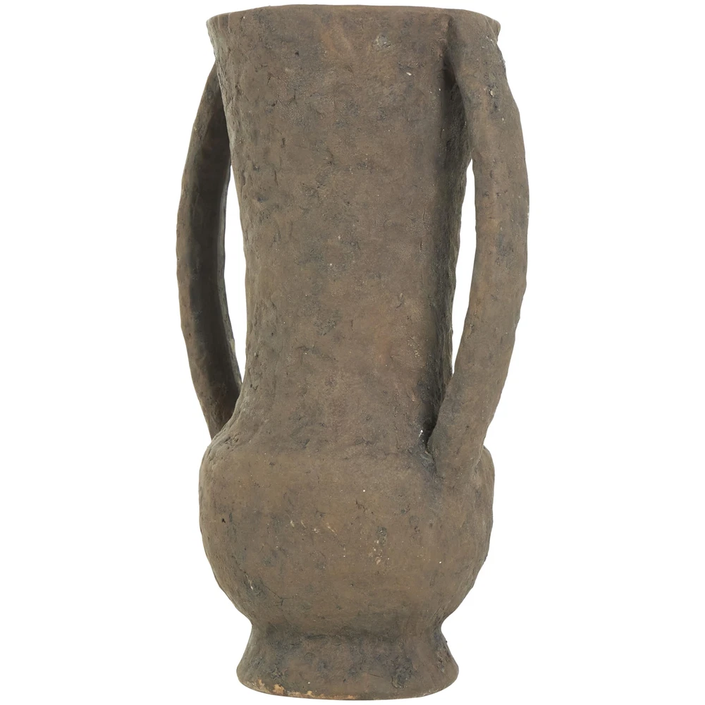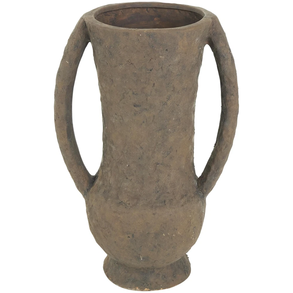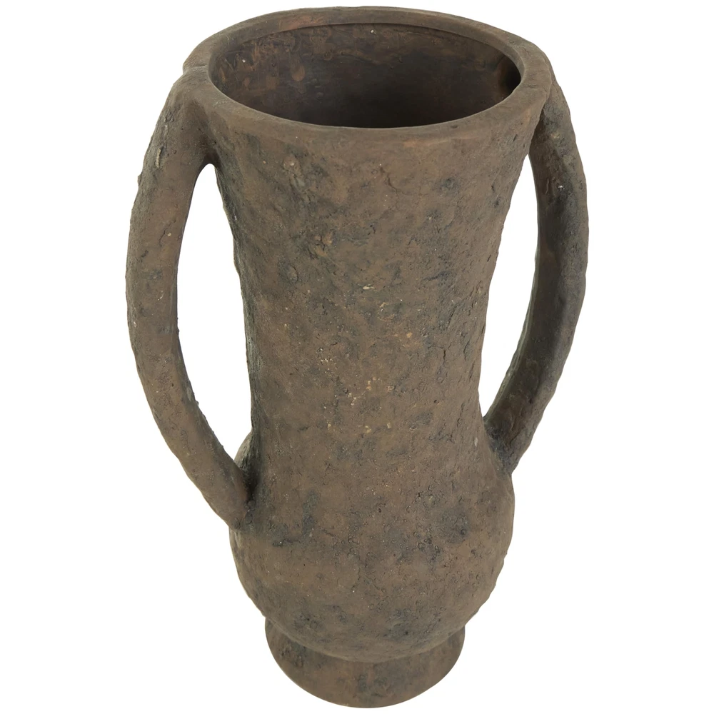The rustic vase for home decor is handmade using stoneware, showcasing expert craftsmanship in every detail. The sandstone dark brown vase for dried flowers boasts a rounded shape and curved handles. Wipe clean with a dry cloth. The dark brown centerpiece vase is perfect for living rooms or dining tables. Designed with felt or rubber stoppers at the base that prevent scratching furniture and table tops, as well as sliding around. This item ships in 1 carton. Stoneware vase makes a great gift for any occasion. Due to the handmade nature of this item, no will be alike, there will be slight differences in shape, size, and color. Suitable for indoor use only. This item ships fully assembled in piece. This is a single dark brown colored vase. Rustic style. Vase has a 5.70 in mouth opening. RUSTIC HOME DÉCOR VASE: Designed with rugged beauty and an earthy charm, where natural simplicity, warmth, and organic materials create a wholesome atmosphere CERAMIC VASE FOR CENTERPIECE: The dark brown decorative vase is made from high-quality stoneware DARK BROWN AND BLACK VASE FOR FLOWERS: The round home decor vase features a dark brown color with a textured finish ROUND VASE FOR HOME DÉCOR: The stoneware vase boasts wide handles for easy handling and an added rustic charm LARGE SIZE FLOWER VASE CENTERPIECE: The dark brown ceramic vase measures 9.5L x 6.6W x 15.25H inches, and weighs 5.395 lbs