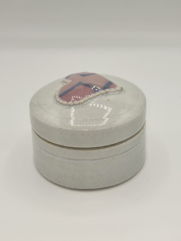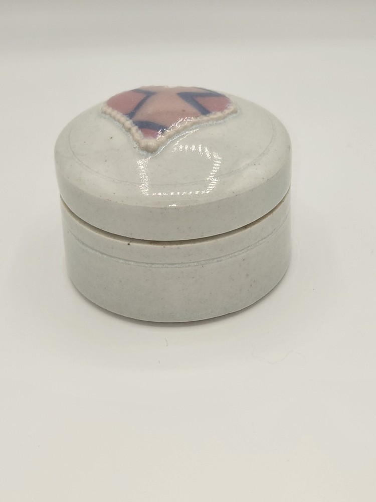 Charming ceramic trinket box, perfect for storing small treasures. This round box features a unique heart design on the lid, adding a touch of whimsy to any space. Ideal for holding jewelry, pills, or other small keepsakes, it's a delightful and functional piece. This trinket box would be a lovely addition to a bedside table, a thoughtful gift for a loved one, or a sweet accent in a bathroom. Keywords: trinket box, jewelry box, ceramic box, heart decor, stash box, pill box, decorative box, round box, keepsake box, gift idea, home decor, ceramic trinket box, heart trinket box