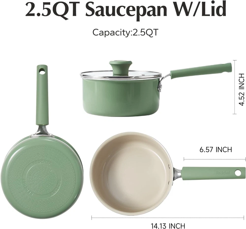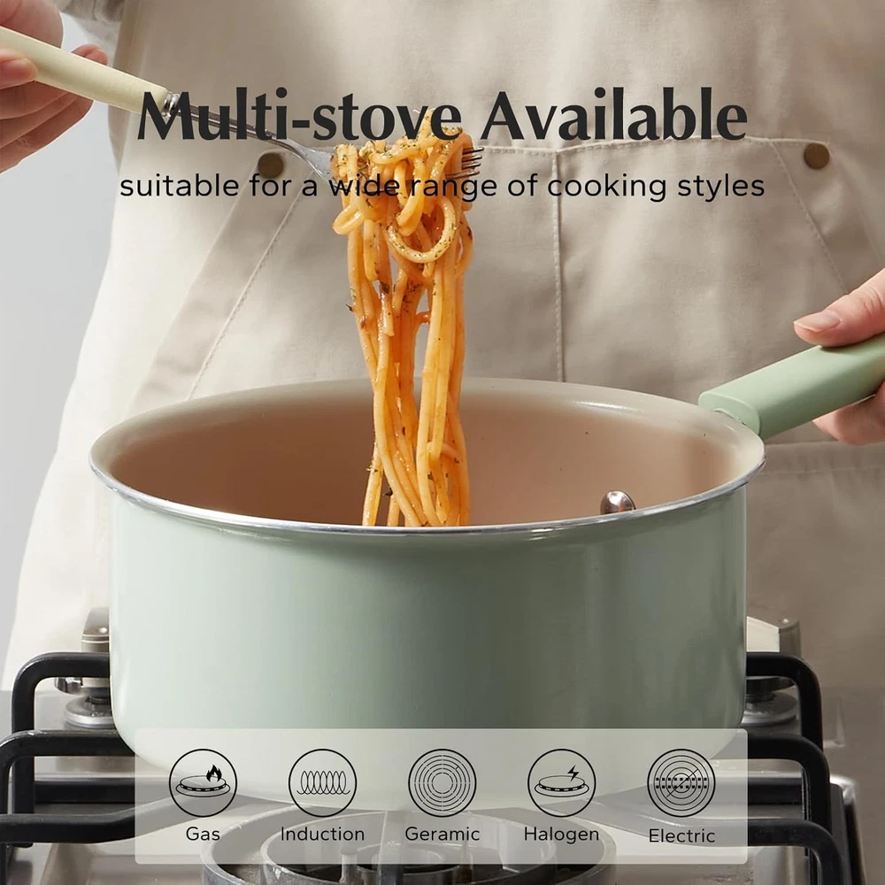 Ceramic Coating: Our small pots for cooking feature a ceramic coating that is safety. This non-stick coating ensures food doesn’t easily stick to the bottom, making them ideal for cooking pasta, sauces, oatmeal, and more. These ceramic nonstick sauce pan are a reliable kitchen companion for a variety of dishes Stay-Cool Handle: The ergonomic handle design of our ceramic cooking pot ensures comfort and durability. Small sauce pan stays cool to the touch while cooking, providing a safe and comfortable cooking experience. Enjoy effortless handling and optimal cooking conditions with this thoughtfully designed feature Food Safety Cookware: cooking sauce pot is no from substances like PFAS, PFOA, lead, and cadmium. This ensures a safe and secure cooking conditions for you and your family. Enjoy delicious, meals with peace of mind Convenient to Clean: Featuring a non-stick ceramic coating, ceramic saute pan with lid makes cleaning a breeze. Grease and stains wash away effortlessly, allowing you to either rinse with water or simply wipe clean. This saves you time and eliminates the hassle of scrubbing, making kitchen cleanup quick and easy Suitable for All Stoves: Cooking pots with lids are designed for versatility, working seamlessly with induction, glass, electric, and gas stoves. This multifunctional sauce pot adapts to any cooking environment, allowing you to cook with confidence and ease