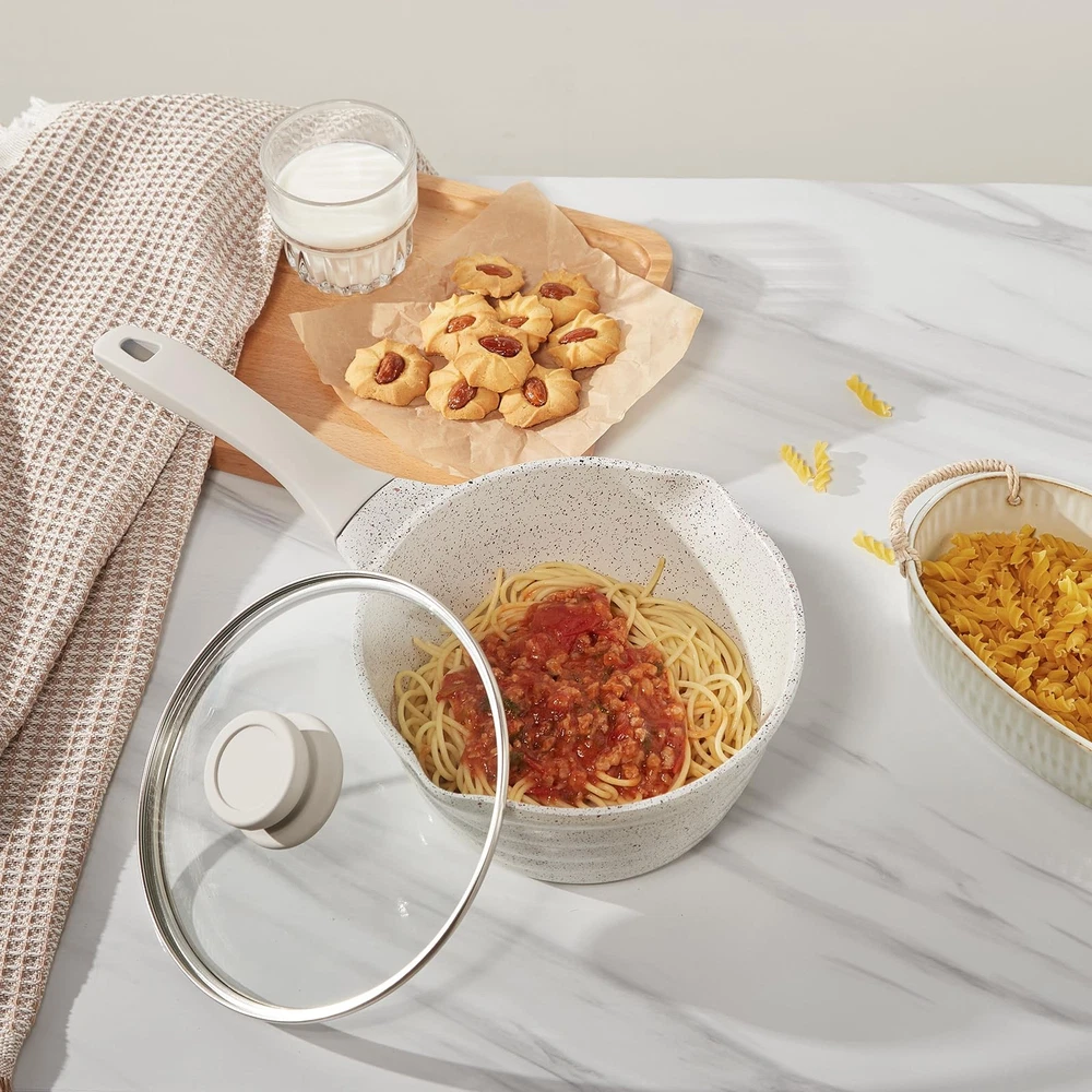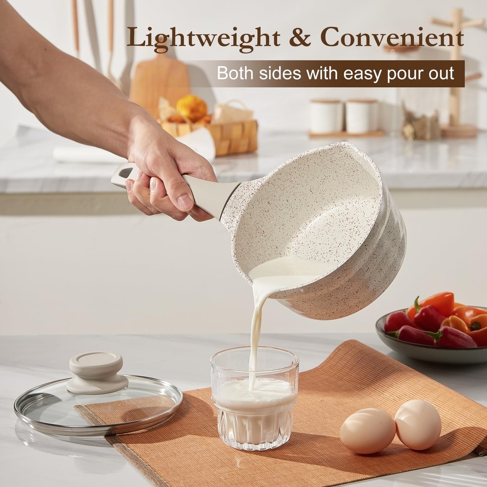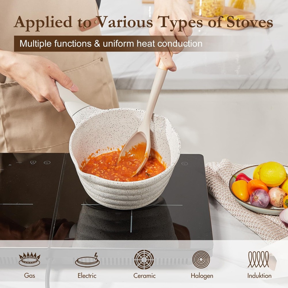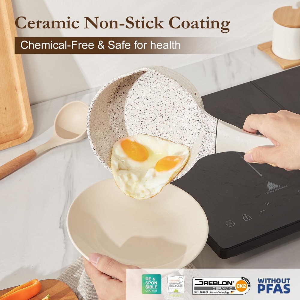 2.7QT Sauce Pan with Lid from France, Ceramic Non Stick Small Pot for Cooking, Kitchen Induction Pot with Pour Spout, Easy to Clean, PFOA and PFAS Free, Dishwasher Safe, White Granite Safe and Non-Toxic: Saucepan is coated with high quality German Weileurg ceramic coating, which is non-toxic and PFAS/PFOA free, no lead, cadmium and other toxic materials. Can be operated with a steel spatula and 10x longer lasting than traditional coatings. Promotes healthy eating by reducing the need for excess oil Universal Compatibility: The base of this saucepan is made of highly conductive stainless steel and is suitable for all hobs including induction and gas. The cast aluminium core ensures even heat distribution and prevents hot spots. The saucepan is perfect for making sauces, oatmeal, pasta, or vegetables such as potatoes Bakelite Handle: 2.7 qt saucepan with lid set feature ergonomic and comfortable bakelite handles that stay cool and are safer during the cooking process. The non stick saucepan comes with a tempered, heat-resistant glass lid to monitor the cooking process at all times, making induction saucepan with lid easier to control Dual Pour Spouts: The built-in pour spouts on both sides of our saucepan with lid offer great convenience, catering to both left- and right-handed users for a seamless cooking experience Dishwasher Safe: Saucepan with lid feature a rivet free design that prevents food from getting stuck and makes cleaning a breeze. Place the nonstick sauce pan in the dishwasher for easy maintenance. For hand washing, simply wipe them down with a sponge and soapy water and you're ready to prepare three meals a day Guaranteed Customer Satisfaction: Each of our cookware undergoes a professional and strict quality inspection to ensure the superior quality of our sauce pans. If you receive any defective product due to delivery or encounter any problem while using the saucepans, please feel free to contact us and our customer support team will provide excellent service within 24/7