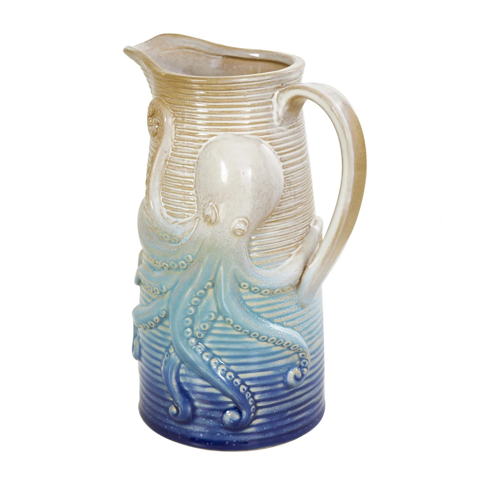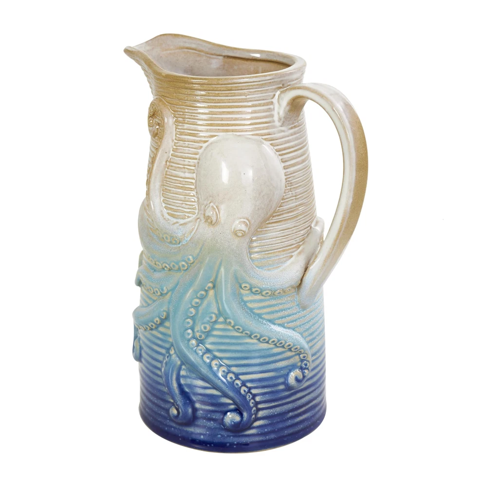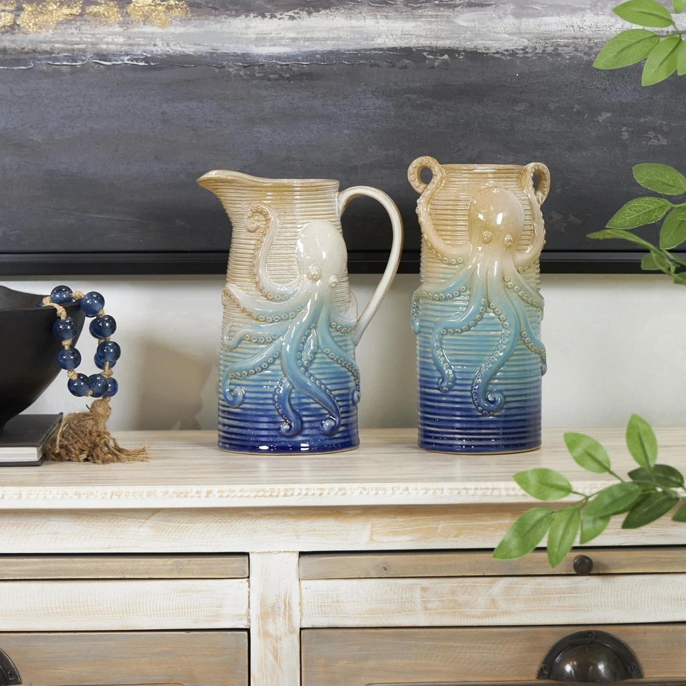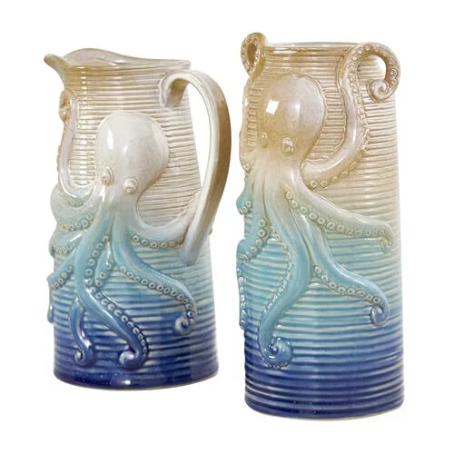 Each contemporary set of 2 vases for home decor is molded from stoneware to showcase intricate design and craftsmanship. The glossy blue vases for faux flowers have a rounded shape with an ombre effect and an octopus ribbed design, adding elegance. Wipe clean with a dry cloth. The octopus set of 2 centerpiece vases is perfect for enhancing any living room or dining area. Designed with felt or rubber stoppers at the base that prevent scratching furniture and table tops, as well as sliding around. This item ships in 1 carton. Stoneware vase makes a great gift for any occasion. Suitable for indoor use only. This item ships fully assembled in piece. This blue colored stoneware vase comes as a set of 2. Contemporary style. Vases have 3 in, and 2.50 in mouth openings. CONTEMPORARY HOME DÉCOR VASES: Embrace artistic expression with a style that highlights bold designs with sleek lines, neutral elements, and a minimalist aesthetic CERAMIC VASES FOR CENTERPIECE: The blue decorative vase set is crafted from high-quality stoneware and glazed beautifully BLUE AND CREAM VASES FOR FLOWERS: The round home decor vases set features a glossy finish with a blue, teal, cream, and gold color ombre effect OCTOPUS ROUND VASES FOR HOME DÉCOR: The stoneware set of 2 vases boasts dimensional ribbed detailing and an octopus motif that enhances its visual appeal 2 SMALL SIZE FLOWER VASES CENTERPIECE: Each blue ceramic vase measures 7L x 4W x 9.55H , 4.4L x 4.4W x 10.05H inches, and collectively weighs 4.385 lbs