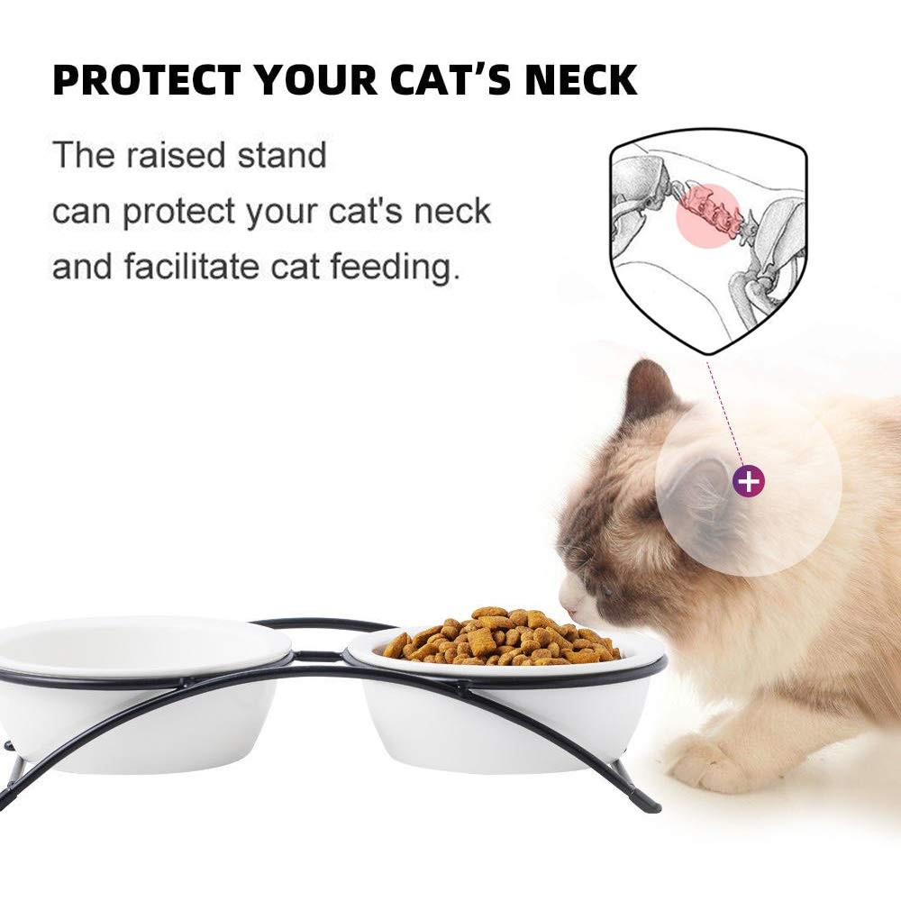 Unique Design: The feeding bowl dimensions are 5.4’’ wide and 1.9 '’ deep. The shallow and wide shape prevents whisker fatigue, while rounded edges make it easy for your cat to get every bit of food. Plenty deep to contain your cat’s food without spilling. Protect the Pet's Cervical Spine: The elevated cat bowl put a cat's mouth at a better position in relation to its stomach, it helps cat swallow more easily. Smooth stand,Non-slip: keeps the cat bowl in one place, the hungry cat can't push around the water and food. Keep away from mess. High Quality Ceramic: Ceramic materials are smooth and not easy to hide dirty things, it's good for kitty's health. Microwave & dishwasher safe, easy to clean. No break or shatter while using, or in transport. Sturdy and Practical Design: This set includes two 12oz ceramic bowls, perfect for small cats. Separate food and water bowls reduce refills and easily meet your cat’s daily needs. Comfortable Dining Height: Slightly elevated to reduce neck strain, this design makes meals easier to swallow, promoting better digestion for your cat’s comfort and health. No-Slip, No Mess: Four anti-slip rubber feet keep the metal stand stable, preventing tipping or sliding for a clean, organized feeding area—ideal for eager eaters. Durable and Easy to Clean: Made from long-lasting ceramic, these bowls resist odors and are dishwasher safe for quick and easy cleanup. Elegant Design with Fun Patterns: Featuring cute paw or bone prints, this black-and-white set complements your home décor while adding a playful touch to your pet’s meals.