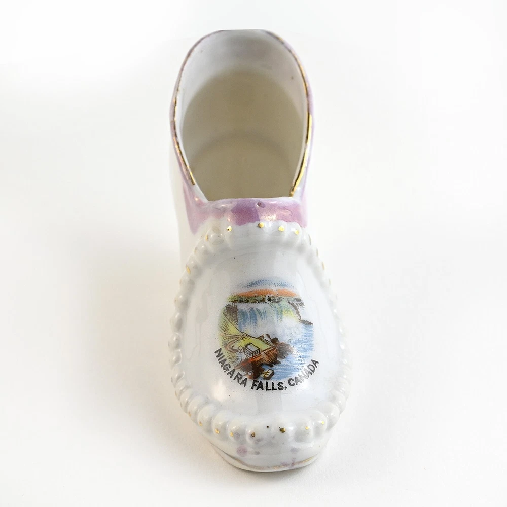 For sale are a lot of 3 Victorian Style Ceramic Shoes. They are all souvenirs from Niagara Falls. There is one larger shoe that measures about 5.5 inches long. It is very colorful in gold and blue luster with orange & yellow accents. This shoe has a decal saying Souvenir of Niagara Falls which is legible but warn. It is stamped and embossed Made in Japan. The other two shoes are smaller, about 3.5 inches long and both are decorated with different scenes from the Falls. One is stamped Made in Occupied Japan and the other is stamped "Metropolitan Design Copyrighted". These are all vintage items and so are pre-owned and used. They may show some signs of cosmetic ware but are in good condition with no chips nicks or cracks. It may have some imperfections caused during hand painting or the manufacturing process. The decal on the largest shoe shows wear. Please see images for size, condition and details. Feel free to reach out to me with any questions and thanks for looking! Your item will be packaged carefully and mailed the best way with tracking.