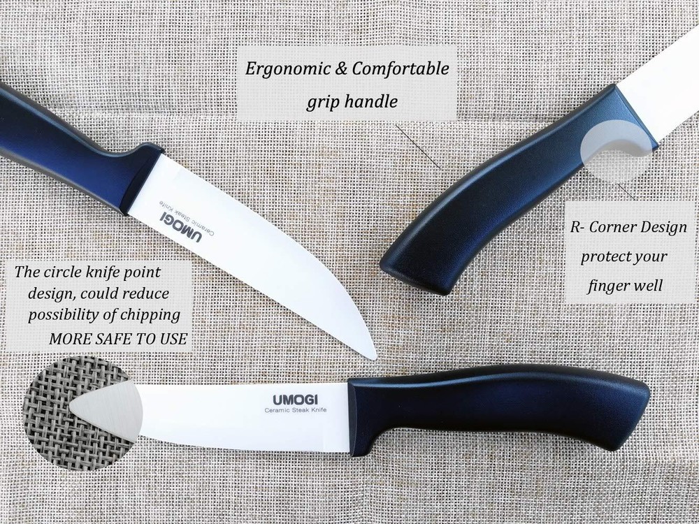 ▶1, ULTRA-SHARP: Ceramic knife is of the sharpest knives on the market and stay sharp for years. For fine, precise cutting. This is 4.5'' LARGE STEAK KNIFE ( a little larger than normal size ), not only for steak & pork chop, but also good for fruit & vegetables, BBQ. Slicing carving knife, UTILITY KNIFE. ▶2, HYGIENIC & RUST-PROOF: When meat, fruit and vegetables are cut with ceramic, the oxidation process is stopped, which means their properties are preserved and they don’t turn brown (as in the case of apples, aubergines, artichoke,etc.). And the ceramic blade won’t change the flavour of the food. More hygienic and safer than other blades and non rust. ▶3, LIGHTWEIGHT: Because they are made of lightweight ceramic, these knives are easy to handle and require less effort. ▶4, EASY TO CLEAN & : Ceramic does not absorb food substances. Just rinse with water and towel dry to keep these knives in perfect condition. After hundreds of strict tests, our ceramic knives can be put into the dishwasher. Although knives can be safely washed in the dishwasher, hand wash is recommended. The blade is protected by sheath, easy to and carry. ▶5. Experience the Difference. If you are tired looking for gift ideas, you might like to try this colorful steak knife set. Young Fashion Style. This set is a wonderful gifts for your husband, wife, mom, dad, grandma and friends who enjoys cooking or eating steak. We stand behind our dinner knives set with a 100% SATISFACTION OR MONEY BACK , try it risk free.