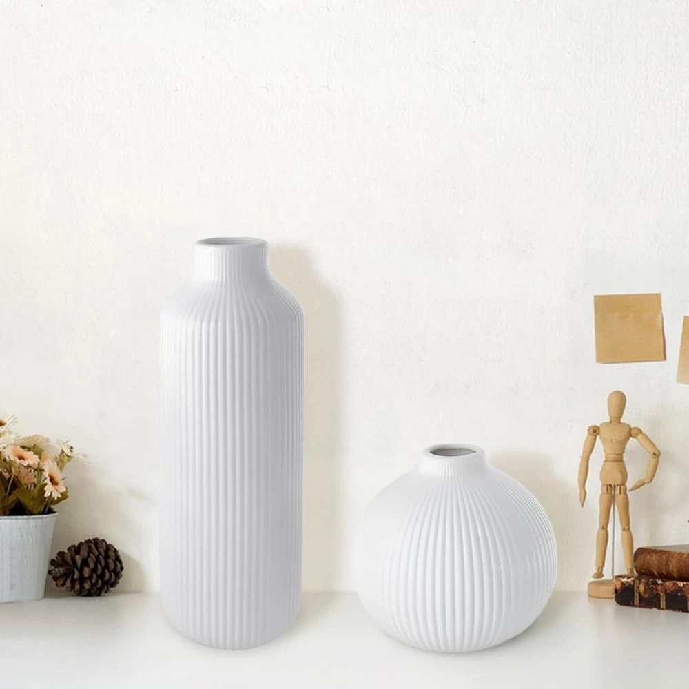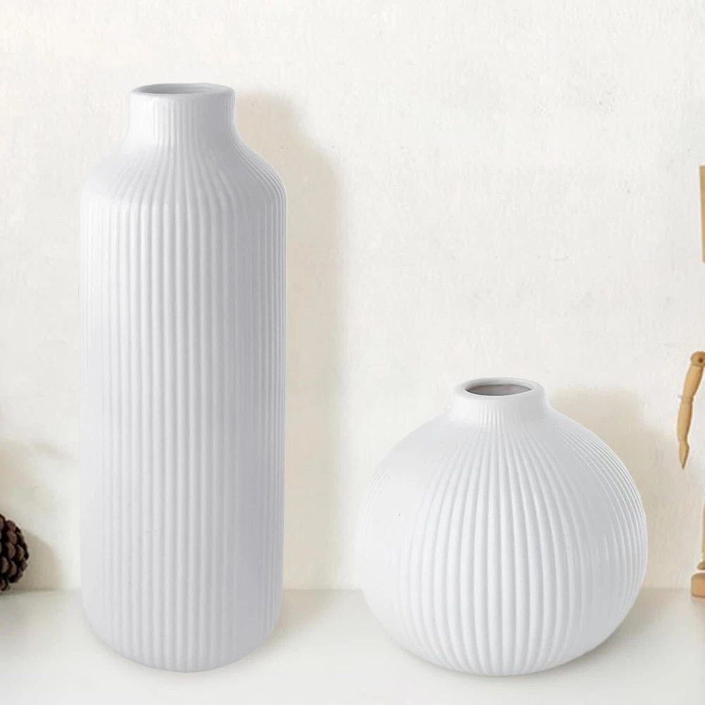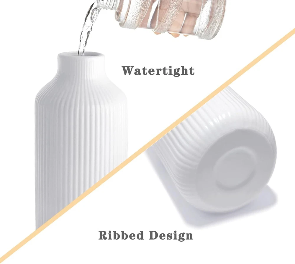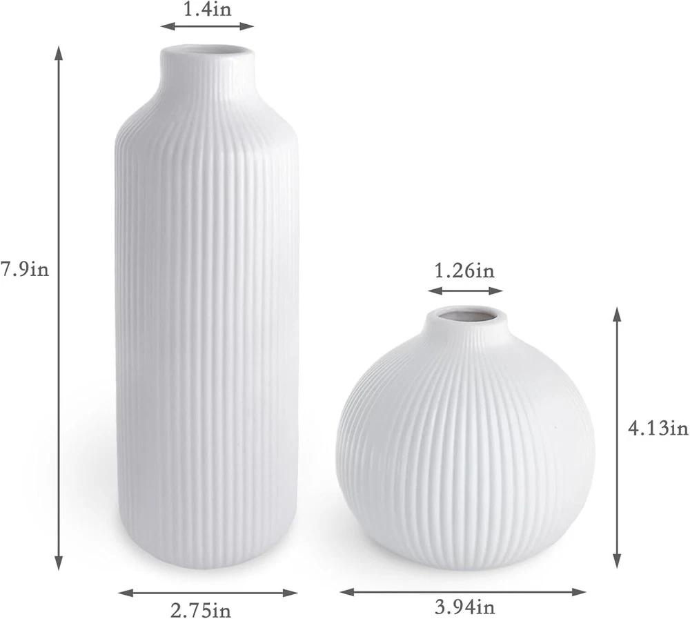 Ceramic Vase Set of 2, Small White for Flowers, Modern Home Decor Product Details Material: Ceramic Color: White Brand: NAXIHOPT Product Dimensions: 2.75"L x 2.75"W x 7.9"H Shape: Bottle Minimalist Design: The flower vase has a white matte finish, smooth texture, and a ribbed design. The unique texture gives the vase a minimalist and elegant look. It effortlessly enhances any space. Quality Ceramic Vase: The vase is made of high quality ceramic. It is durable, unbreakable as well as watertight. Can be paired with dried or fresh flowers, making it the perfect decorative partner for the modern rustic farmhouse home. Applicable Scenarios: As a modern style vase, you can display it on its own or with bouquets of flowers, pampas grass, rose or a variety of flowers to show off its beauty. Perfect for the house decor such as living room, dining room, bathroom, kitchen, mantelpiece or office. It can also be used as a decorative partner for weddings, anniversaries, birthdays, parties, Easter, Mother's Day, Christmas and other important days. Convenient Size: The vase measures 7.9“ x 2.75”, 4.13“ x 3.94”, can be placed in the center of your bookshelf, coffee table, desktop, fireplace, entryway table, or dining table, and perfectly blends into your furniture to enhance their beauty. Protective Packaging: Since the vase is made of ceramic, we have used packaging that is strong enough to keep it from getting damaged easily.