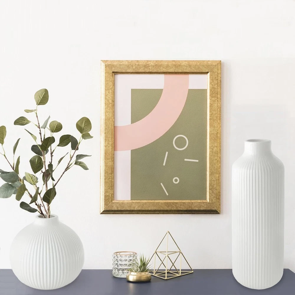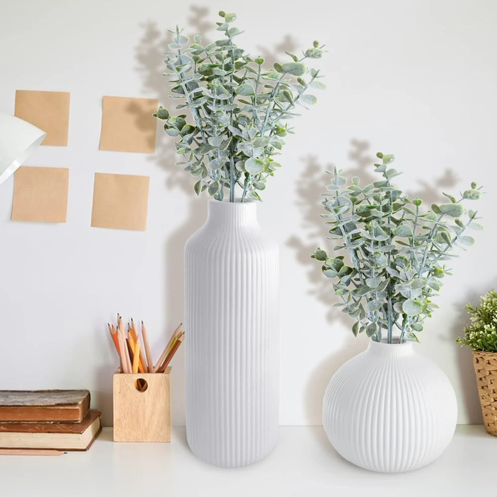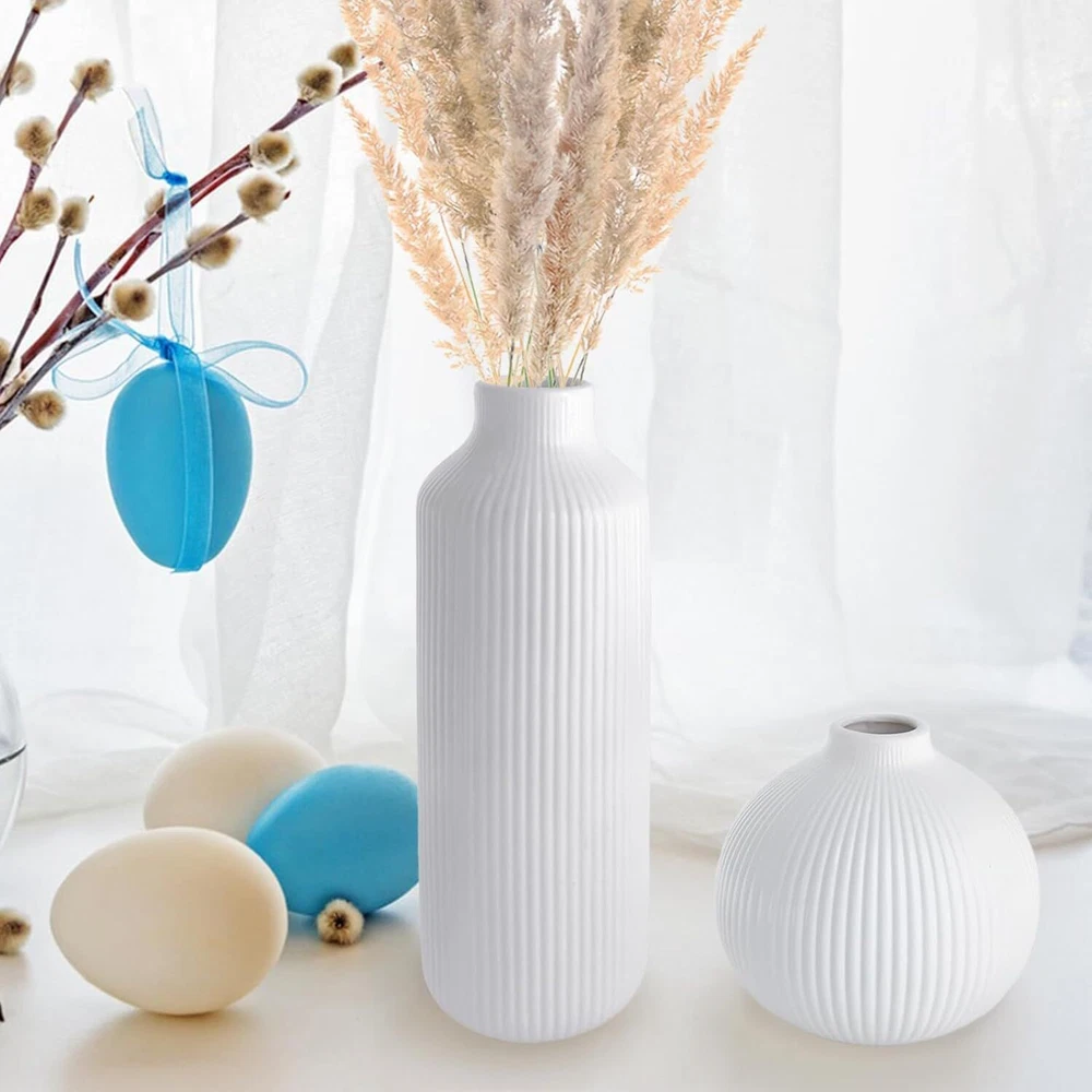 Ceramic Vase Set of 2, Small White for Flowers, Modern Home Decor Product Details Material: Ceramic Color: White Brand: NAXIHOPT Product Dimensions: 2.75"L x 2.75"W x 7.9"H Shape: Bottle Minimalist Design: The flower vase has a white matte finish, smooth texture, and a ribbed design. The unique texture gives the vase a minimalist and elegant look. It effortlessly enhances any space. Quality Ceramic Vase: The vase is made of high quality ceramic. It is durable, unbreakable as well as watertight. Can be paired with dried or fresh flowers, making it the perfect decorative partner for the modern rustic farmhouse home. Applicable Scenarios: As a modern style vase, you can display it on its own or with bouquets of flowers, pampas grass, rose or a variety of flowers to show off its beauty. Perfect for the house decor such as living room, dining room, bathroom, kitchen, mantelpiece or office. It can also be used as a decorative partner for weddings, anniversaries, birthdays, parties, Easter, Mother's Day, Christmas and other important days. Convenient Size: The vase measures 7.9“ x 2.75”, 4.13“ x 3.94”, can be placed in the center of your bookshelf, coffee table, desktop, fireplace, entryway table, or dining table, and perfectly blends into your furniture to enhance their beauty. Protective Packaging: Since the vase is made of ceramic, we have used packaging that is strong enough to keep it from getting damaged easily.