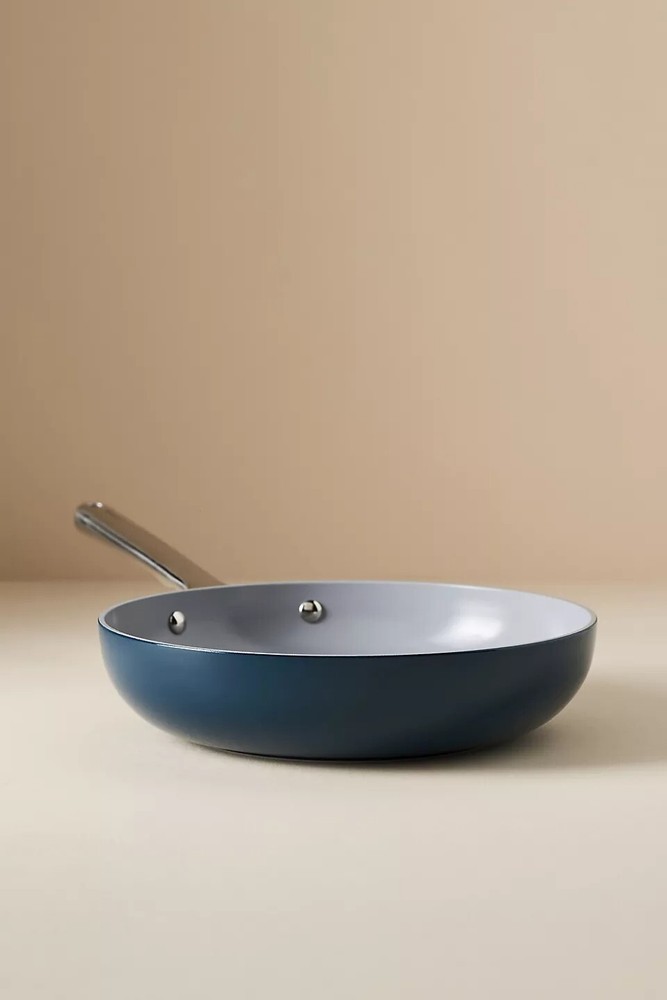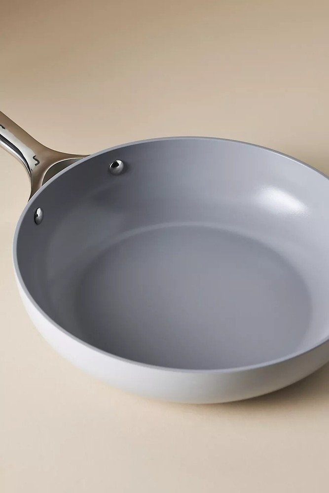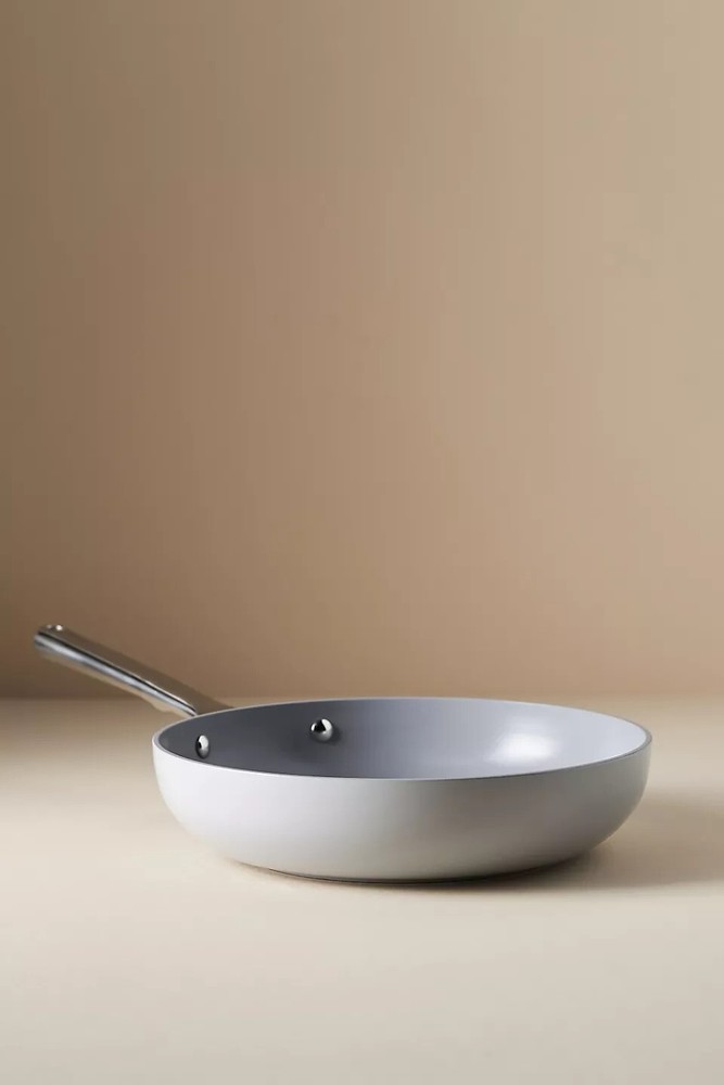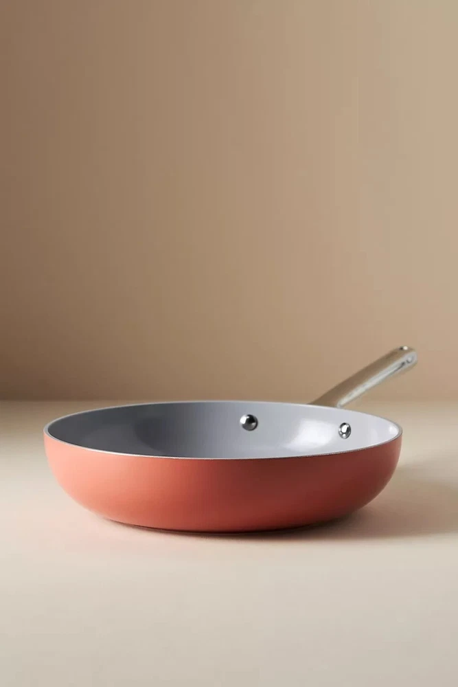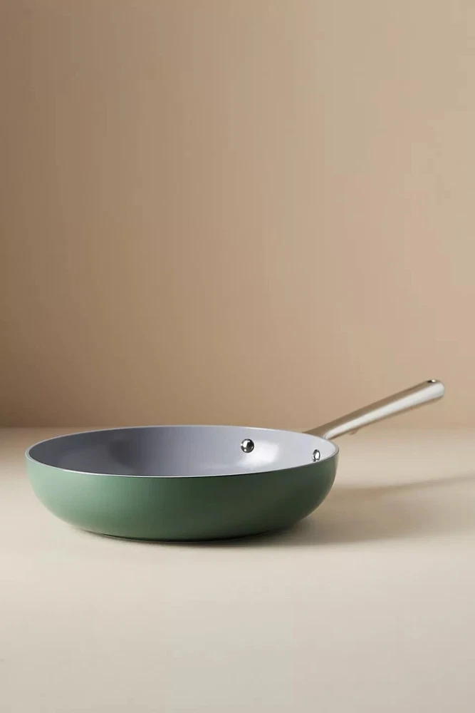 Caraway's Fry Pan allows for healthy cooking in the kitchen without harmful chemicals: use for slide-off-the-pan eggs, sautéing veggies, and more. Featuring a non-toxic ceramic-coated interior, this durable non-stick pan makes cooking easier than ever, cleaning (dare we say) enjoyable, and adds a pop of color to any home. Lid sold separately Ceramic-coated aluminum, aluminized steel Non-stick Hand wash; dry thoroughly before storage Not dishwasher or microwave safe Oven safe up to 550°F Imported Dimensions 10.5" diameter