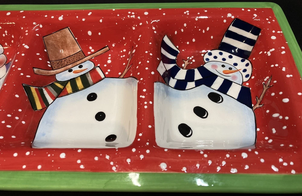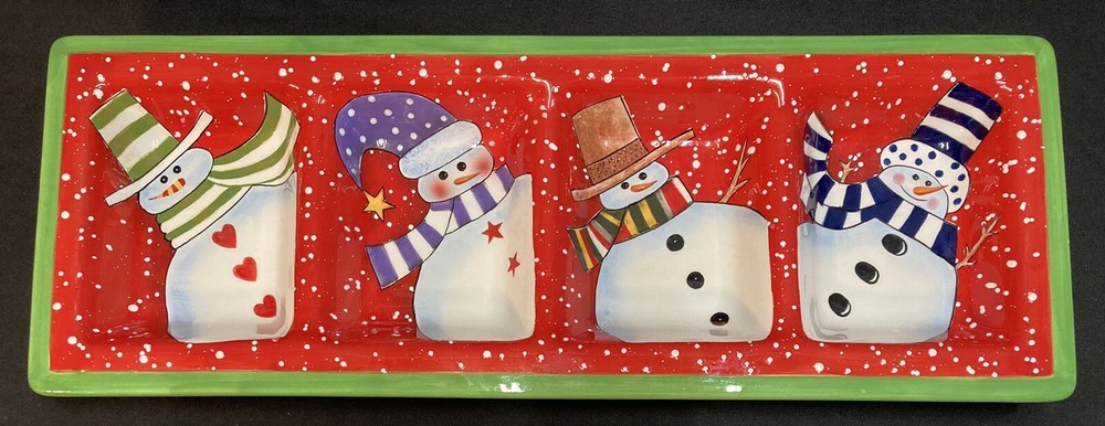 This festive 4-section snowman candy/serving dish by Certified International measures 18.75 inches in length, 7 inches in width, and 1.5 inches in height. The item is pre-owned and comes in good, clean condition with no chips, cracks, or breaks. Please see pictures for complete details. If you have any questions or concerns, please do not hesitate to contact us. Check out our other items and message us if interested in more than one listing as combining items could save you money on shipping. RETURNS & REFUNDS Please inspect your item as soon as it arrives. We stand by the quality of the items we sell and will issue a full refund, including shipping charges, on any defective item that is returned. Please note: photos of the item, packaging, serial numbers and/or product identifiers may be required in order to guarantee a full refund. Returns are accepted on non-defective items; however, shipping charges will be withheld from your refund.