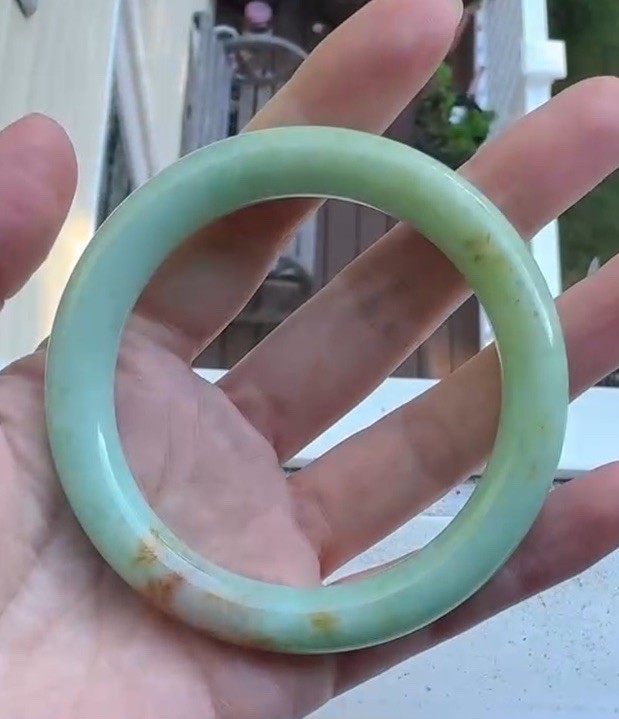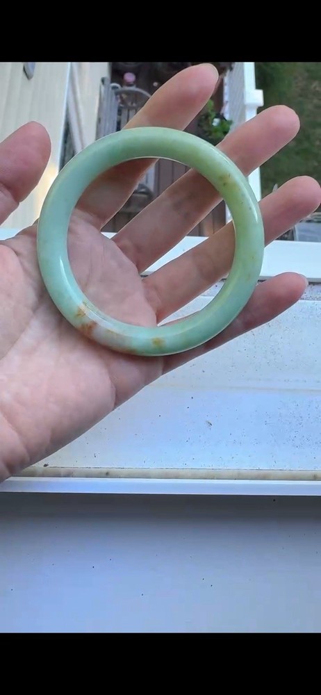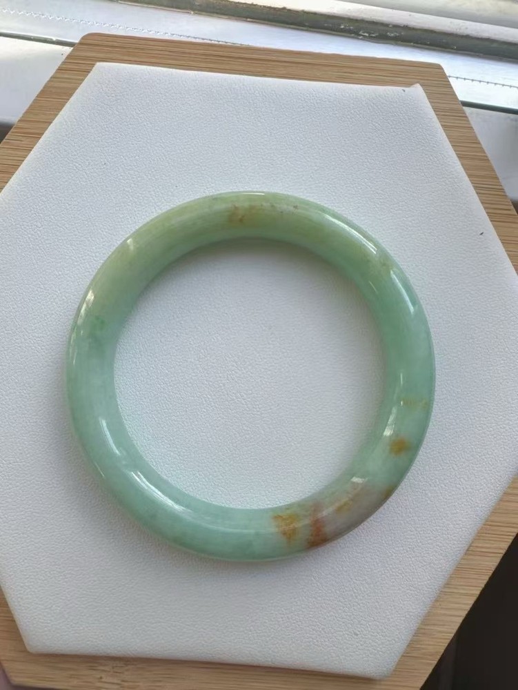 Apple green with floating specks of red, super eye catching and fine gradient 甜果绿飘红翡圆条 56.2mm inner circumference 56.2 x 10.6 x 6.8mm can be worn by someone with typical circumference of 57.5mm Barely any imperfections except small crack at the red portion Retails at $900, offers welcome!