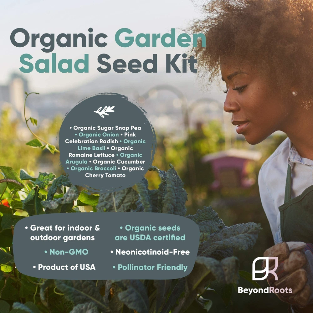 ORGANIC SEEDS FOR PLANTING VEGETABLES - Non GMO Seeds: Organic Arugula Seed, Radish Seeds, Organic Lime Basil Seeds, Organic Broccoli Seeds, Organic Romaine Lettuce Seeds, Organic Purplette Onion Seeds, Organic White Cherry Tomato Seeds, Organic Sugar Snap Pea Seeds, Organic Salt & Pepper Cucumber Seeds. DIY VEGETABLE GARDEN - Fresh grown organic vegetables straight from your yard or indoor planters to your table! The veggie seeds in this garden seed collection are wonderful for indoor gardening; the seeds also make the perfect organic vegetable seeds for planting outdoors. Watch as your hydroponic seeds grow into a lush indoor garden. UNIQUE GARDENING GIFTS - This Salad Garden Seed set is perfect for all occasions, including birthdays, bridal showers, baby showers, and more! Also included is an exclusive eBook with growing tips and recipes. With designer-created packaging, your gift is ready to go - no gift wrapping required! HIGH QUALITY SEEDS - We stand behind our seeds with our 1 Year Grow Guarantee*. If you plant the seeds as suggested and they don't sprout, we will replace your seeds. 100% NON GMO AND MOST ARE ORGANIC SEEDS - Our seeds are sustainably sourced in the USA and all varieties are 100% non GMO. The organic seed varieties are USDA Certified Organic by MOFGA or Oregon Tilth. All seeds have been tested for quality with germination rates matching or higher than USDA standards and sealed for freshness.