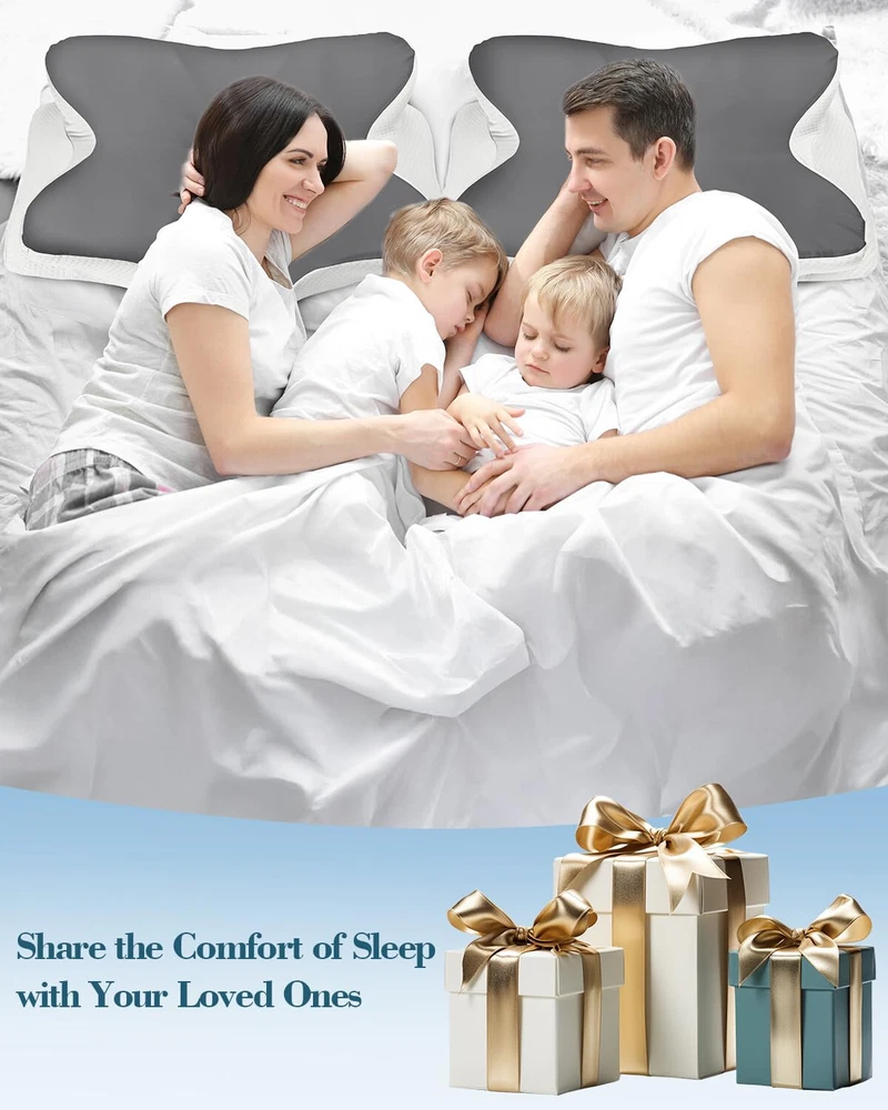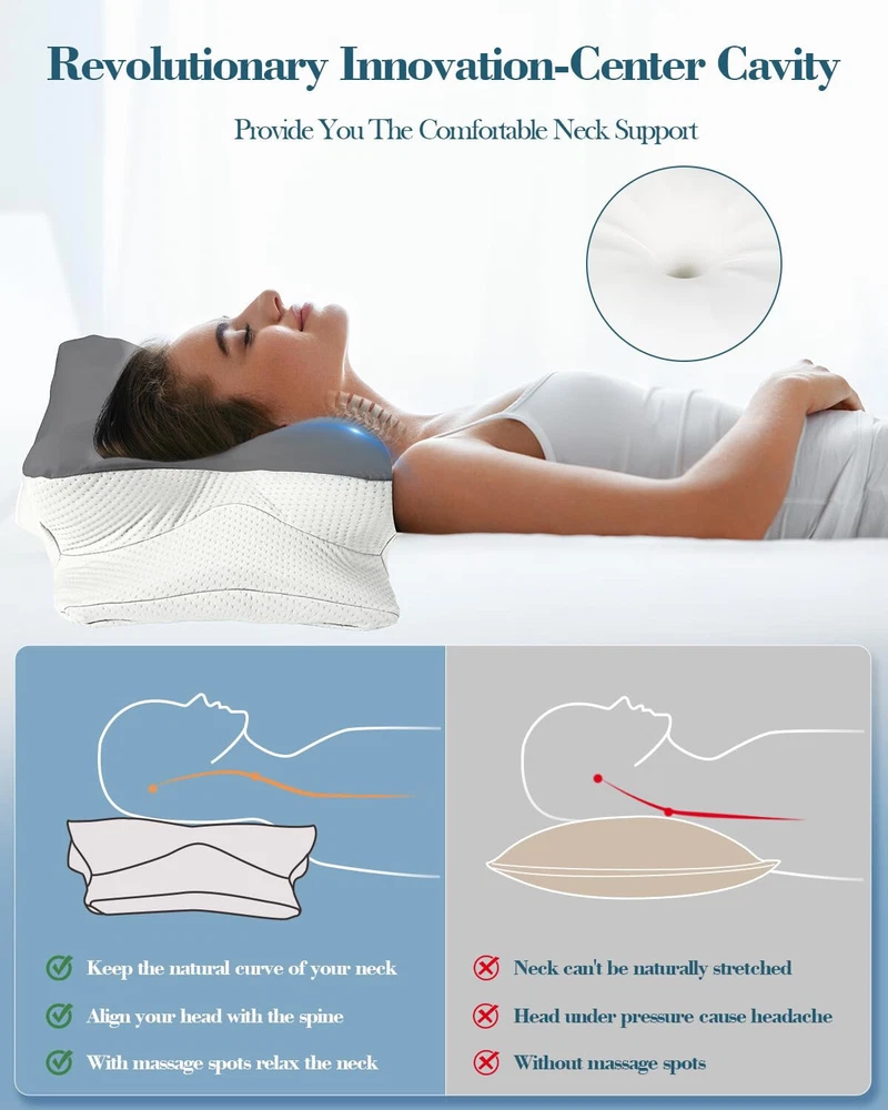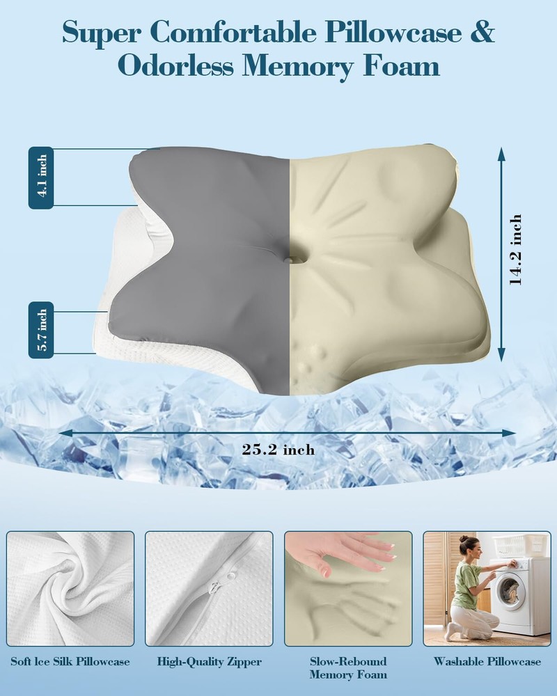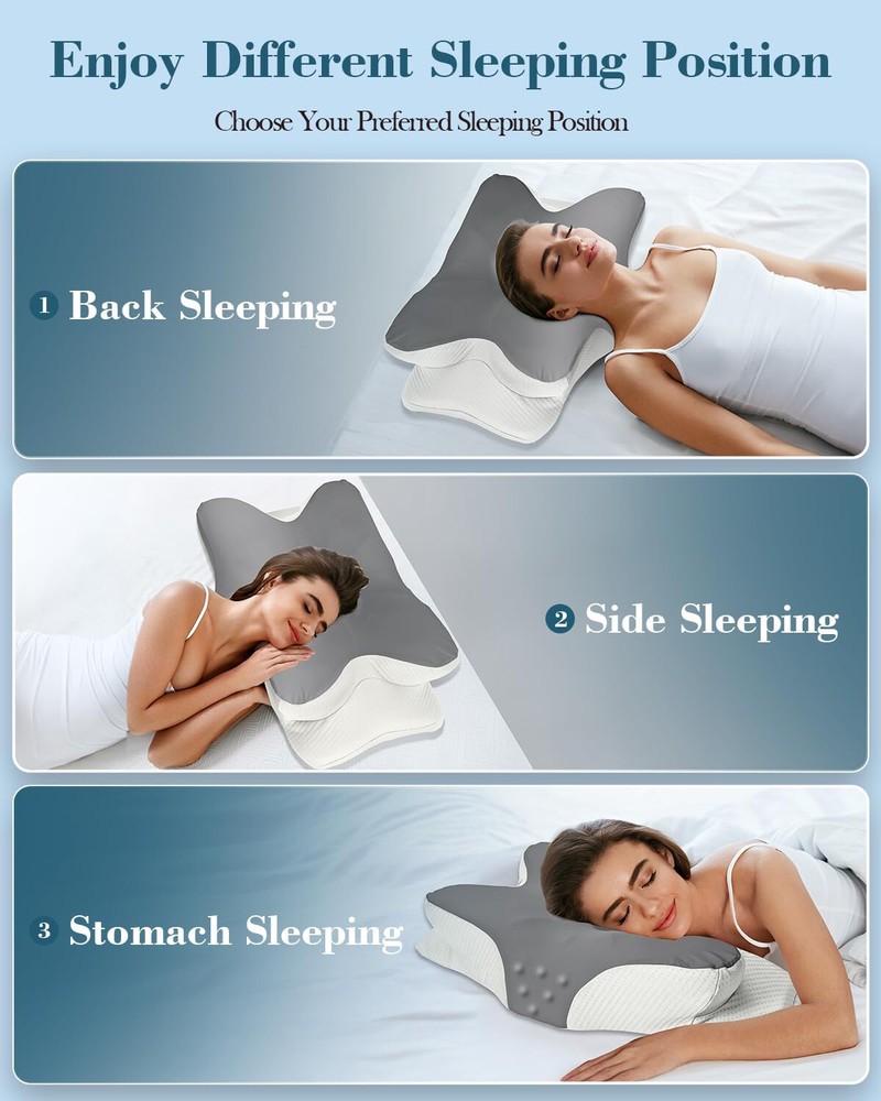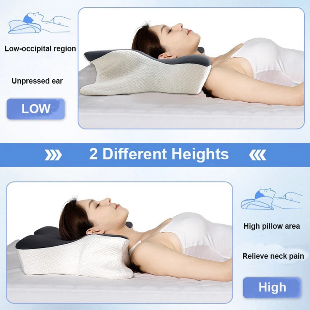 BUTTERFLY SHAPED PILLOW: Transform your sleep experience with the versatile ergonomic pillow. Its innovative design, featuring a unique hollow and butterfly curve, mimics the human anatomy to perfection. This curve molds snugly to your head, aligning your spine and relieving cervical stress. Enjoy ample shoulder space and an extended armrest area for unrestricted hand positioning. Say goodbye to discomfort and embrace restful nights with this revolutionary pillow! PERFECT FOR SIDE, BACK, STOMACH SLEEPERS: The Ergonomic Pillow comes two height options and armrest design, so you can choose personalized height. Flip it 180 degrees to switch between high and low profiles: high suits side sleepers and larger frames, low is ideal for various sleeping positions. Its sculptable design allows easy shaping for personalized support under the head and neck, ensuring comfort in any posture! SLOW REBOUND MEMORY FOAM: Our neck pillow features a unique natural molded foam crafted from premium resilient memory foam. As you rest on it, the memory foam gently adjusts, providing cloud-like comfort. Its perfect firmness and support mold seamlessly to your neck and head, guaranteeing a peaceful night's sleep COOLING BREATHABLE & REMOVABLE PILLOWCASE: This side sleeper pillow with cooling ice silk pillowcase, and there are lots of ventilation air holes at the neck and head position, which help dissipate heat and keep you cool all night. The pillowcase has a zipper on the back, you can remove it for cleaning at any time, and it's machine washable. You will not regret to purchase this super comfortable sleep pillow PERFECT GIFT CHOICE: This cervical neck pillow is designed to effectively prevent cervical spine issues and alleviate sleepless nights. Suitable for individuals of all ages, including yourself, parents, friends, and colleagues, its long-term use can significantly enhance the quality of sleep
