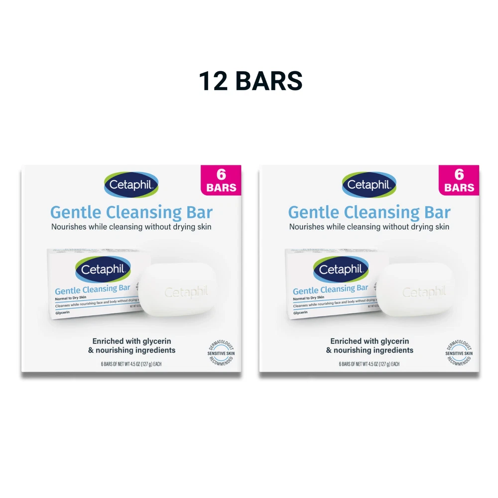 Get Your Cetaphil Gentle Cleansing Bar - Choose Bars (6, 12, or 30 Bars) Pick the number of bars you'd like from the options bars! Each box contains 6 Gentle Cleansing Bars, so you'll get exactly the quantity you choose This soap-free bar is formulated with 5 nourishing ingredients to gently cleanse the skin without drying it out, maintain the skin's natural moisture barrier, and preserve its protective oils, leaving skin feeling soft and clean. Defends against 5 signs of skin sensitivity, including a weakened skin barrier, irritation, roughness, tightness, and dryness. Features: Six 4.5oz Bars/ BOX Moisturizes Rinses Easily Great for Dry and Sensitive Skin Non-Comedogenic