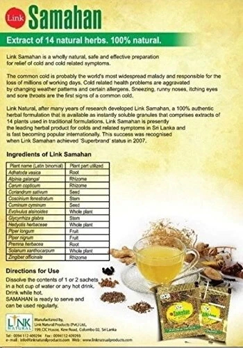 Ceylon Link SAMAHAN Ayurveda Herbal Tea Natural Drink for Cough & Cold Remedy Link Samahan 100% Natural herbal Instant Ayurveda Tea 4g each Packet Available in 4gx 10-100 packets Item description from the seller:- Link Samahan is a 100% natural authentic herbal drink formulated with 14 trusted ayurvedic herbal ingredients that have been used traditionally over centuries to enhance health & well-being. Link Samahan has been trusted for over two decades by millions of consumers who consume the product daily. Its unique aroma and pleasant zesty taste are loved by consumers around the world. It is a very concentrated herbal preparation in the form of a powder, which is diluted with water. After drinking, there is an immediate supply of energy. For flu and colds, it relieves upper respiratory tract pain. It is a concentrated, water-soluble formulation that has a preventive effect on signs of the common cold and flu. It acts as an analgesic (pain reliever), antipyretic (fever reducer), expectorant (promotes sputum secretion), and anti-inflammatory, thus providing immediate relief from the first signs of a cold. Samahan provides a complete Health Shield if consumed daily. Samahan can be added with Tea, milk, Soup's or plain old method of consuming it with hot water. Ingredients:- Adhatoda-Adhatoda vasica Nees. Galangal- Alpinia galanga Willd. Ajowan – Carum copticum Benth & Hook Coriander – Coriandrum sativum Linn. Veniwel – Coscinium fenestratum (Gaertn.) Colebr. Cumin – Cuminum cyminum Linn. Vishnukranthi- Evolvulus alsinoides Linn. Liquorice – Glycyrrhiza glabra Linn. Pathpadagam- Hedyotis herbaceae (Linn.) Lam. Long pepper- Piper longum Linn. Black pepper- Piper nigrum Linn. Siritekku- Premna herbacea Roxb. Katuwelbatu- Solanum xanthocarpum Schrade. & Wendl. Ginger- Zingiber officinale Roscoe. 1. What is Samahan? Samahan is a 100% herbal preparation based on Ayurveda principles. It contains the extracts of 14 herbs mentioned in the sachet, only.The formula was developed by a panel of Ayurveda practitioners. The formula was developed after 5 years of Research and Development by a multi-disciplinary team of scientists, technologists and Ayurveda practitioners at Link Natural. 2. What's so special about Samahan? Samahan is the first Ayurvedi 100% herbal easy-to-use preparation in the market for colds and cold related symptoms and Flu. 3. When should Samahan be taken? Samahan can be taken at any time. It is most effective when taken at the first sign of cold or flu. 4. Can Samahan be taken while on other medication? Yes. Most ingredients in Samahan are commonly used in our day-to-day food.According to the panel of Ayurveda practitioners who developed the Samahan formula, it could be taken while on other medication. 5. If its an Ayurvedic formulation, how can it be instant and so effective? Ayurveda is a medical system that is in existence for over 5000 years and used by millions of people. Samahan formula was developed based on Ayurvedic principles and experience.The use of authentic raw materials of right quality and the scientifically optimized production protocol by Link Natural, make the Samahan effective and instant. 6. Samahan is said to act instantly. How is that? Answered in (5) above. 7. Are "Western drugs" added to give Samahan the quick-fix effect? NO. Samahan is 100% natural. It contains only the ingredients mentioned in the pack and cane sugar. 8. Is Samahan good only for cold and cold-related ailments? Samahan is especially prepared for cold and cold related symptoms and flu but, is effective for fatigue, body aches and similar common complaints. 9. Can Samahan be taken regularly? Yes. It can be taken as a normal warm drink. It can be taken with tea or coffee, or could even replace them. 10. Will it have side effects if taken daily? No. Ingredients of Samahan had been in use for centuries for food and medicine, without any side effects.