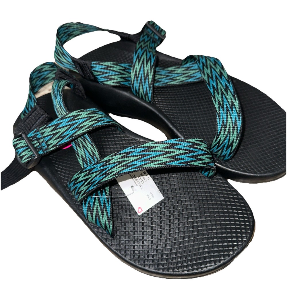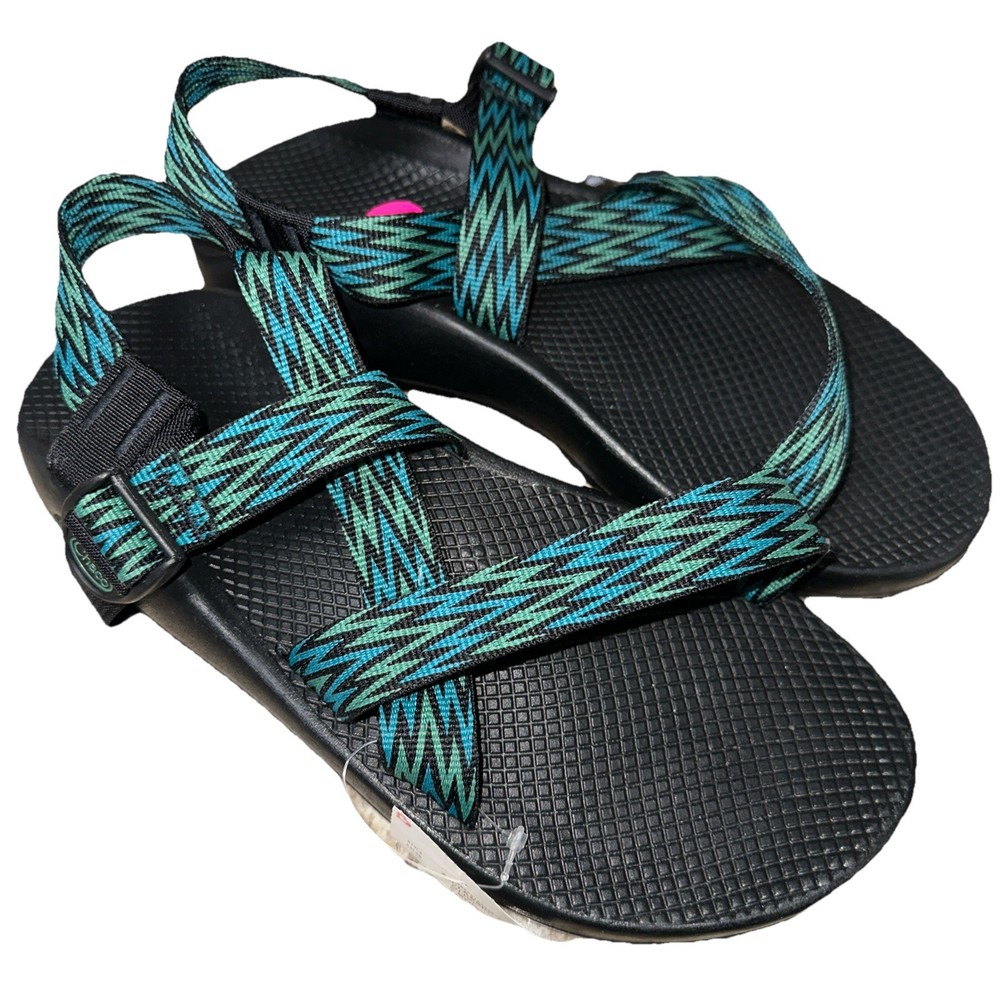 The Chaco JCH108685 Men's Strappy Green Black Blue Adjustable Hiking Sandals are a versatile and stylish option for outdoor activities and casual wear. Featuring a geometric blue pattern with the Chaco logo accent, these sandals are designed for comfort with arch support and an adjustable ankle strap. Made with a textile upper and a rubber outsole, they are perfect for summer, fall, and spring adventures. The strappy style and durable construction make these sandals a reliable choice for travel and active pursuits. Please check photos for more details. (Ref #14 green tub sandal /11)