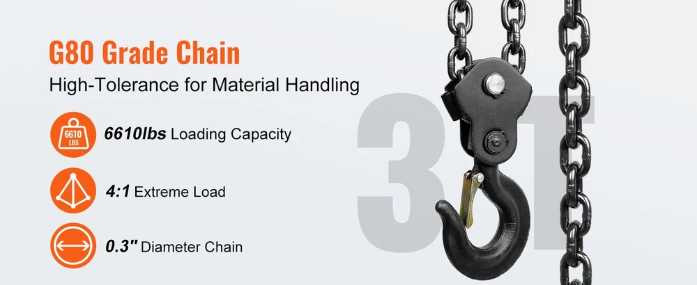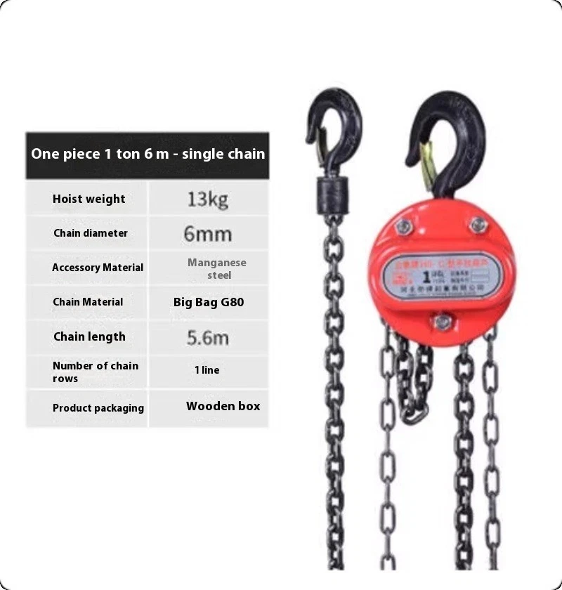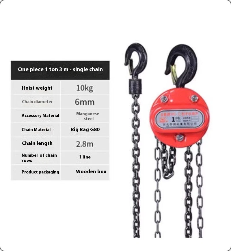 Chain Hoist Galvanized Carbon Steel with Double-Pawl Brake, Auto Chain Leading Single-chain hoist, 1 ton capacity, 3-meter chain Hoist weight: 10kg Chain diameter: 6mm Accessory material: Manganese steel Chain material: G80 high-strength steel Chain length: 2.8m Number of chain rows: 1 row