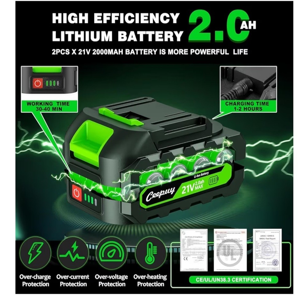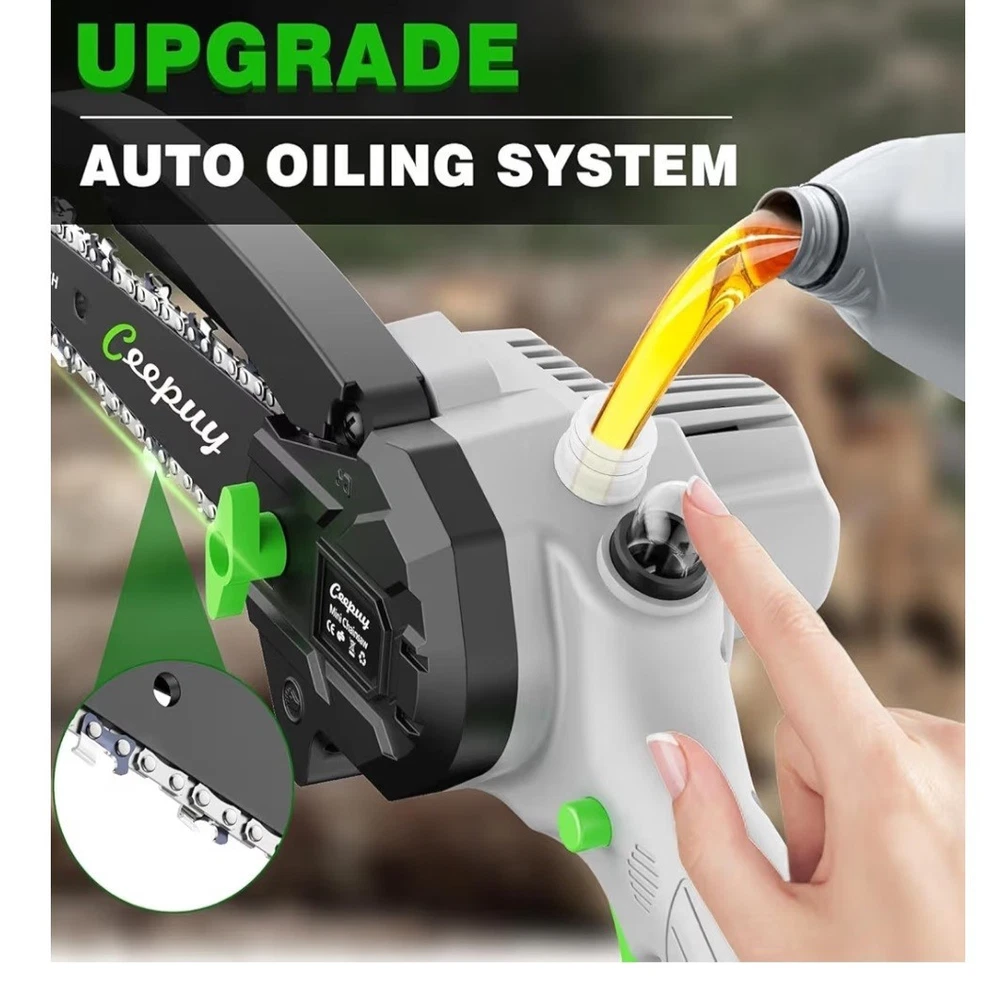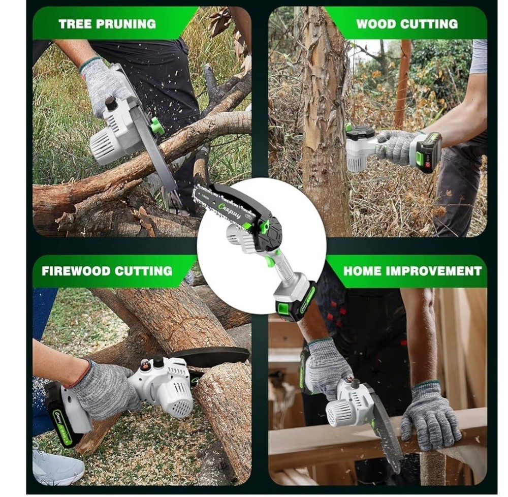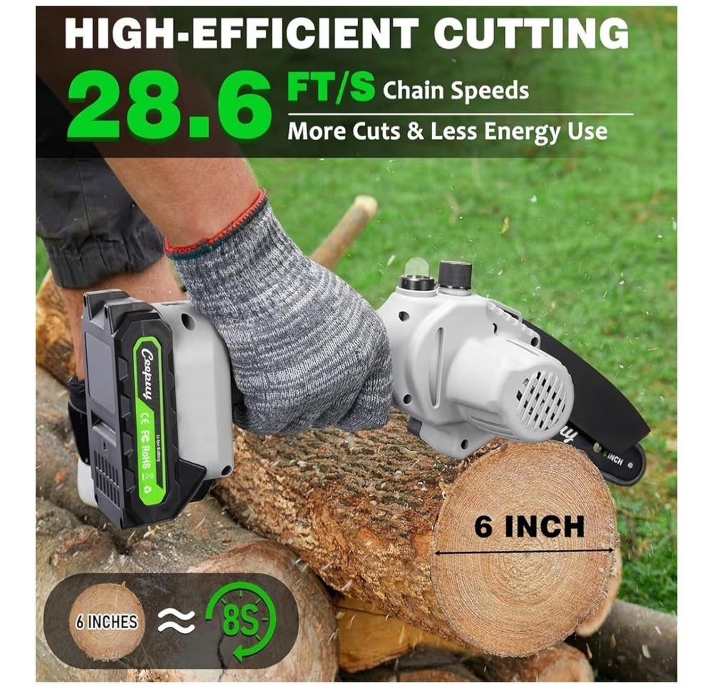 Power SourceBattery Powered Horsepower880 Item Weight0.9 Kilograms Product Dimensions7"L x 4.3"W x 13"H Chain Length6 Inches ✔【Upgraded High-Efficiency Pure Copper Super Motor】Ceepuy 6-inch cordless mini chainsaw boasts an 880-watt high-power motor. 28.6 FT/s high speed can efficiently cut a 6-inch diameter log in just 8 seconds, significantly reducing cutting time. Ideal for both home and work, it effortlessly fells common trees or large logs with ease and efficiency. ✔【Auto Oil Filling System】The Ceepuy mini cordless chainsaw features an Auto Oil Filling System, compatible with all brands of oil. Fill the tank with oil, and with a simple press, you can effortlessly lubricate the chain, This system not only reduces wear and tear for smoother cutting, but also increases the number of cuts with less energy use. A single oil fill lasts all day, eliminating the need to carry around a heavy bottle of lubricating oil! ✔【Lightweight,Portable & Female Friendly】The Ceepuy mini chainsaw is designed with a lightweight and portable slim body, making it easy to control with one hand and access to narrow areas. Its compact design is a great fit for the elderly and women. the fully charged battery ensures long-term use without causing strain on the wrist or arm. You can confidently trim those hard-to-reach branches from a ladder, enjoying a balanced and stable cutting experience without any wobbles. ✔【Rechargeable Large Capacity & Long Life Battery Pack】The Ceepuy mini electric chainsaw is equipped with 1pcs 21V 2000mAh high-energy lithium battery pack that's removable and rechargeable. The battery's overload protection and temperature control system are designed to maximize lifespan. They can be charged and work efficiently at any time, offering convenience and speed. ✔【5 Security & Safety Protection】1: It includes a safety lock button that requires simultaneous activation with the start button to prevent accidental operation. 2: A rotatable top protective baffle to minimize wood chip scattering. 3: Protective goggles are provided to shield your eyes from flying sawdust. 4: Anti-cut gloves are provided for hand protection. 5: an anti-slip rubber handle ensures maximum grip and comfort, enhancing control and safety during operation. 【What's in the box - Easy Install & Multiple Accessories】1 x Cordless Mini Chainsaw, 1 x 21V 2000mAh Batteries, 1x Quality Chains ( has been mounted on the chainsaw), 1 x Chain Guide Bar(has been mounted on the chainsaw)1 x Guide Plate Protection Case, 1 x Quick Charger (FCC Certified) , 1 x Screwdriver, 1 x Cleaning Brush, 1 x Safety Gloves, 1 x Goggles, 1 x Empty Oil Bottle, 1 x Instruction Manual-[Tips: 1. The product list includes small oil bottles, but does not include lubricating oil. 2. The product list only includes Black paper boxes and does not include black plastic boxes] Christmas gift Birthday Gift Newyear gift Thanksgiving gifts valentine gift