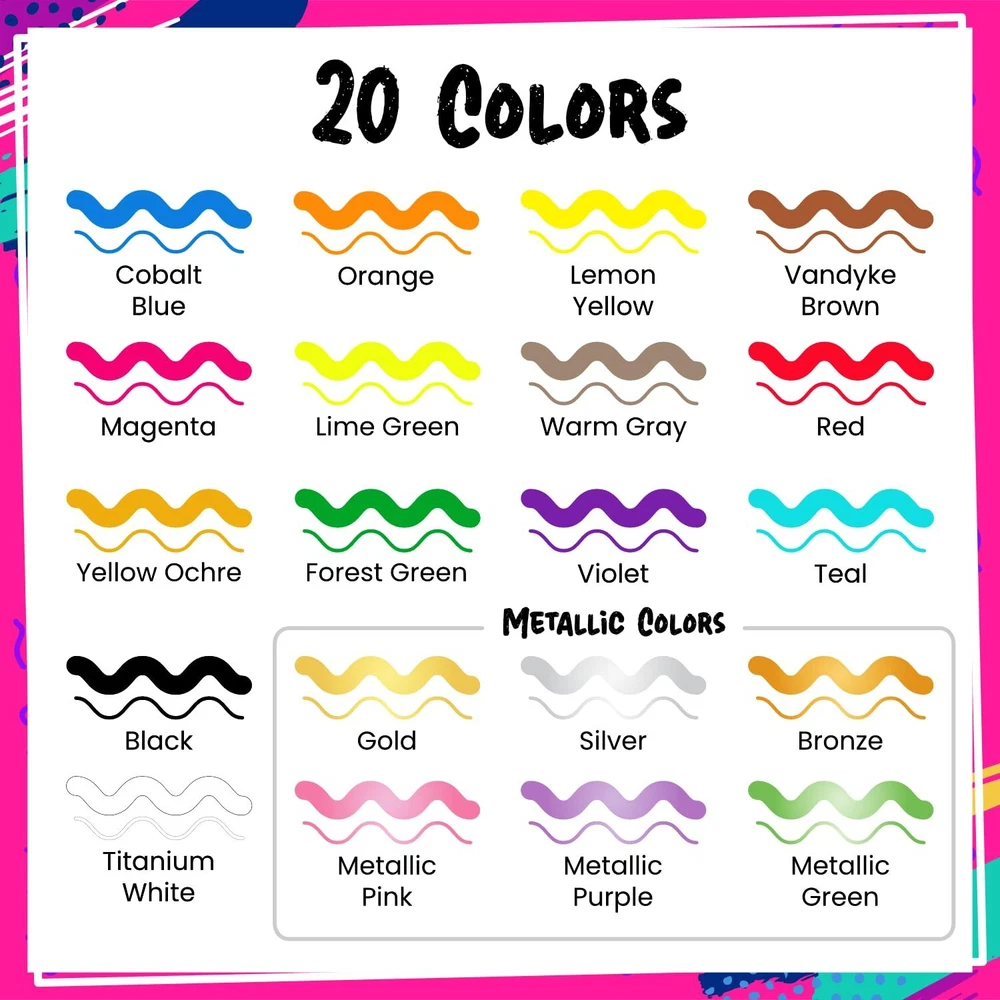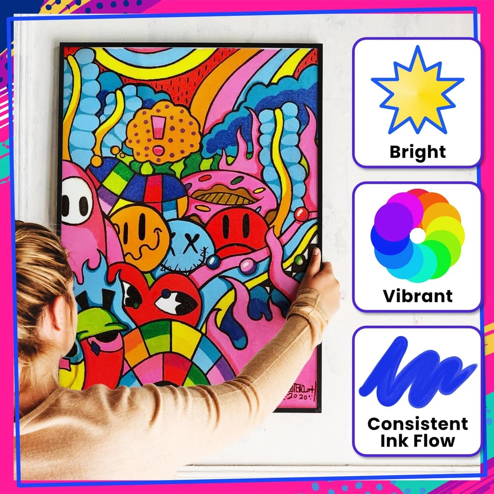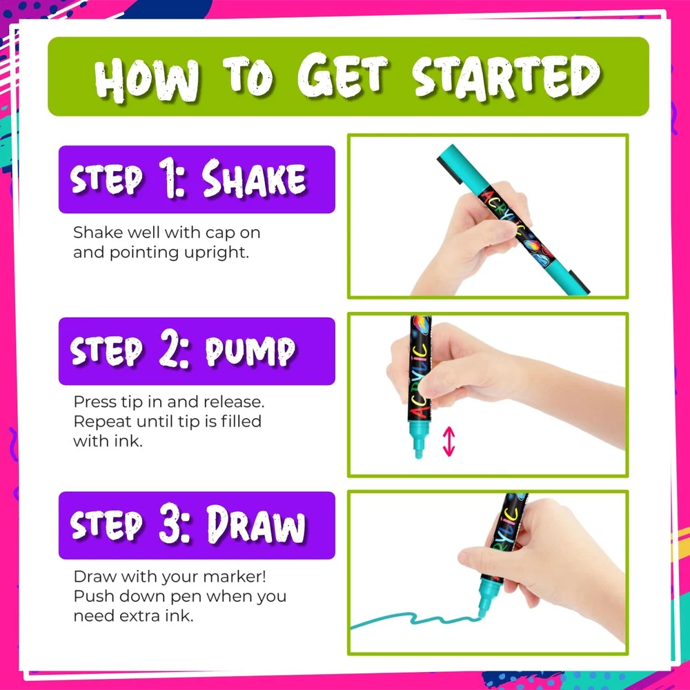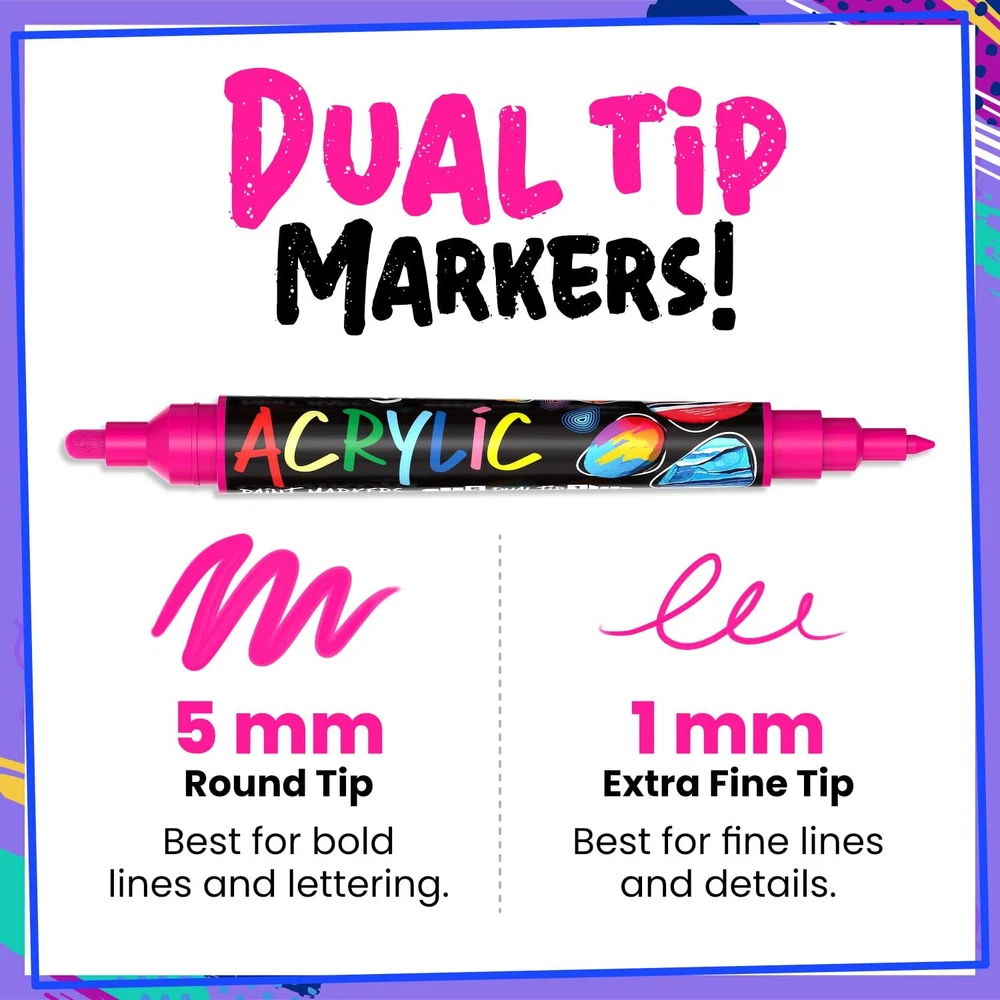 Dual Tip Acrylic Paint Pens Fine Tip - Highly pigmented, quick to dry & used as paint markers for canvas, paint pens for wood, or as glass paint markers, rock painting pens, on wine glasses & ceramic paint pens (dishwasher safe ink) Multiple Use Paint Pen - Get creative with DIY painting & crafts using these acrylic paint pens for canvas, fabric paint pens, metal, porcelain, plastic, stones, polymer clay, as paint markers for wood, paint markers for metal Water Based Fine Point Paint pens - Features smooth colors to produce true, consistent shades and are resistant to water, fading, and abrasion. Use these wood paint pens & rock painting markers to create personalised messages. Dual tip - Extra Fine Tip & Medium tip Paint Pens - The Easy-to-Use fine point is well-suited for precise work or hand lettering. These acrylic marker are perfect for both fine details and Medium Bold tip used for filling in large areas. Non-Toxic and Long Lasting Acrylic Pens - While other acrylic pen crack under heavy use, our richly pigmented acrylic paint marker pens set stays fray free. Chalkola pens conform to ASTM D-4236 and EN-71.