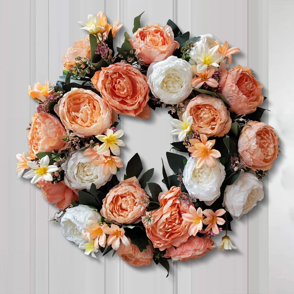 This wreath is absolutely stunning—the champagne gold roses add a touch of elegance, and the 20-inch size makes a perfect statement piece. The quality is fantastic, and it arrived well-packed. Just needed a little fluffing to look flawless. Love how it brightens up my door with a modern spring vibe! Would make a gorgeous gift.