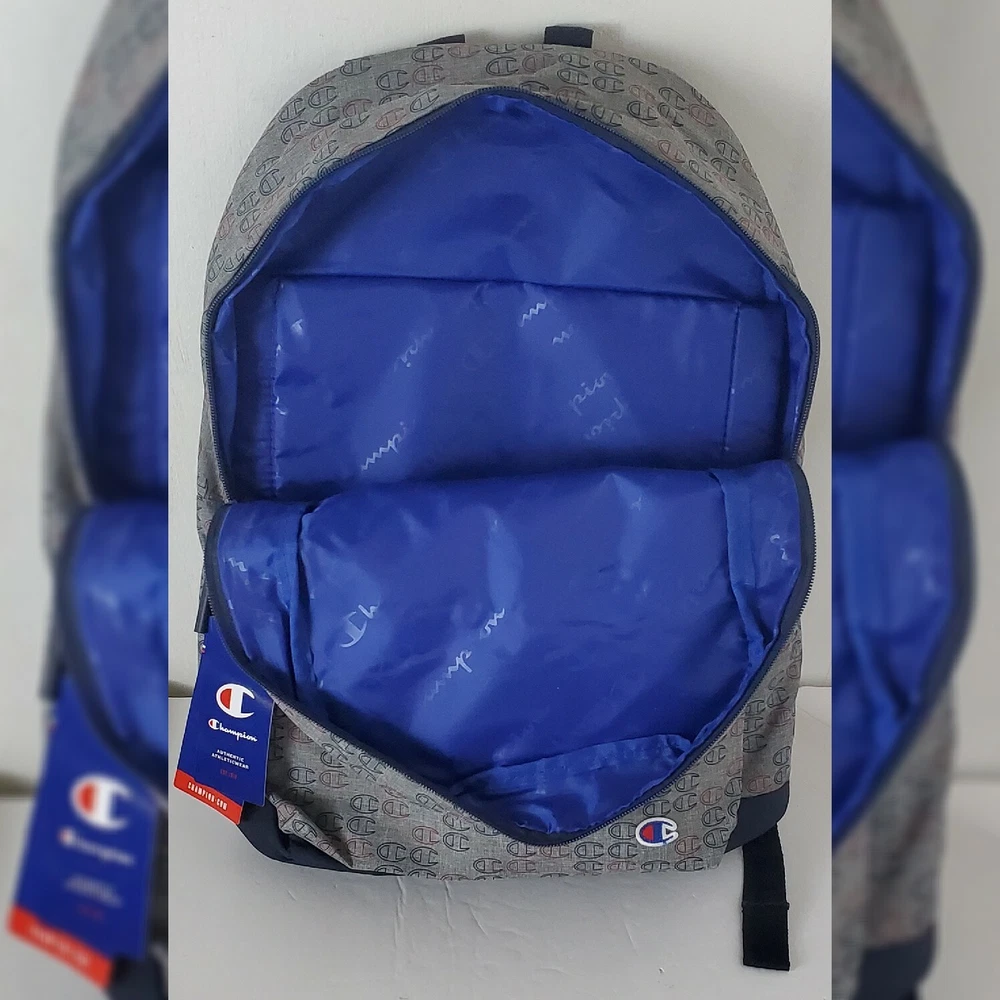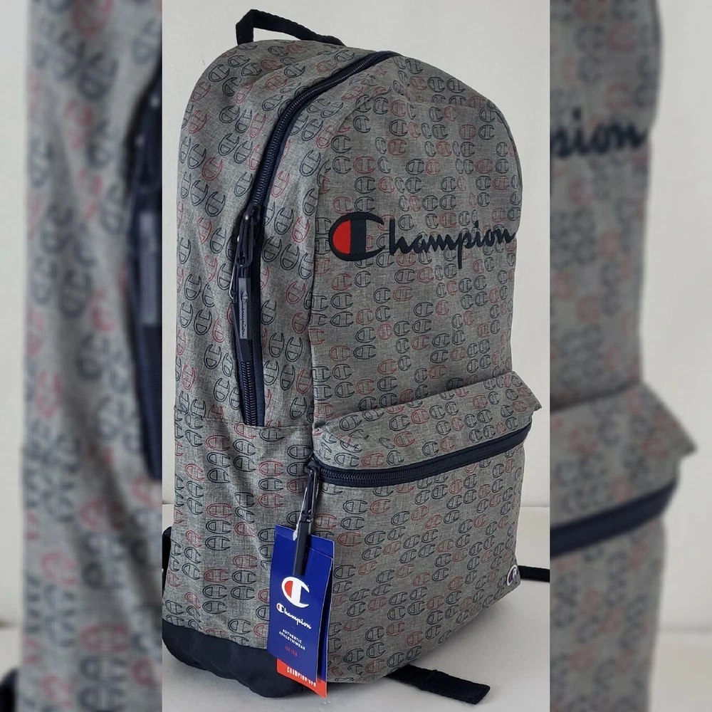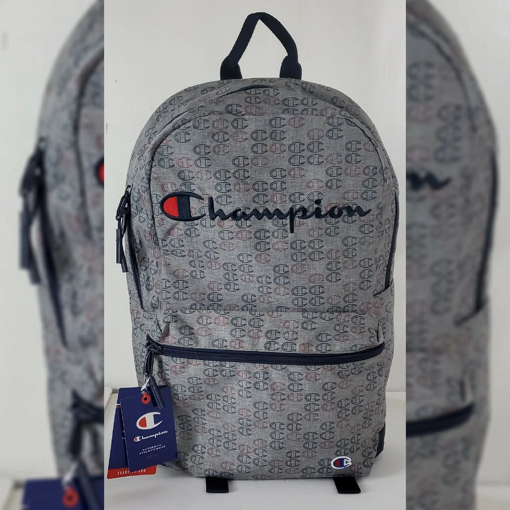 CHAMPION AUTHENTIC ATHLETICWEAR ASHER LOGO ALLOVER PRINT BACKPACK MEN'S.CONDITION IS NEW WITH TAGS. A logo print details this backpack with plenty of storage space. - Top handle - Dual adjustable shoulder straps - ULTIMATE DURABILITY PADDED LAPTOP SLEEVE EXTERIOR ZIP POCKET ORGANIZER POCKET WATER BOTTLE POCKET Approx. 18" H x 12" W x 6" D - Approx. 3" handle drop; 18" adjustable strap drop - Imported Textile exterior and lining