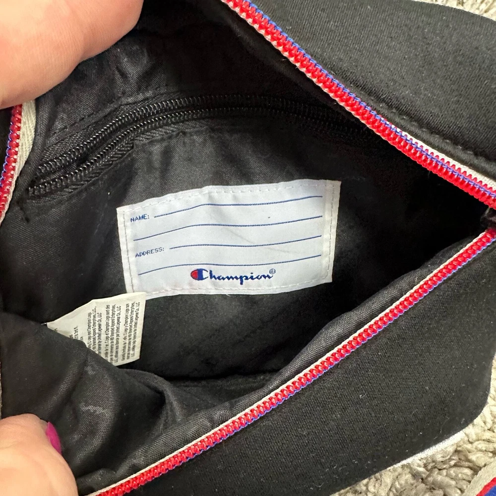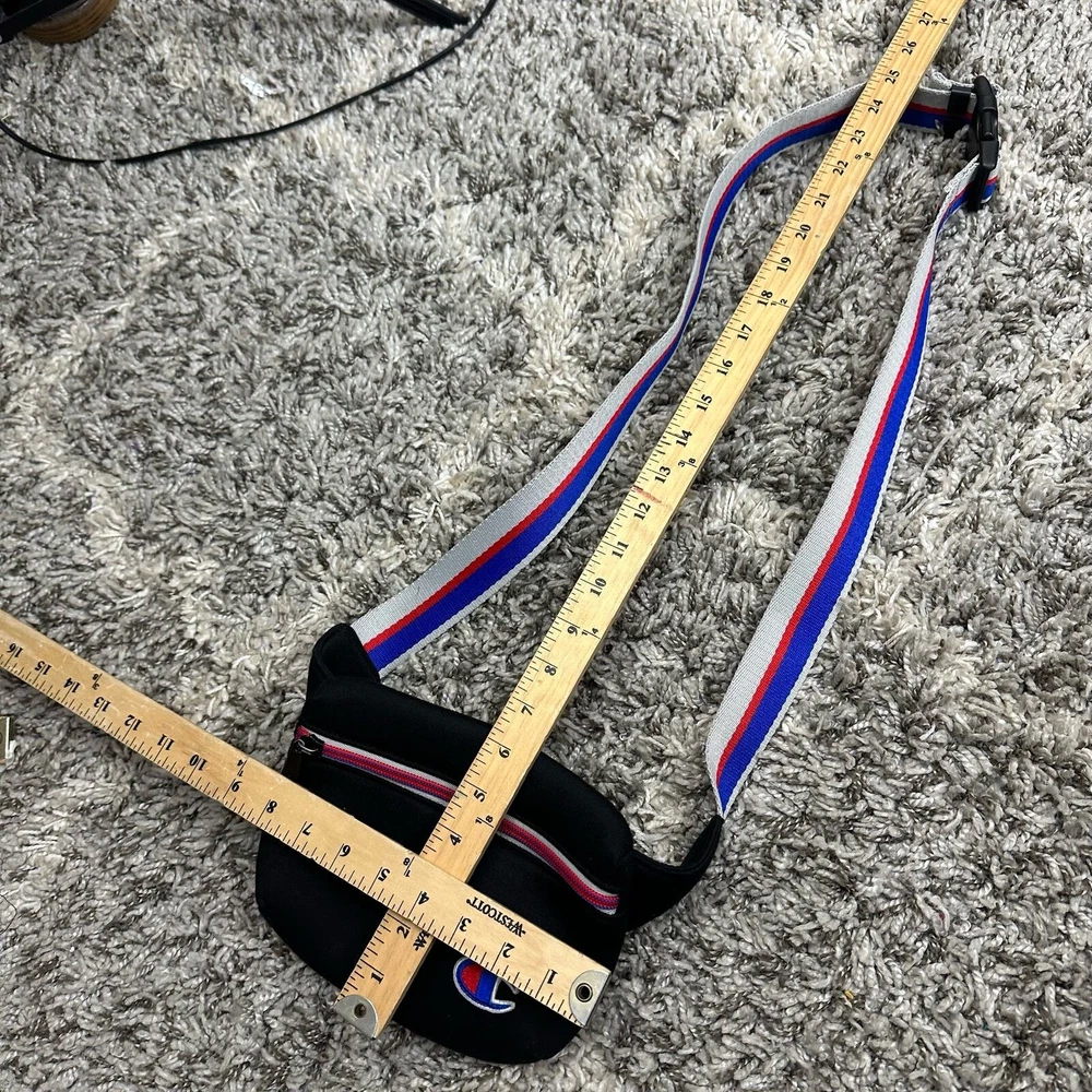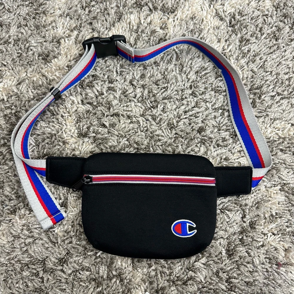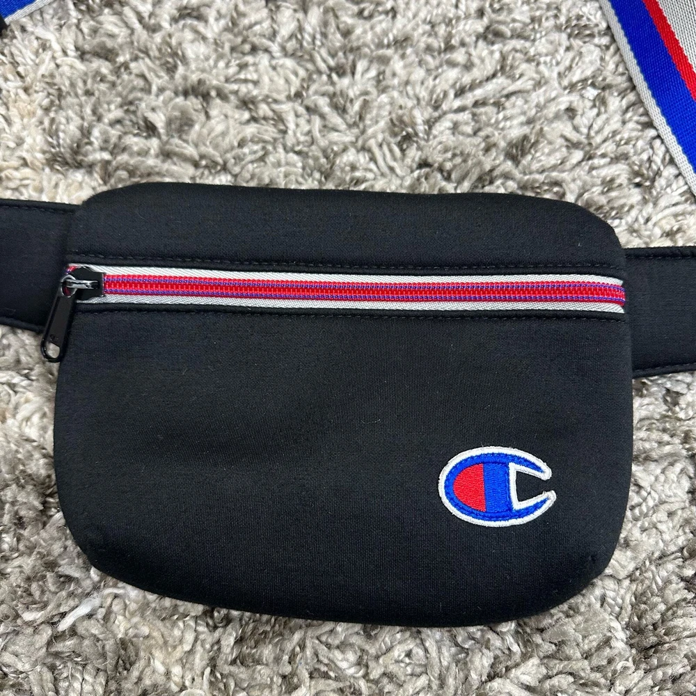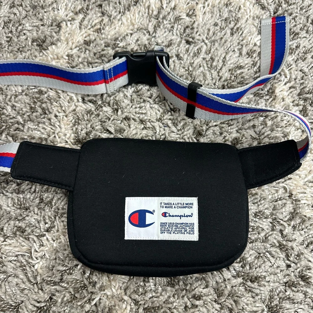 Champion Padded Black Belt Bag Stripe Strap Fanny Pack Crossbody Purse Wear as a fanny pack or a crossbody. Good condition, no flaws or major wear.