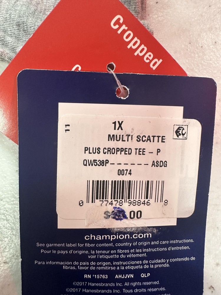 Champion Womens Plus Size 1X Gray Plus Cropped Scatter Logo Athletic Tee Top New with tags Brand new with original Champion retail hangtags attached. Fabric is clean and intact with no stains, holes, or pilling. Appears unworn and unwashed. Brand: Champion Style: Plus Cropped Tee P short sleeve cropped shirt with multi scatter logo print Color: Gray heather with multicolor Champion logos in an allover geometric scatter pattern Size: Womens 1X plus size Material: 90% cotton, 10% polyester jersey knit Details: Crew neck, short sleeves, cropped length, ribbed neckline, Authentic Athleticwear branding, Champion logo tape inside neckline Country of origin: Made in Honduras Style code: QW538PASDG, RN# 15763, UPC: 077478988468 Actual Measurements: Weight: 0 lb 4.2 oz Keywords: plus size crop top, casual athletic tee, logo graphic shirt, spring summer loungewear 26C0135_WTCK_FU_X