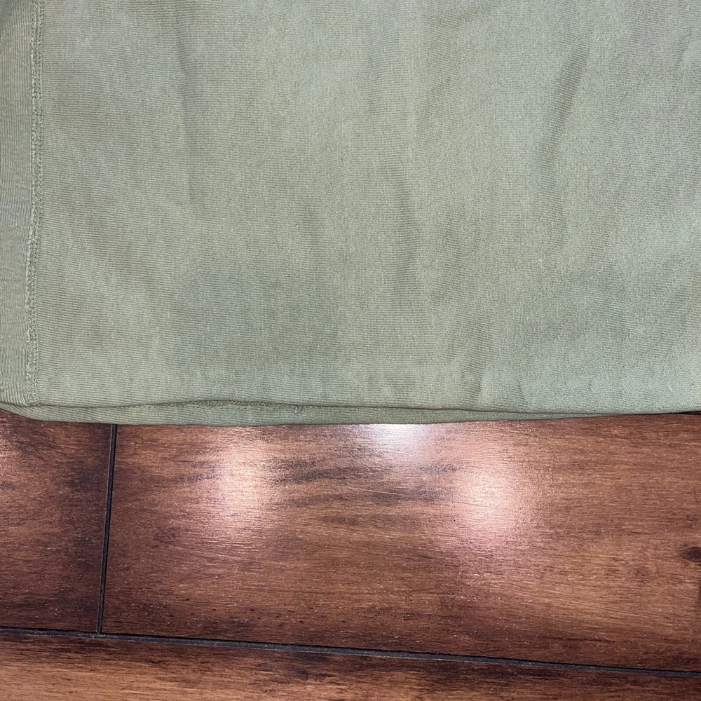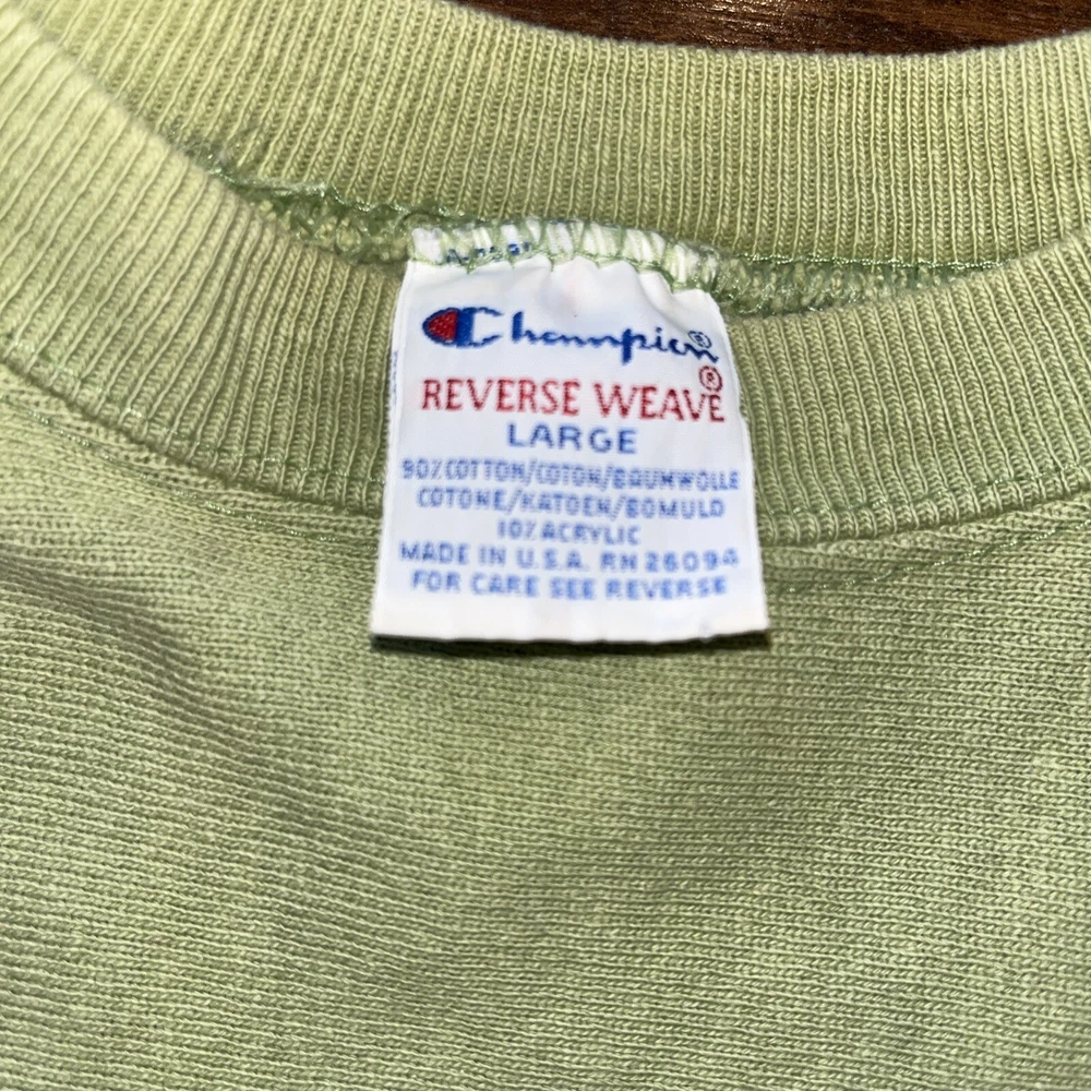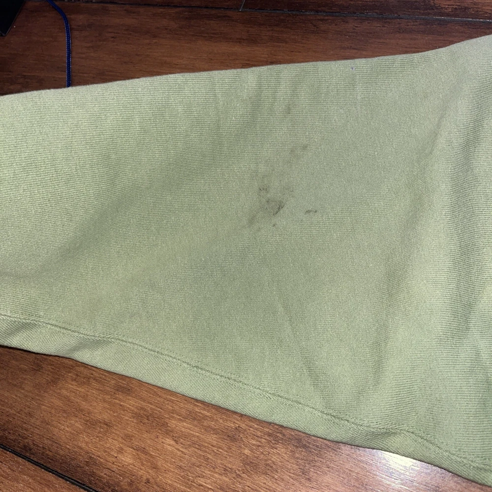This is a women's casual Champion Reverse Weave sweatshirt in size large. It is a vintage piece made in the USA, featuring a reversible design in green color. The sweatshirt is part of the Champion Reverse Weave product line, perfect for activewear and showcasing a USA theme. This sweatshirt was cut on the bottom and sewn as shown in the picture. There was also a small stain on the right arm as shown in the picture. This is a vintage piece from the 80s.