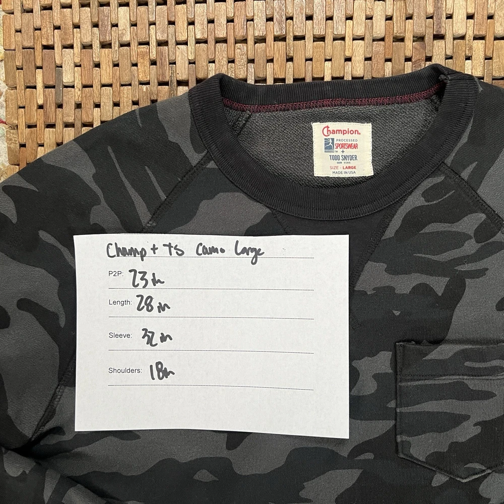 Elevate your activewear wardrobe with this Champion x Todd Snyder sweater. The black camo design is perfect for any sports enthusiast, and the long sleeves and crew neck make it suitable for all seasons. The sweatshirt features the Champion logo as an accent, adding a touch of style to your outfit. Crafted from comfortable cotton terry fabric, this regular-fit sweatshirt is perfect for a day out or a casual evening at home. It comes with pockets for convenience and is available in size L. Ideal for winter, fall, and spring, this Champion x Todd Snyder sweater is a must-have addition to your wardrobe.