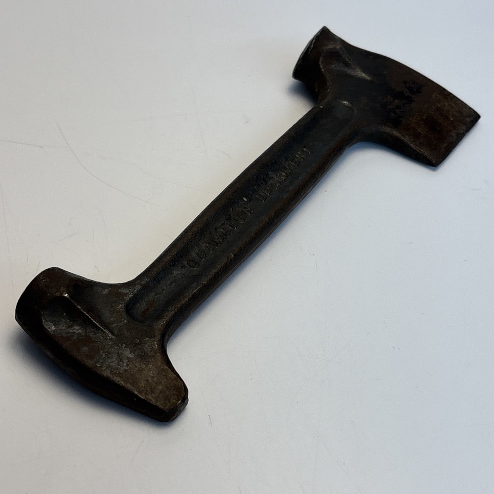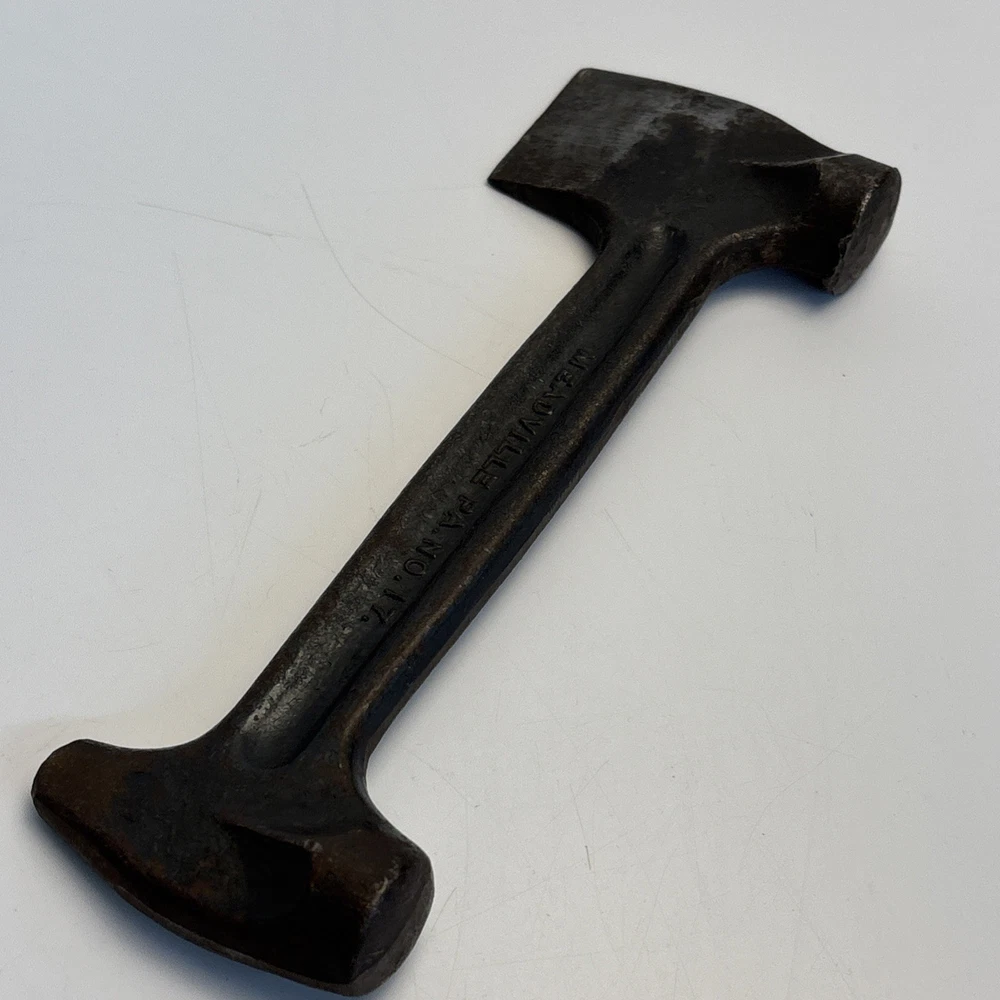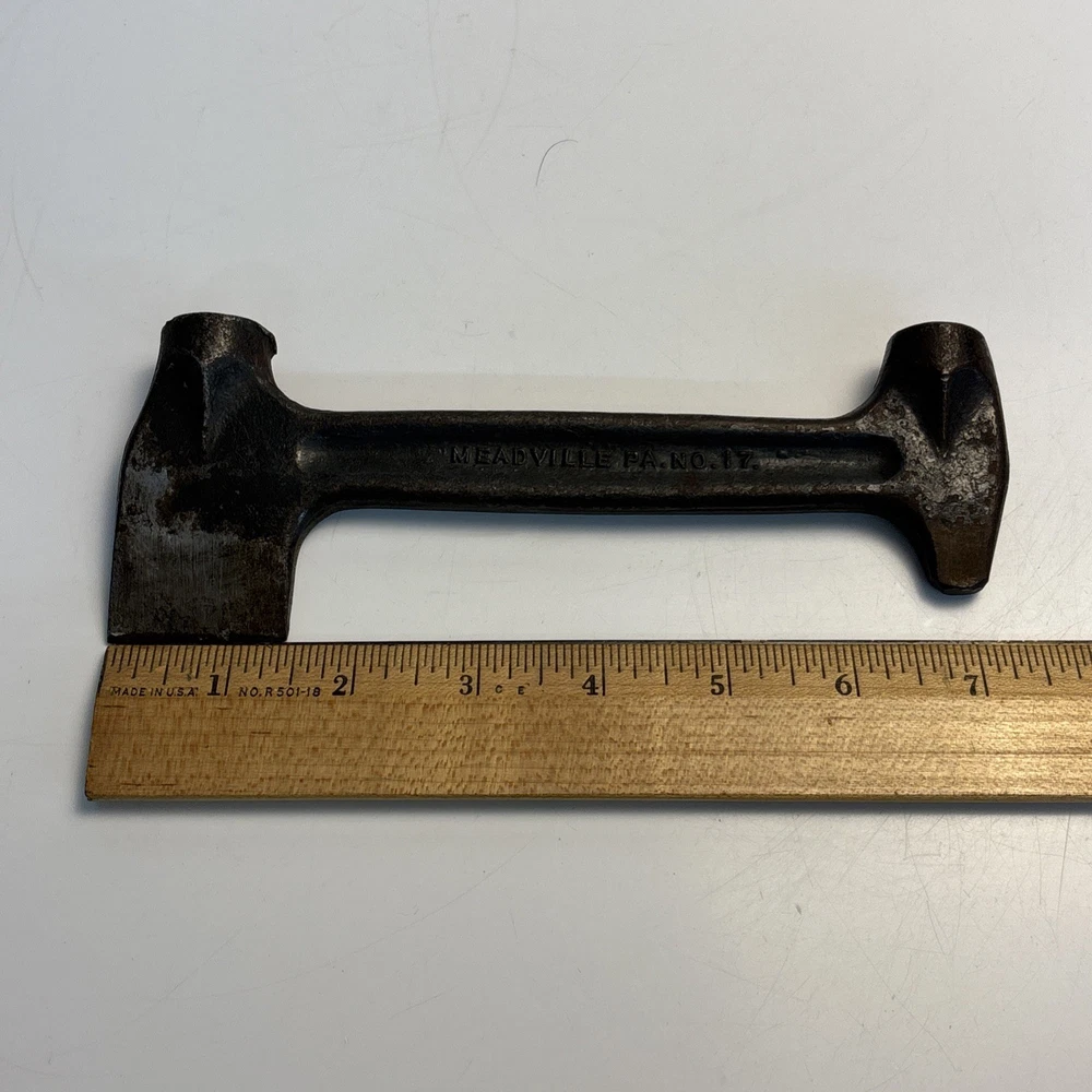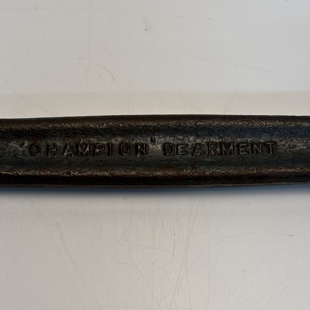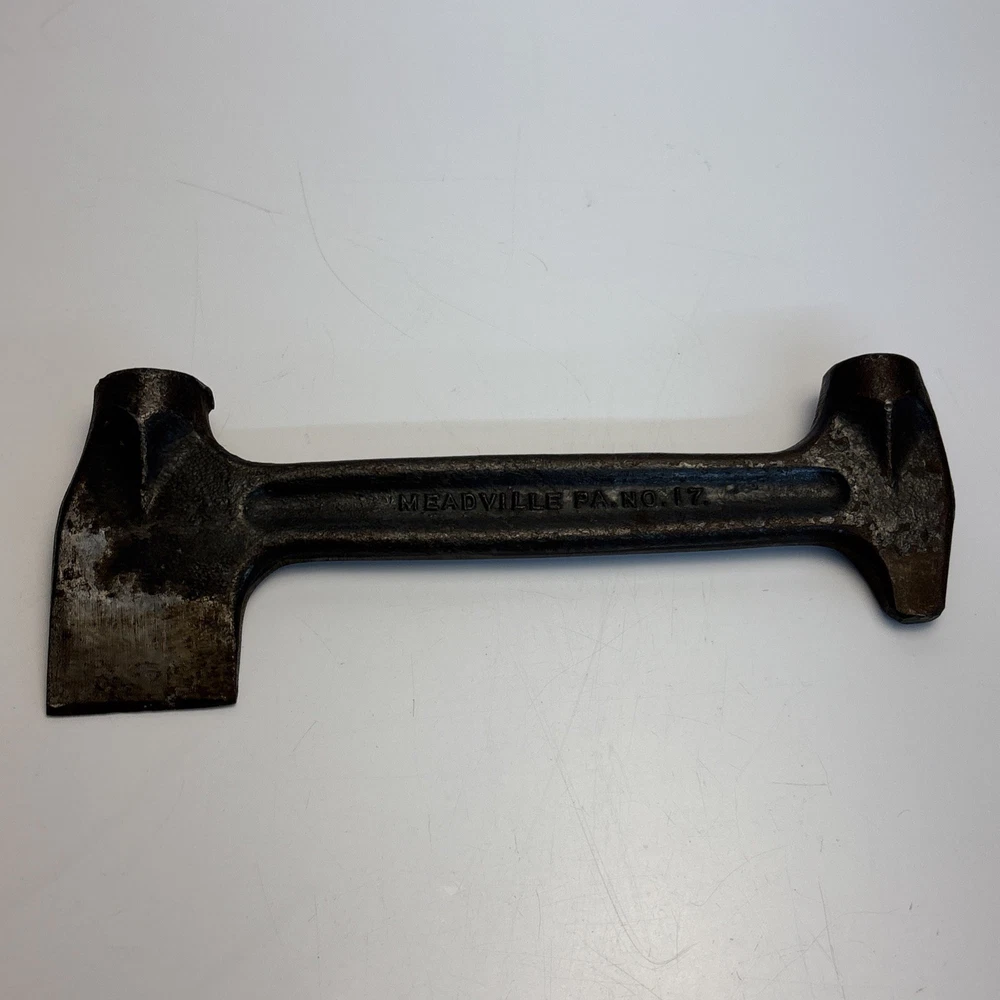 Vintage Champion-DeArment No. 17 combination crate and nail clinching tool made in Meadville, Pennsylvania, USA. One-piece forged steel construction with integral handle between both working ends. One end features an approximately 1½ inch wide chisel/axe-style cutting blade with opposing hammer face. The opposite end includes a larger hammer face with a smaller opposing striking surface. Designed for crate opening, nail driving, and nail clinching in warehouse and packing applications. Clearly marked “Champion-DeArment” and “No. 17.” See photos for full details and measurements. Condition Used vintage condition with surface rust, oxidation, and wear from age and use. Cutting edge shows wear but no cracks observed. Hammer faces show typical striking marks. Structurally solid. See photos for complete condition details.