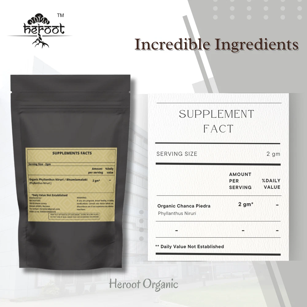 Heroot Organic Chanca Piedra Powder Heroot Chanca piedra is used for various disorders of the urinary tract including infections, pain and swelling (inflammation), kidney stones, and discharge from the urethra or vagina. It is also used for digestive tract disorders including gas, loss of appetite, stomachache, intestinal infections, constipation, and dysentery . Key Ingredients: Organic Chanca Piedra Powder Key Benefits: Increasing urine output. Intestinal gas. Increasing appetite. Use as a liver tonic and blood purifier. Diabetes. tomachache. Indigestion. Intestinal infections. Constipation. Dysentery. Flu. Yellowing of the skin (jaundice). Abdominal tumors. Fever. Pain. Directions For Use: Consume 300mg with lukewarm water after a meal Or as directed by your healthcare provider How To Consume: Can be mixed with warm milk & honey Can be taken with juices & smoothies Can be taken directly with honey Can be filled in capsule and consumed with water Safety Information: Store in a cool dry place Keep out of reach of children If you are pregnant or lactating or prone to any food allergy or under any medical condition consult your healthcare practitioner before use Disclaimer The above description is for information and knowledge purpose, not a healthcare professional advice. Please consult your doctor and/or pharmacist before you take this vitamin. Pregnant or lactating women, diabetics, hypoglycemics, and people with known medical conditions and/or taking drugs, should consult with a licensed physician and/or pharmacist prior to starting any supplementation program. The above statements have not been evaluated by the Food & Drug Administration. Shipping and Handling Shipping time will be 1 business day after the cleared payment We will ship by Indian Post service Shipment will take 15-30 days. Few more days for your local customs delay and formalities. For Express service additional charges will be applied. For any reason you wish to leave Negative or neutral feedback, Please contact us first and let us mutually resolve it. We care for your satisfaction and will make sure that you are happy with the transaction to post us 5**** ratings in all areas. ***Customs Information*** Heroot will not be liable for packages refused or held by customs for delivery. We request that you contact customs office and ask about import regulations and restrictions before placing your order. It is importsnt for you to become familiar with customs policies for your specific country before ordering. Customs regulations differ by country and not knowing their regulations can result in your order incurring high import duties, the delivery being delayed or even returned. Please check with your customs office to see if your country permits the shipment of the products you are planning to order from us and if any additional licenses or permits are needed. Please note: if your order is returned to us due to banned/ restricted products policy, a wrong address, refusal to pay customs fees, refusal to accept the order or because no one was there to accept the delivery of your order, we will refund your order as follow: you will be refunded the total amount of the order, minus the original shipping charge.