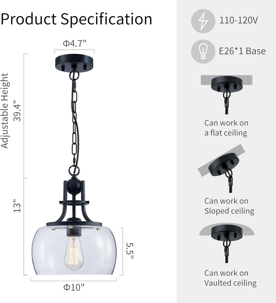 Store New Arrivals Add to Favorite View Feedback Contact Chandelier Rustic Farmhouse Industrial round Ceiling Pendant LED Light Fixture with Clear Glass Shades for Dining Room Kitchen Island Foyer Entryway, H 13" X W 10", E26 Base, Black Description Item model number USHD30304 Light Source Type all light souces with E26 socket is compatible Style Industrial Number of Items 1 Power Source AC Number of Light Sources 1 Control Method Remote Embellishment Crystal Batteries Included? No Lighting Method LED Controller Type Push Button Unit Count 1.0 Count Room Type Dinning Room, Kitchen Island, Hallway, Foyer, Enterway, Living Room, Bedroom, Office Assembly Required Yes Product Dimensions 10"L x 10"W x 13"H Material Glass, Metal Model Name USHD30304 Specific Uses For Product Indoor use only Included Components Mounting Hardware Indoor/Outdoor Usage Indoor Bulb Base E26 Light Color warm white Batteries Required? No Item Weight 5.26 pounds Light fixture form Chandelier Special Features Dimmable Special Feature Dimmable Part Number USHD30304 Shade Color Clear Mounting Type Ceiling Mount Color Ceiling Light, Black, 10" Wide Wattage 60 watts Shape Round Voltage 2.4E+2 Volts Shade Material Glass Fixture Type Non Removable Chandelier Size: 13" High and 10" wide, shade 5.7" high. Canopy 4.7 inches wide. Chain: 39.4 inches high(max). Bulb Socket Base: E26, 120V 60watts(Max). Package includes one non-dimmable Edison filament LED bulb. The light fixture is fully dimmable if you use a dimmable bulb instead with compatible dimmer switches. Design: This rustic farmhouse Wuzups pendant chandelier light with design offers a modern interpretation of a classic urban-industrial style, which adds a vintage flair to your space. It comes in a matte black finish and features a prominent round clear glass shade. The mouth-blown glass has a few pinprick bubbles that add to the vintage look and feel. Easy Installation: Assembly required and easy to install, hang and change bulb, with all mounting hardware and a detailed mounting instruction included. Widely Use: Dining Room, Kitchen Island, Hallway, Foyer, Enterway, Living Room, Porch, Hotel, Staircase, Bedroom, Office and etc. Product Description 1 Entry & Corridor 2 Kitchen Island 3 Dining Room 4 Kitchen Island ABOUT US We offer the best prices around on high quality products. Our E-store includes media such as books, movies, music and games while offering electronics, toys, sporting apparel, clothing, tools, general home, garden items and more. SHIPPING We are always working hard to ensure your package arrives as soon as possible. Please understand that some factors like weather, high postal traffic, and the performance of shipping companies are outside of our control. We offer free shipping to the lower 48 states and ship within 2 business days of payment, usually sooner. We do not accept P.O. Boxes. Please provide a physical address. For shipping outside of the continental USA, we only use eBay's Global Shipping Program.The item is shipped to KY and then sent to the rest of the world. International customers are responsible for all duties and taxes. Continue to check out in order to calculate costs for shipping the item to your country. Messages regarding eBay's Global Shipping Program MUST be directed at eBay EXCLUSIVELY. RETURNS We offer a 30-Day Return Policy on items which you are not completely satisfied with. You have the option for a full-refund or an exchange of the item. No returns are available on items shipped outside of the USA. PAYMENT We accept PayPal. CONTACT US This page content is yet to come Please ad us to your favorite seller and visit again later Thank You CUSTOMER SATISFACTION We try our very best to make sure every customer is completely satisfied. If there's a problem, message us! We're happy to help. WE ACCEPT Copyright © 2021 AutoDS. | All Rights Reserved
