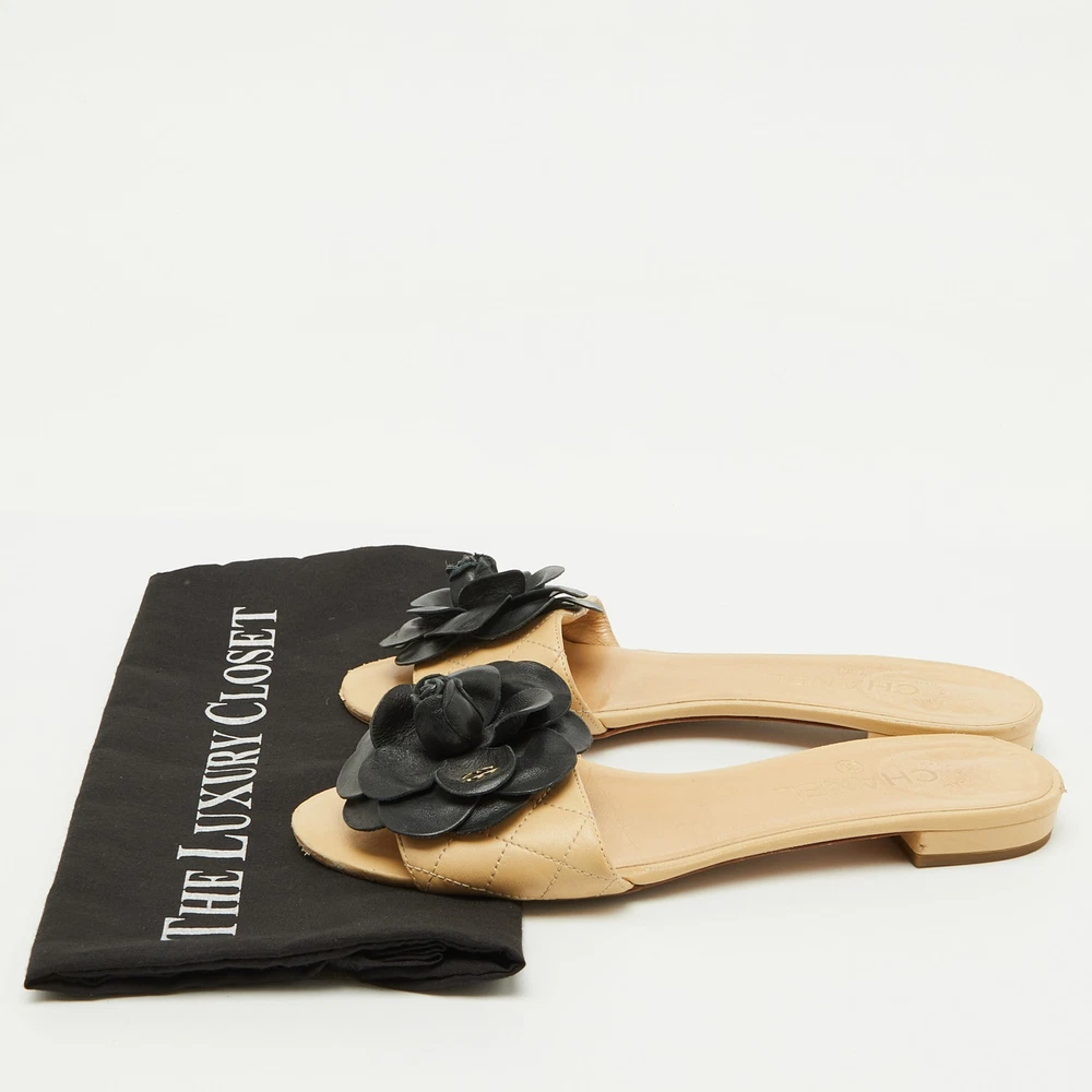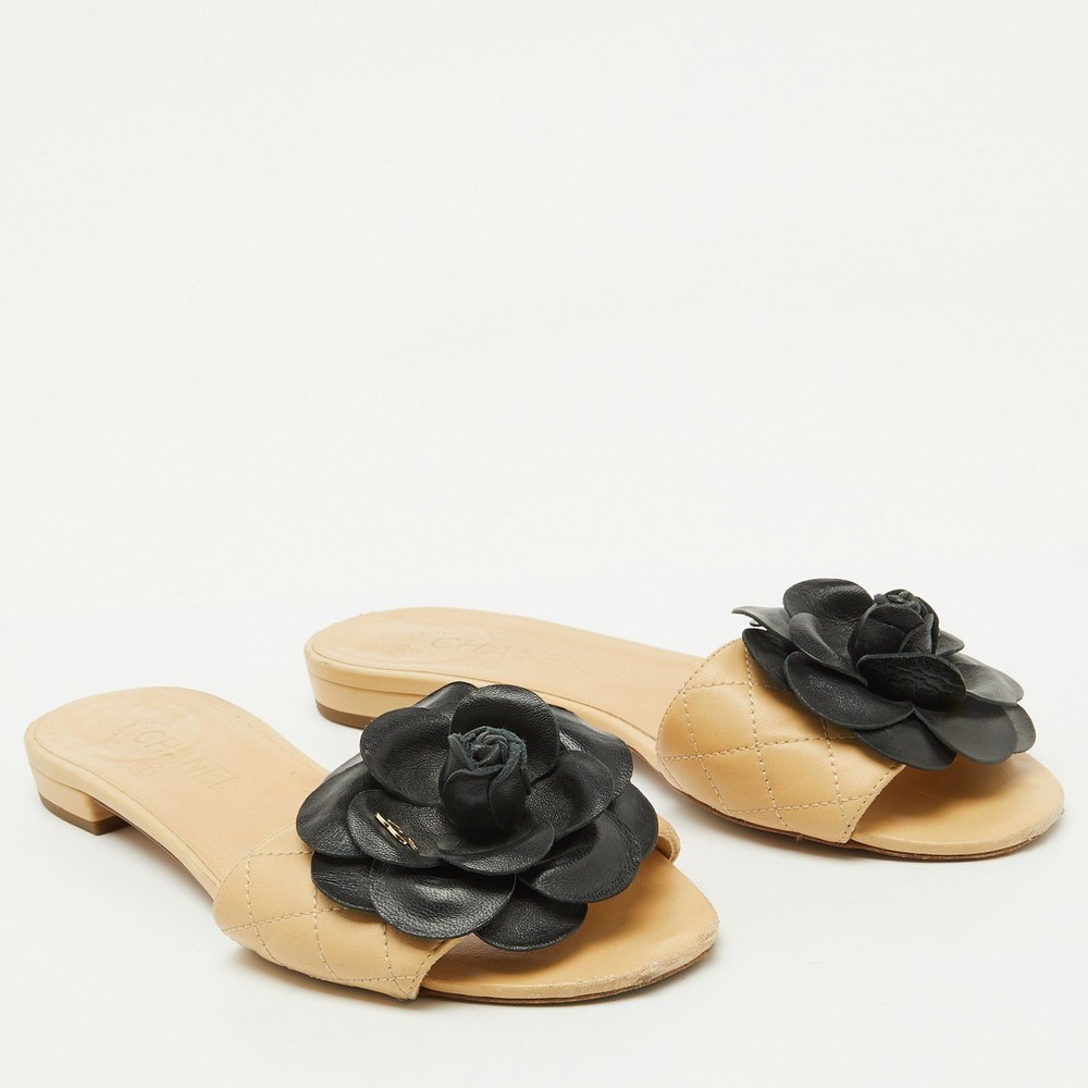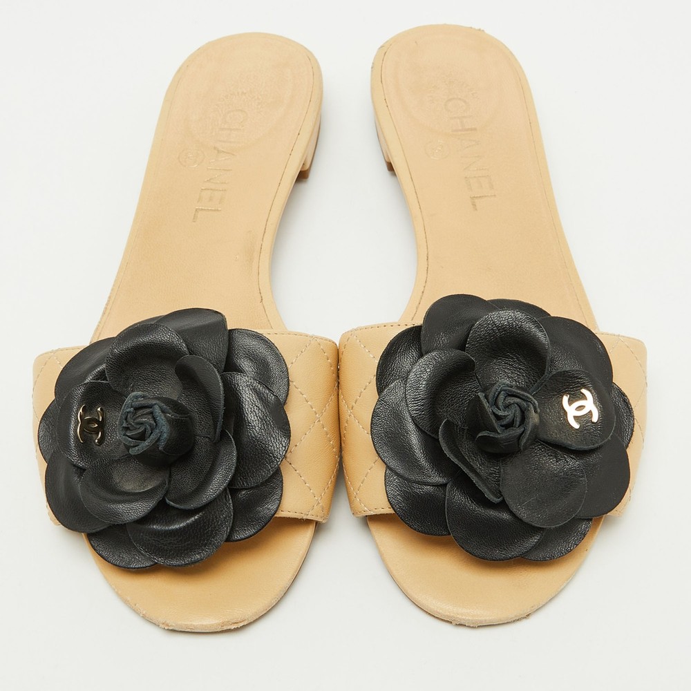 These gorgeous slides from Chanel will be your latest favorite purchase. They are made from beige quilted leather, with a contrasting Camellia motif embellishing the front. They come with comfortable leather lined insoles and gold toned hardware. Their easy slip on style and relaxing silhouette make these slides great for everyday use.Certified by The Luxury Closet - This item has gone through a detailed authentication process overseen by our experts. We offer a lifetime guarantee of authenticity on all our items. Import duties, taxes and charges are not included in the item price. These charges are the buyers responsibility. Please check with your country’s customs office to determine what these additional cost will be prior to buying. Our eBay Store About Us Contact Us Add to Favorite Sellers Chanel Beige Leather CC Camellia Flat Slide Sandals Size 39 $698.5 These gorgeous slides from Chanel will be your latest favorite purchase. They are made from beige quilted leather, with a contrasting Camellia motif embellishing the front. They come with comfortable leather lined insoles and gold toned hardware. Their easy slip on style and relaxing silhouette make these slides great for everyday use. Product Details Brand Color Beige Dimensions Material Leather Size 39 Outsole Width 8.5 cm Outsole Length 25 cm Heel Height Includes The Luxury Closet Packaging Certified by The Luxury Closet This item has gone through a detailed authentication process overseen by our experts. We offer a lifetime guarantee of authenticity on all our items. How We Check The in-house team of experts at The Luxury Closet is highly trained to verify the authenticity and the condition of the luxury products. They ensure that only 100% authentic items are put on sale.The evaluation process is unique with its own mix of assessment criteria and differs according to the category. Each item is evaluated based on the following combination of hallmarks, hardware, stitching, symmetry, material, craftsmanship, stamping, codes, hologram stickers, and packaging. Our authenticators also check if the items have been modified or amended (e.g., aftermarket diamonds, replaced batteries, repaired bags, etc.) International Buyers Import duties, taxes and charges are not included in the item price. These charges are the buyers responsibility. Please check with your country’s customs office to determine what these additional cost will be prior to buying.